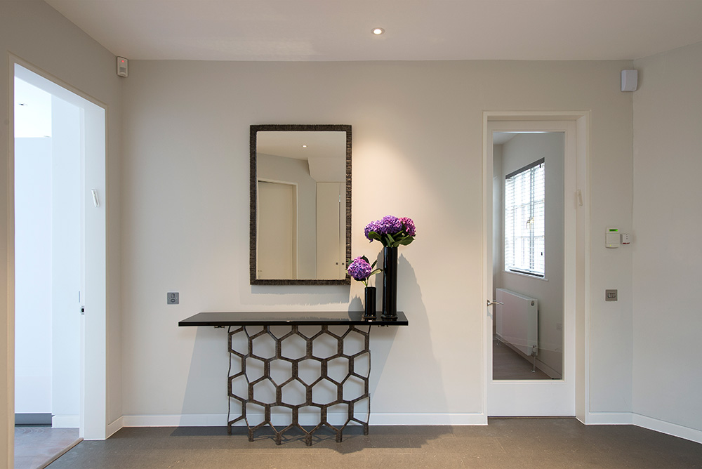 We created a contemporary look with a very neutral colour palette of predominantly grey with an abundance of luxurious metals, textures and natural materials and we furnished the property throughout with bespoke furniture, rugs and carefully sourced accessories and soft furnishings. Statement lighting in the entrance hall, family room and master bedroom.