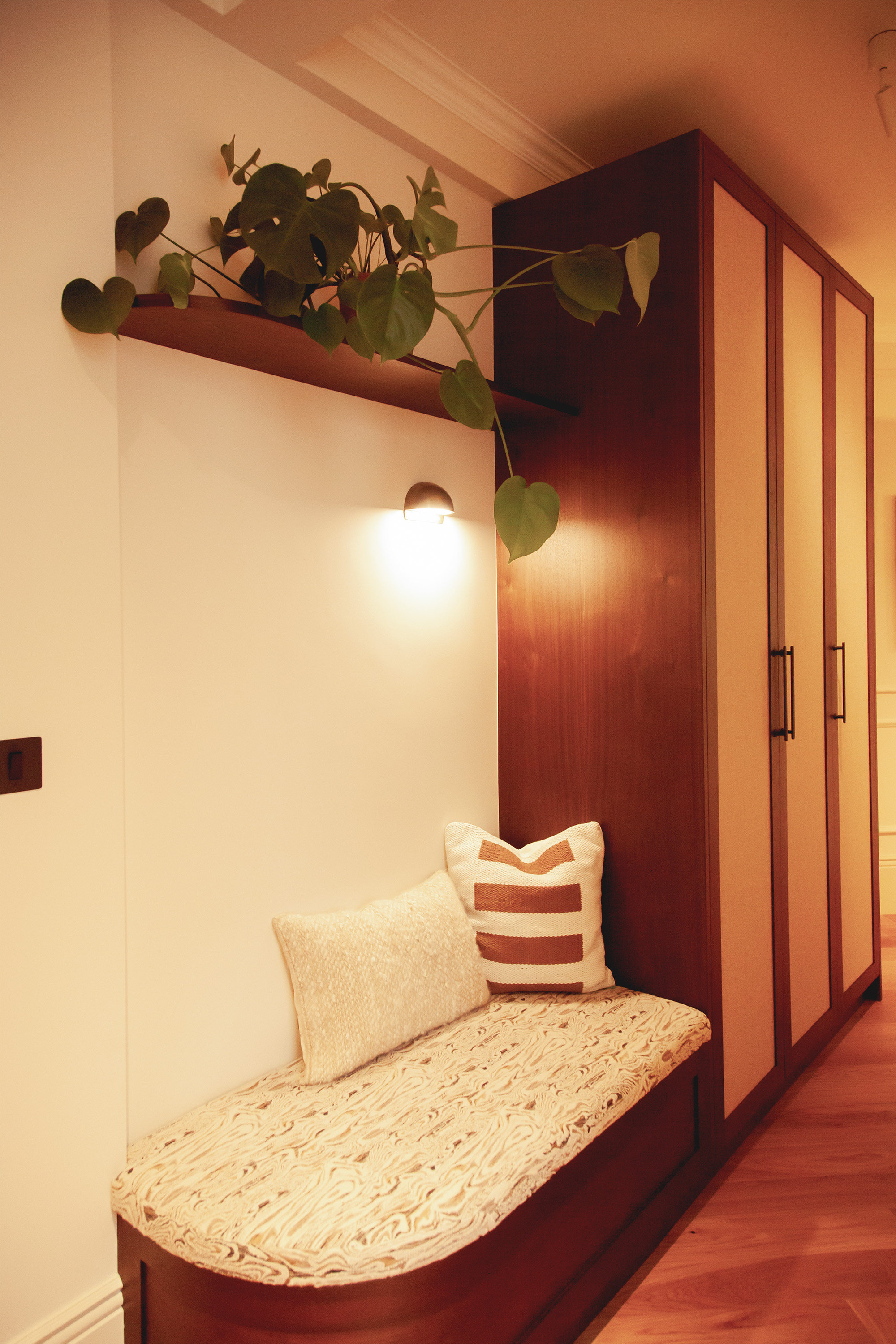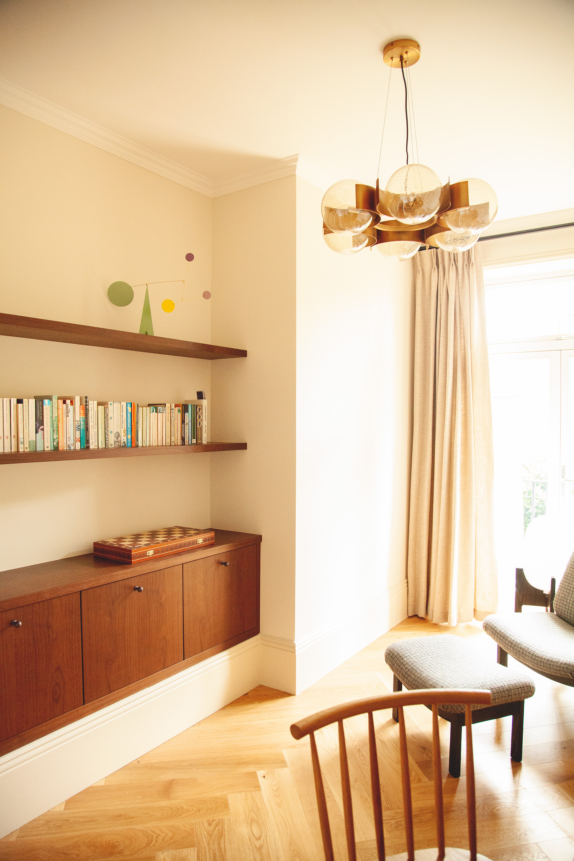 We designed bespoke, hand-crafted joinery. New panelling was added to the hallway and bathroom, and cornices were installed.