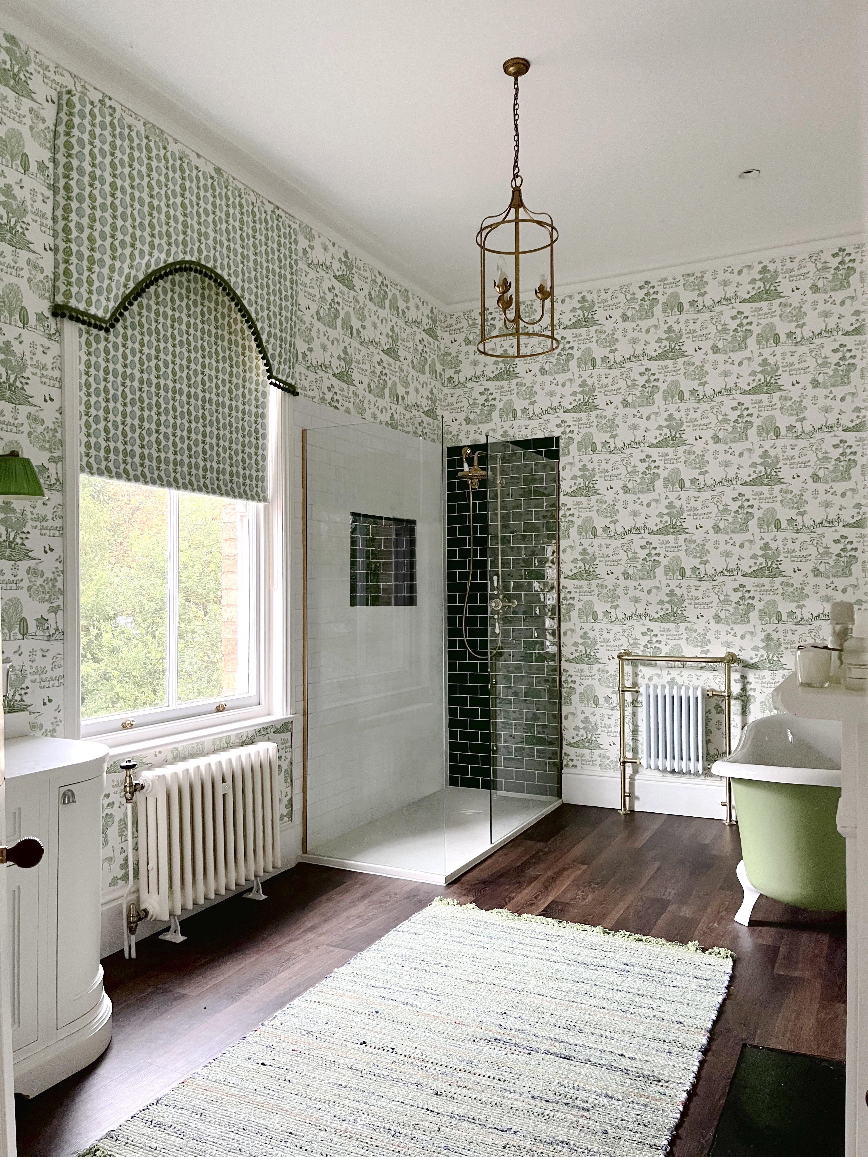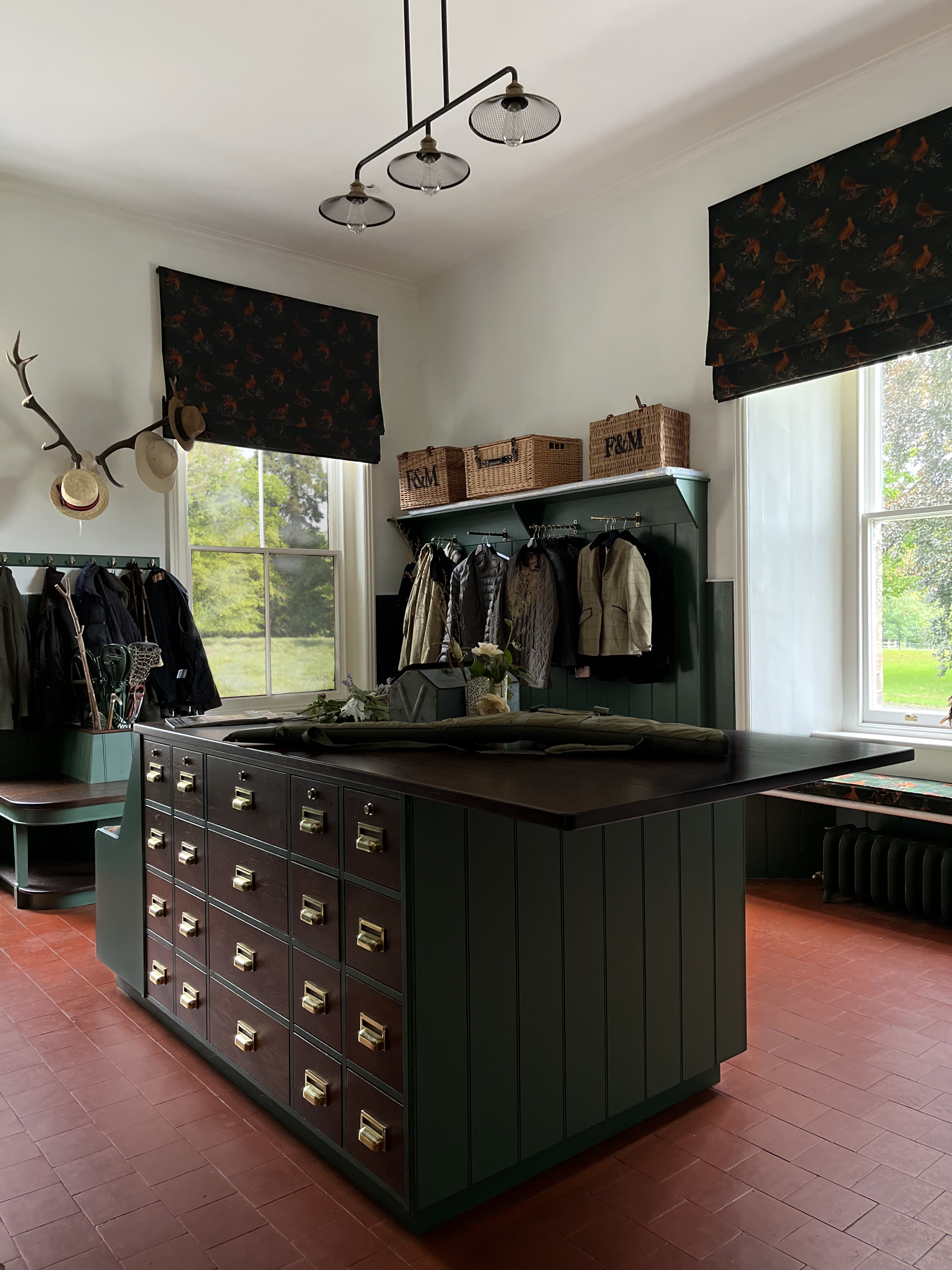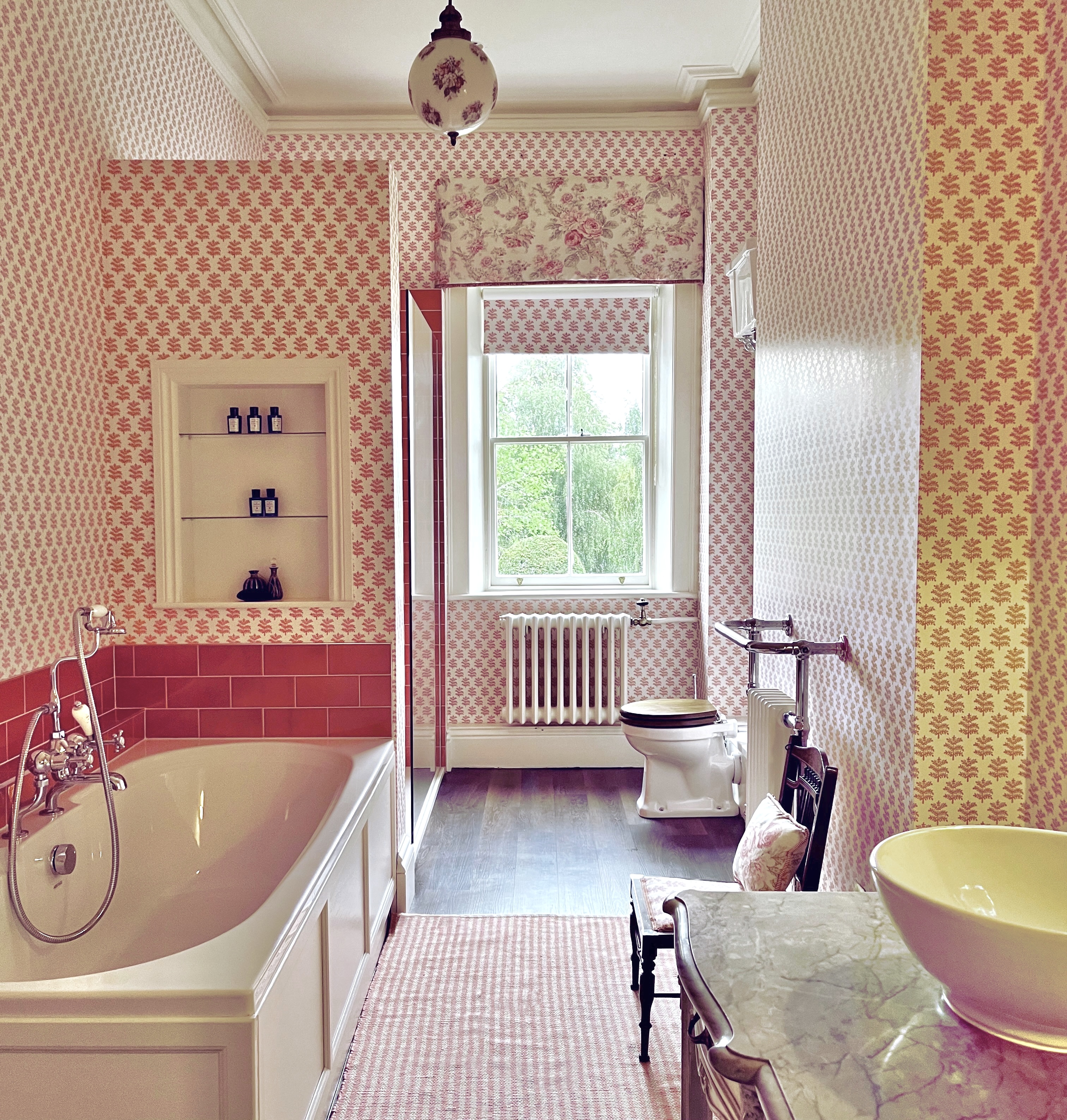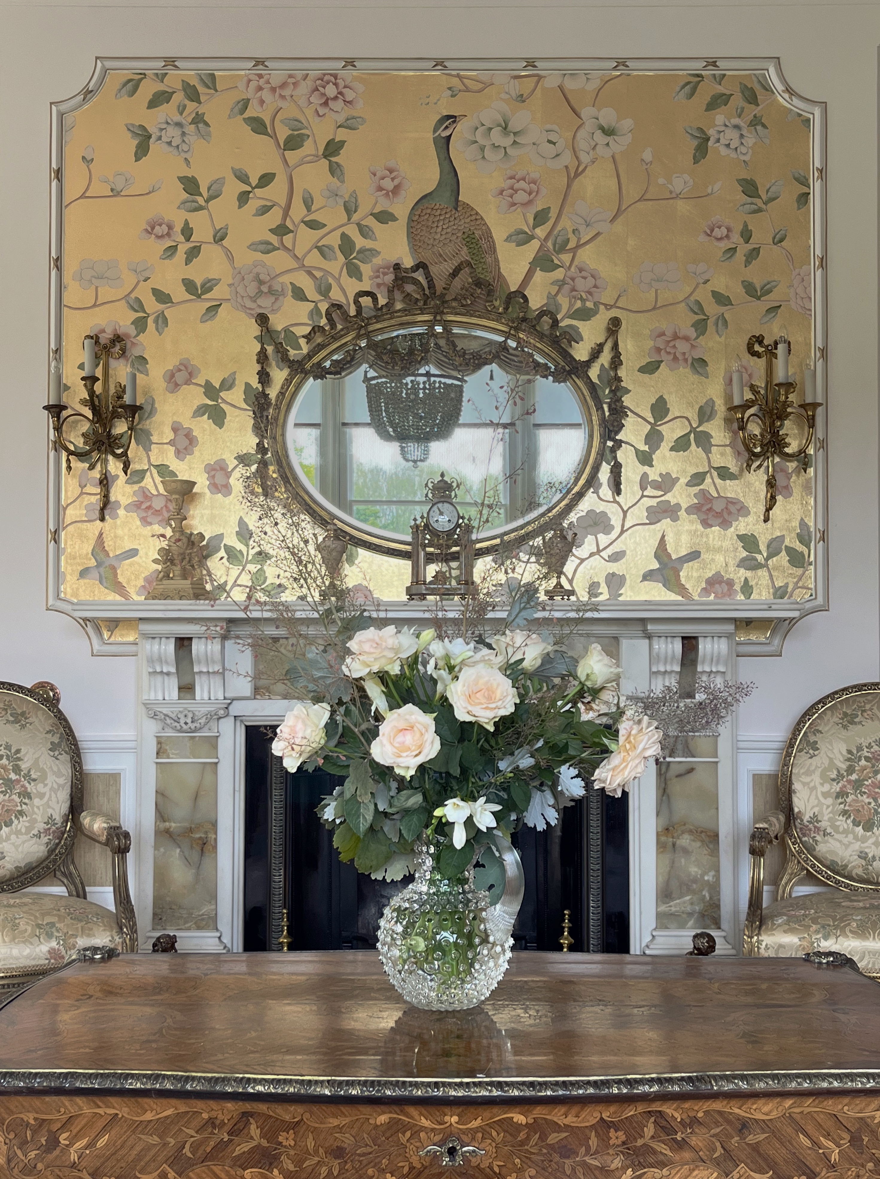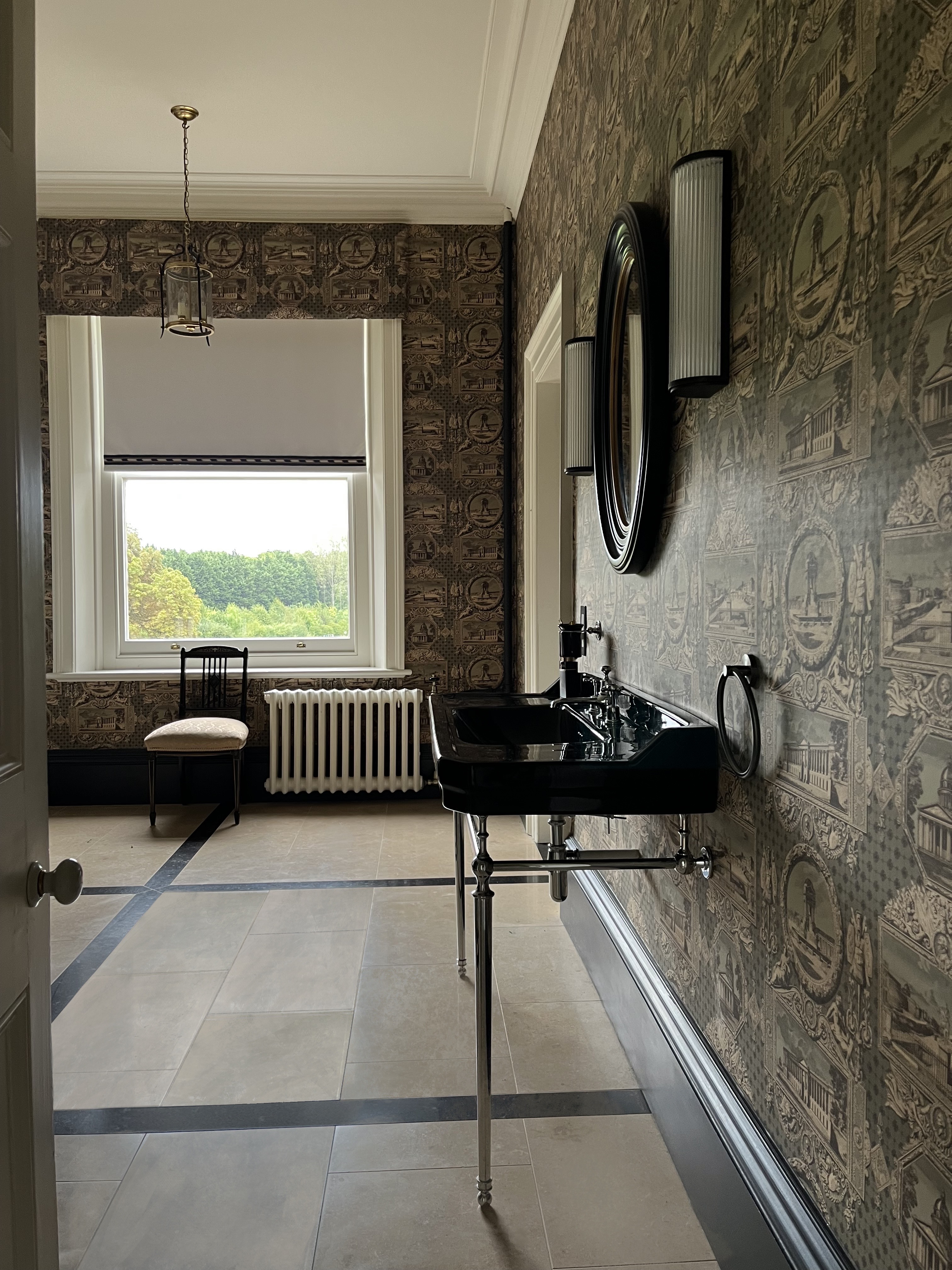 The drawing room has wonderful views over the gardens and parkland, we retained the wall panels, embellishments and original furniture and added a glamorous chinoiserie gilt peacock wallpaper. The morning room is a glorious room which opens on to the terraces and garden. We adored the original chintz curtains which we restored, the room was refreshed with new upholstery and paint colours. Upstairs, There was a warren of ‘back of house’ bedrooms which have been transformed in to bedrooms and bathrooms for the family and guests.