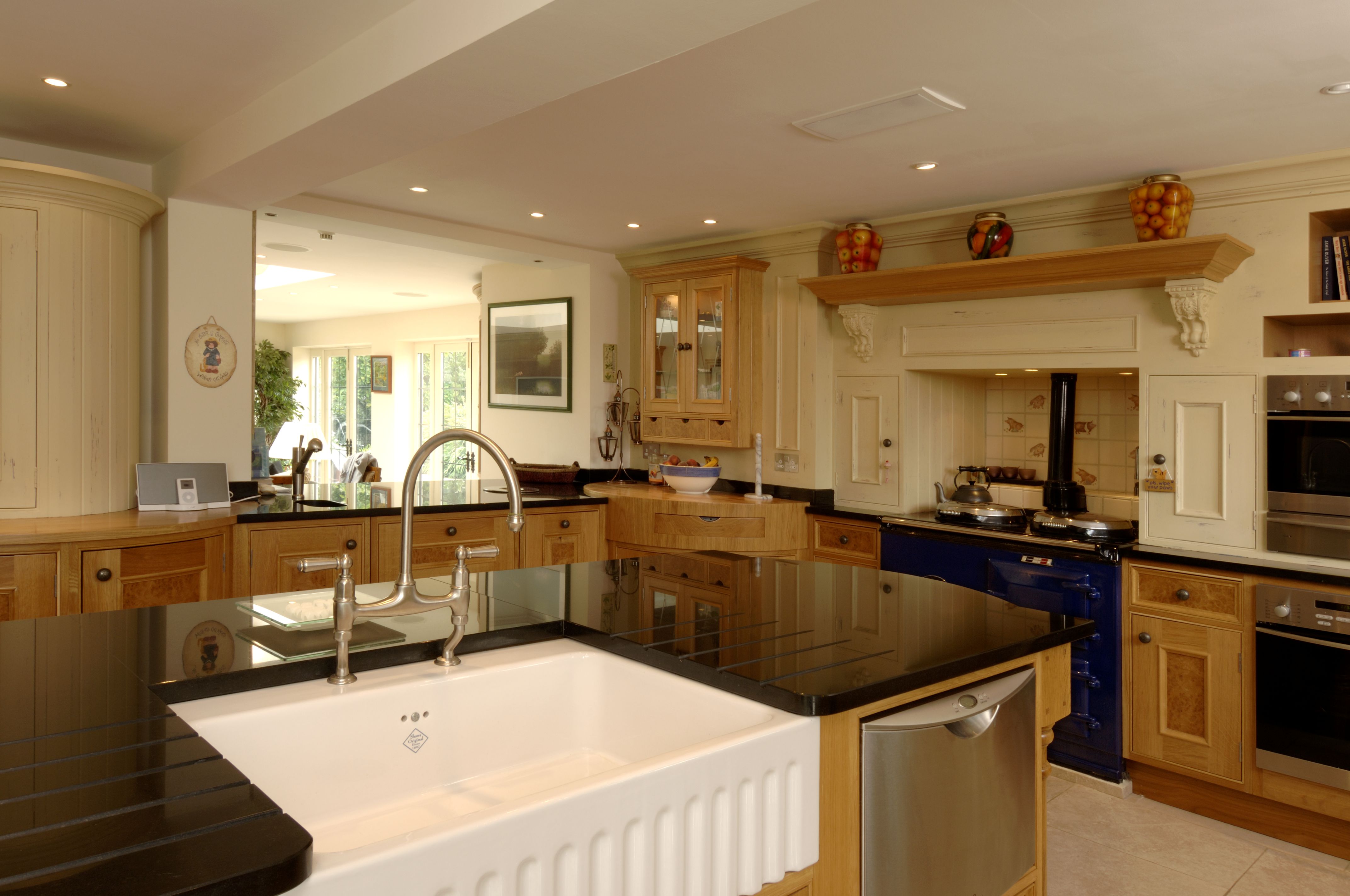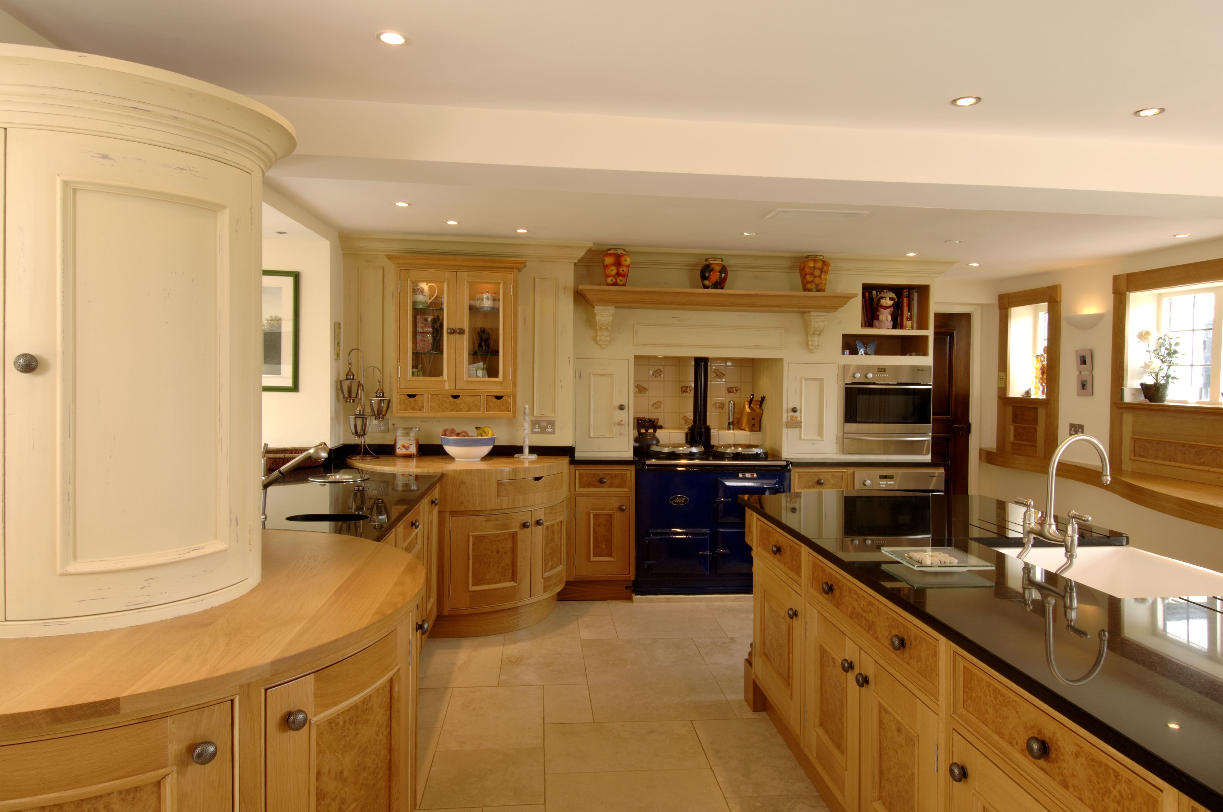 The kitchen follows through with natural oak but the center panels have been highlighted with book matched burr oak.
