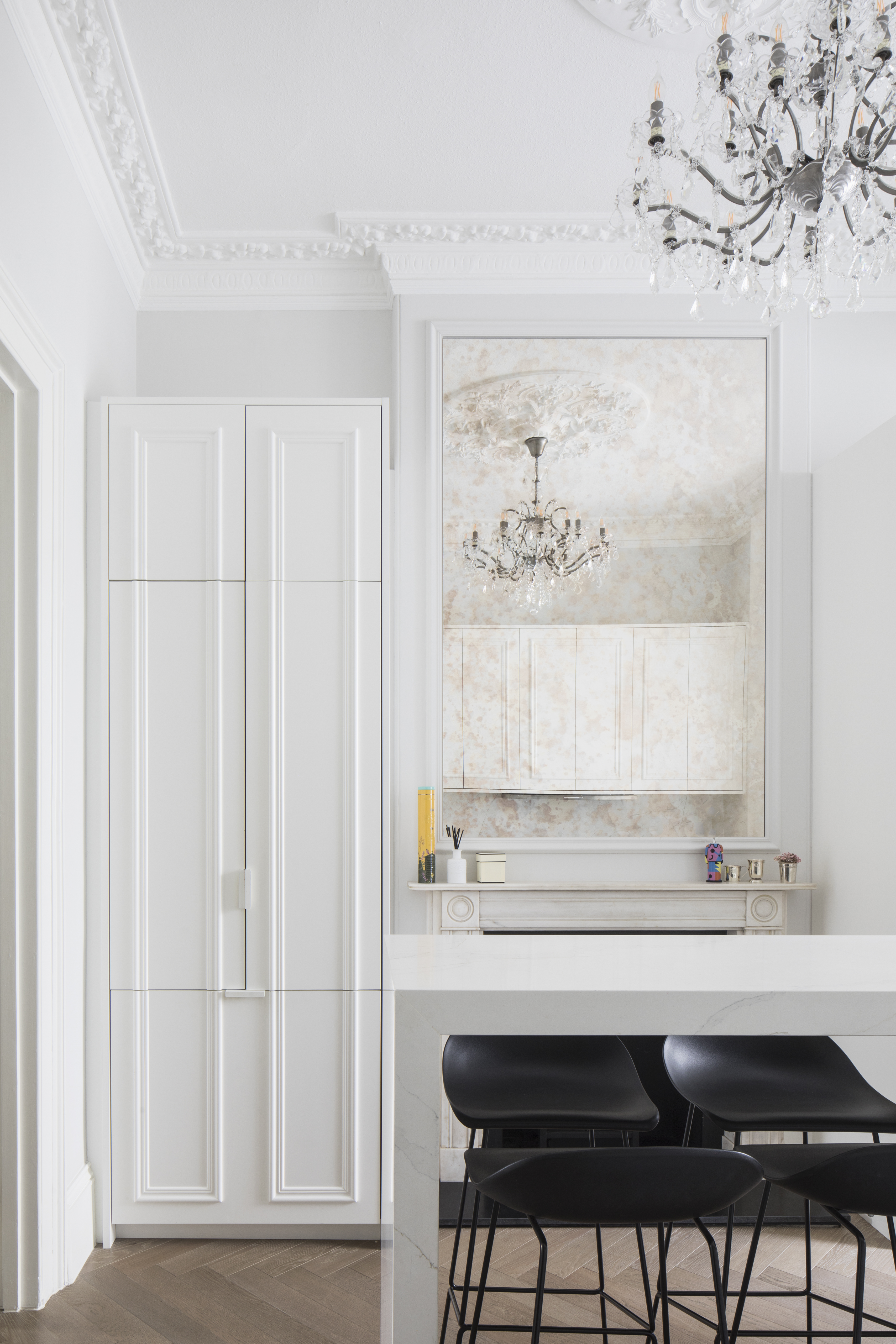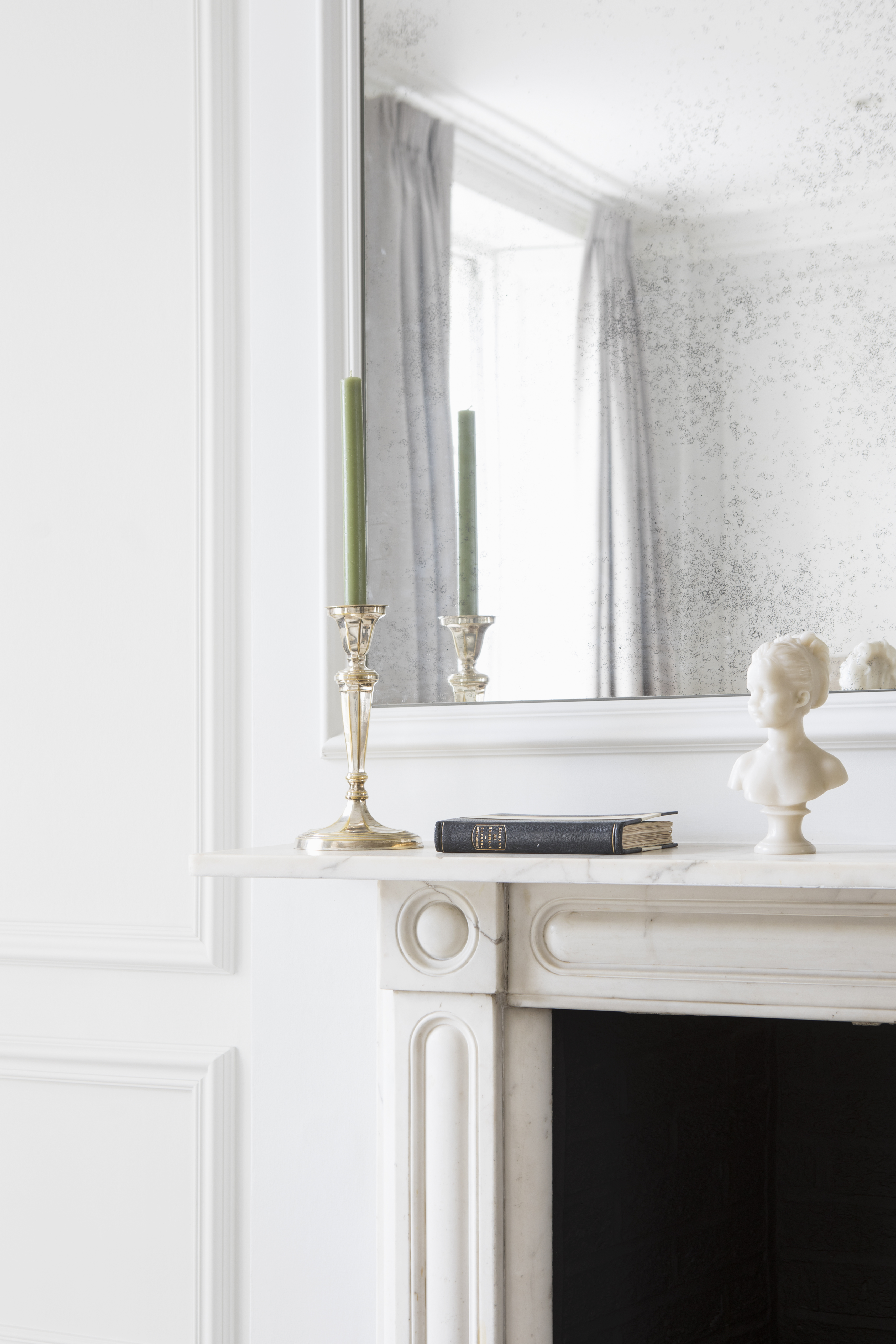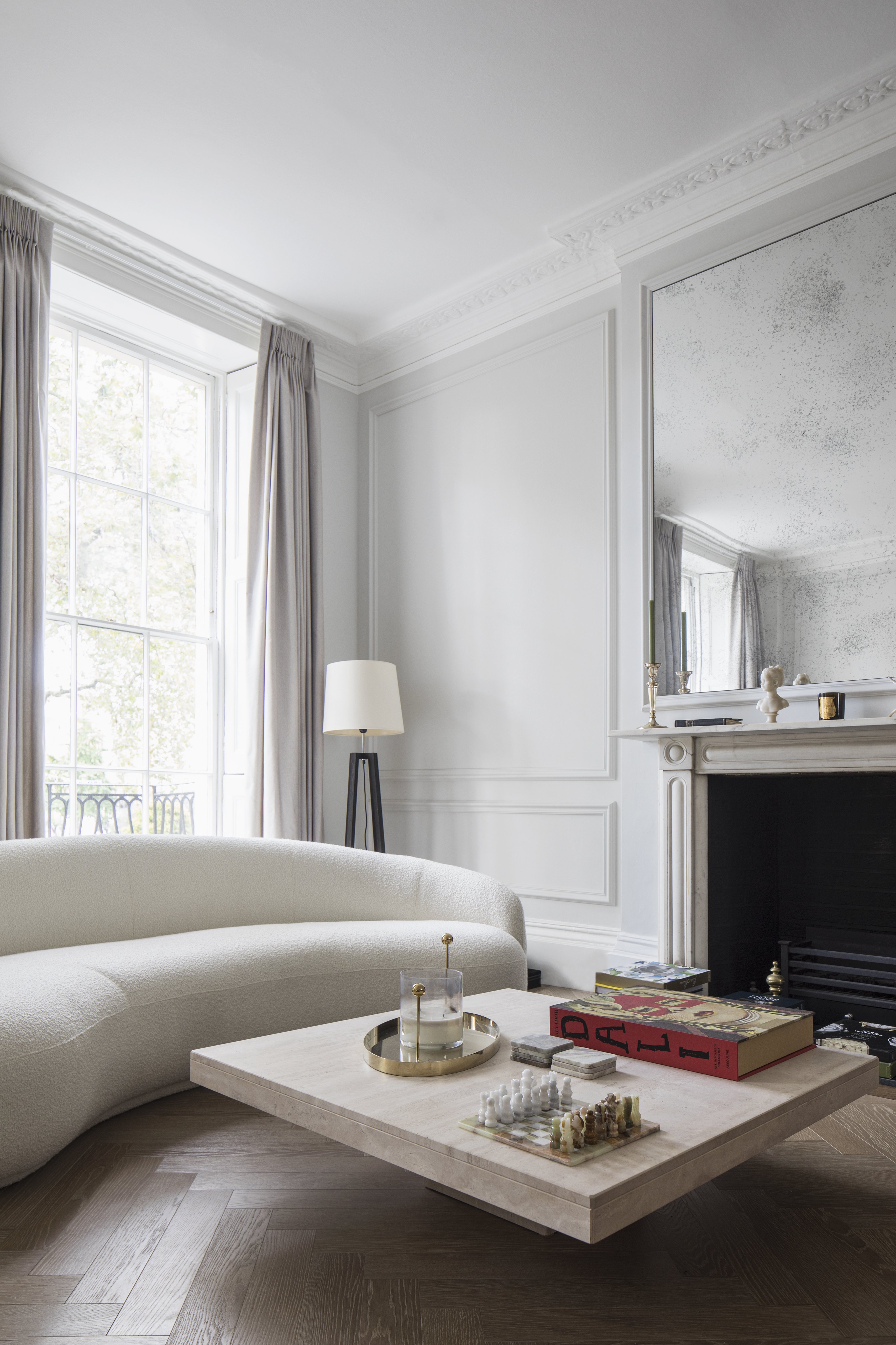Antique mirror panels have been fitted into the panelling above fireplaces, adding textural detail and a romantic feel reminiscent of Parisian decor. The furniture choice juxtaposes the old and the new. A modern curved sofa upholstered in boucle fabric and a bespoke travertine low coffee table are placed alongside a 1920s vintage French Louis XV style bombe marquetry chest of drawers.Aged brass sanitaryware and Murano glass chandeliers add a touch of glamour, completing the sophisticated and inviting ambience of this elegantly refurbished home.