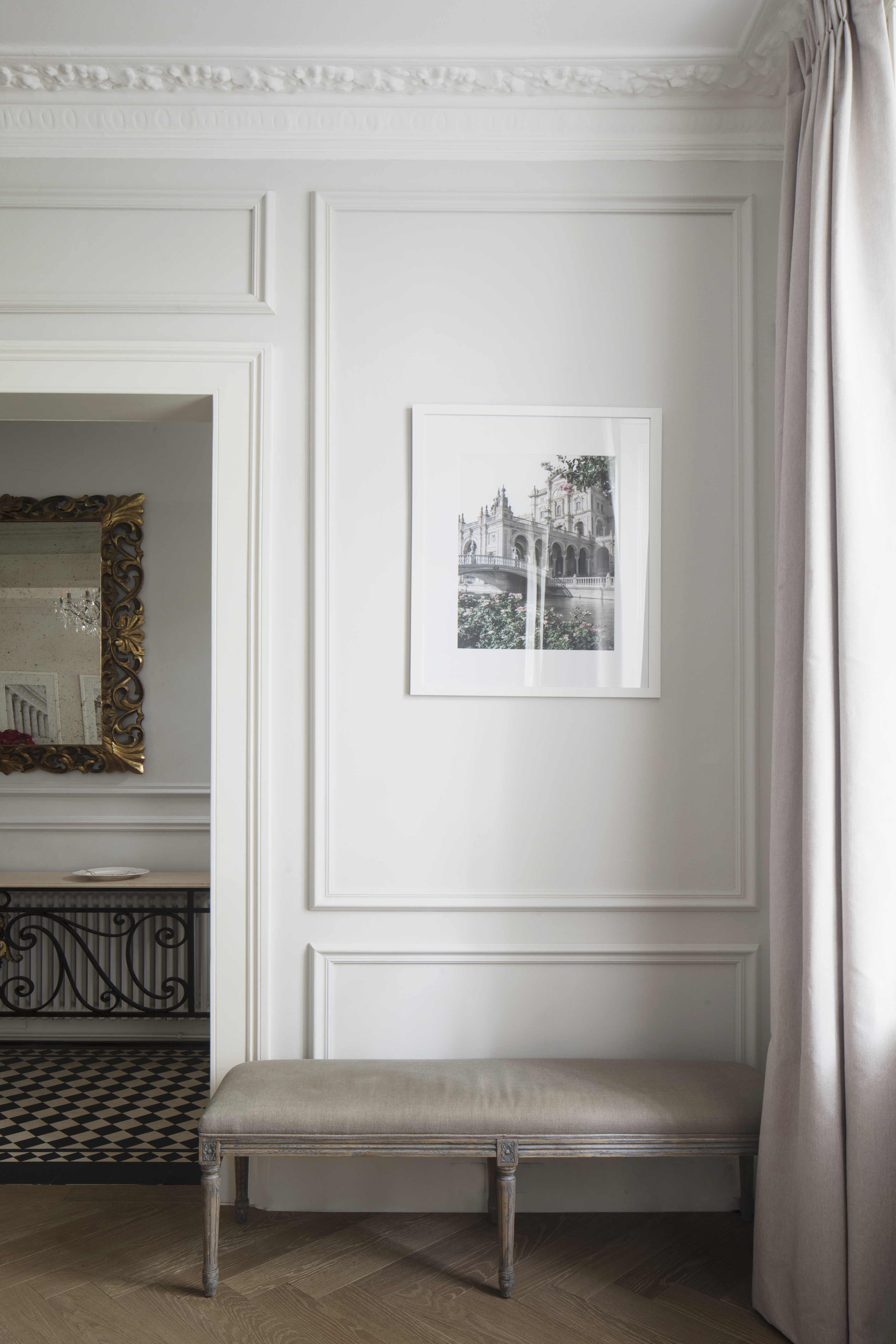 The full refurbishment breathes new life into the spaces, blending timeless sophistication with contemporary simplicity. Walls have been painted in an off-white colour with the addition of delicate panelling. Wooden flooring from Ark One in a traditional herringbone pattern works beautifully with original marble fireplaces and historical mouldings.