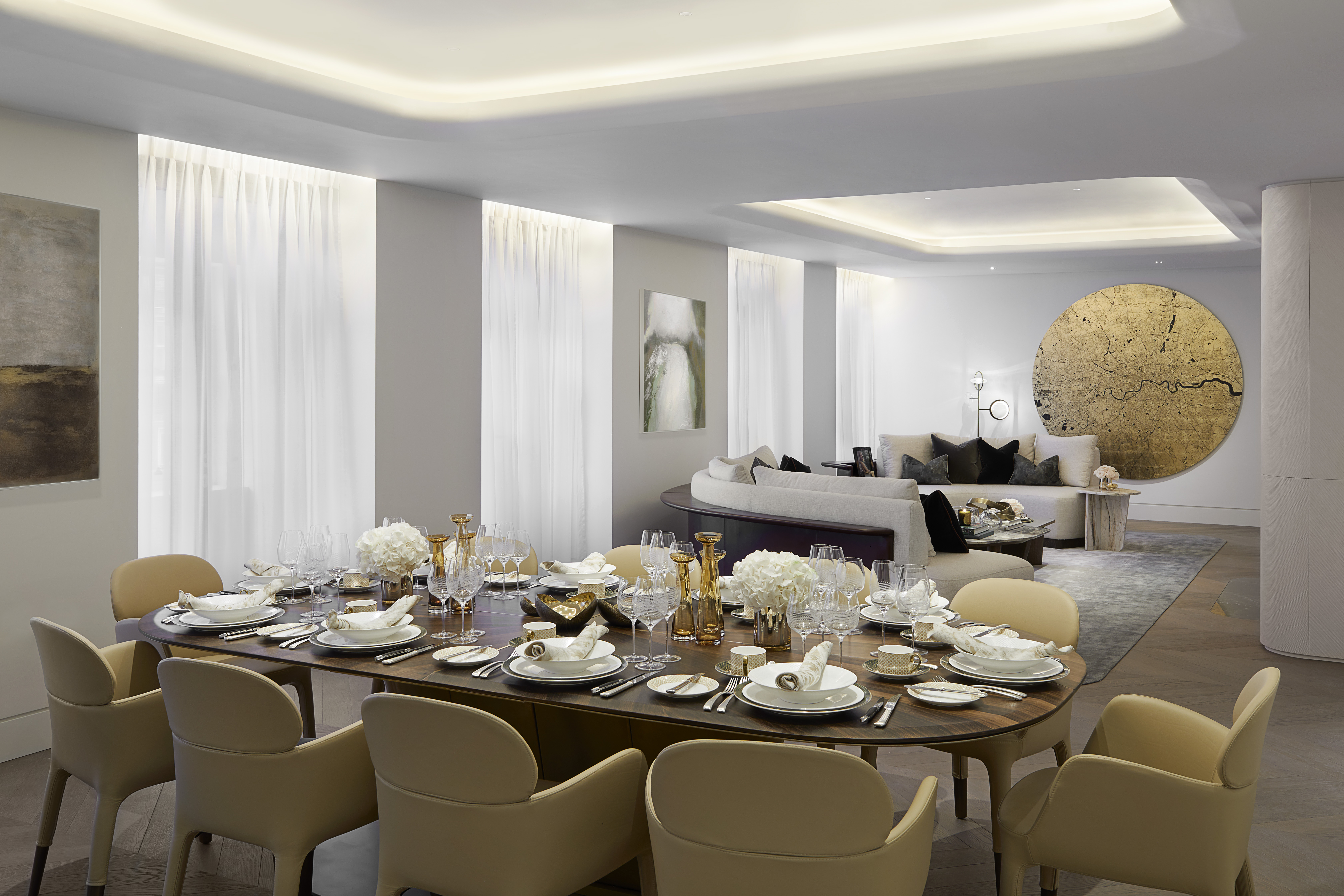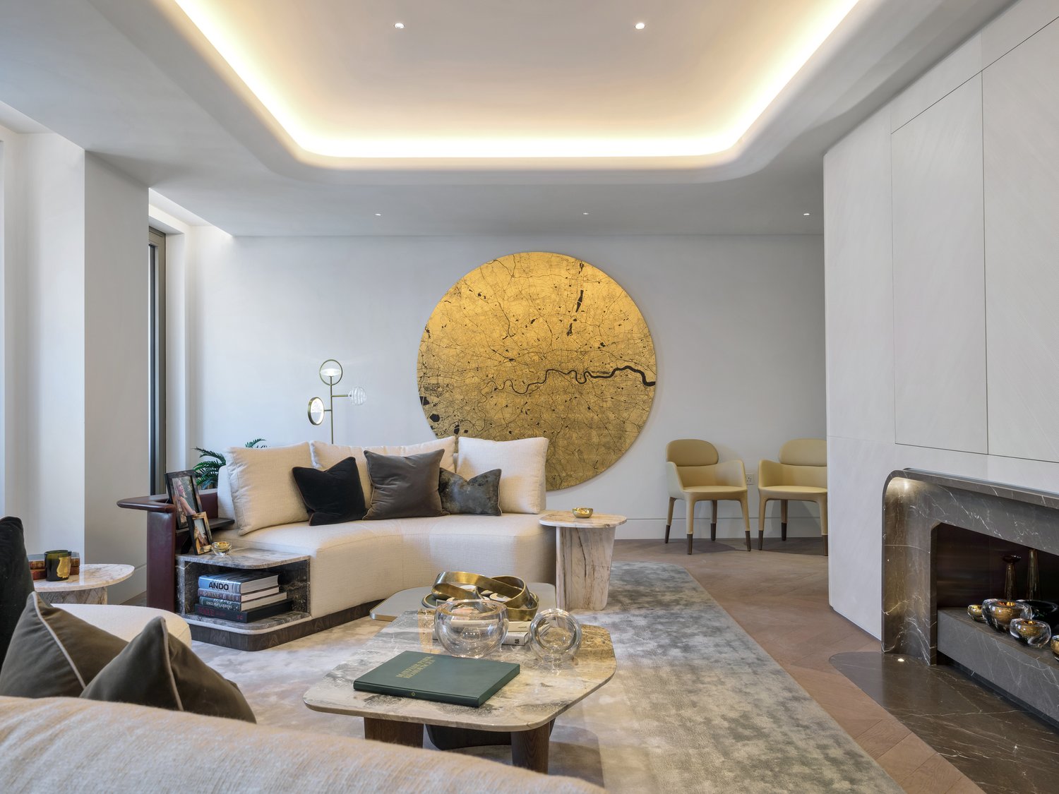 The stylish low coffee tables are created with cappuccino grey marble resting upon dark-stained oak legs. The uniquely curved sofas, that sit on either side of the coffee tables, combine the same marble and stone but introduce hand-stitched leather and soft bouclé fabrics.