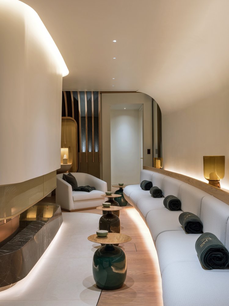 At the centre of the bouclé sofas and armchairs are hand-finished burled oak plinths on top of plush blue table bases. In between the armchairs, similar smaller tops have been paired with green ceramic vases creating a unique and elegant ambience to the spa.