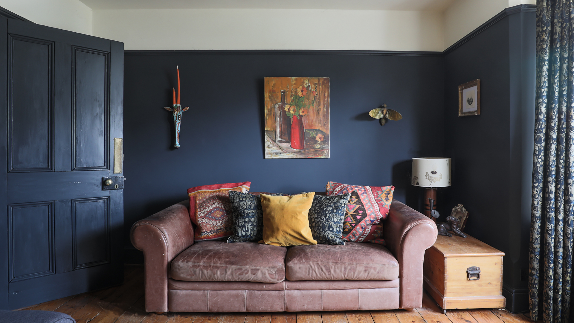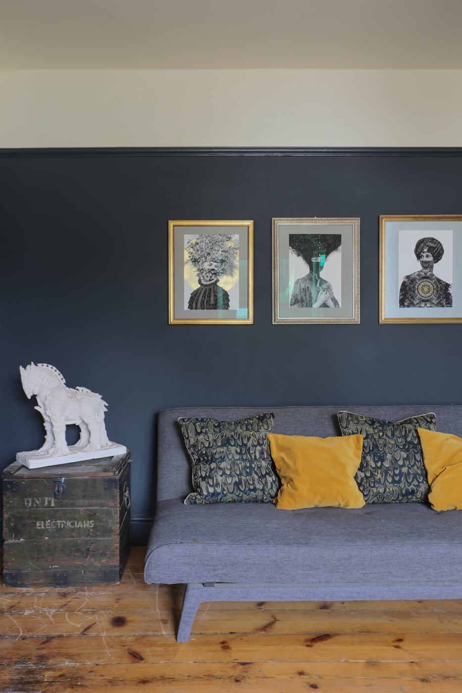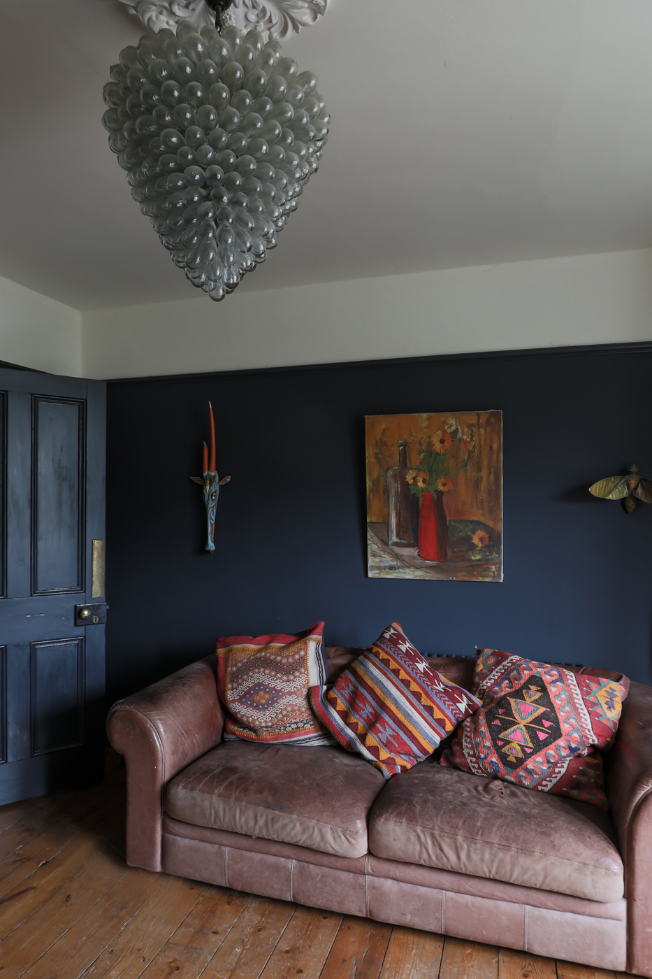 The room was decorated considering the many legacy pieces of furniture, artwork and lighting that have been collected; such as the vintage Chinese cupboard, bespoke coffee table, and blown glass chandelier made in Morocco, much loved vintage leather sofa and chairs, vintage mirror and frames and old electricity storage cabinet.