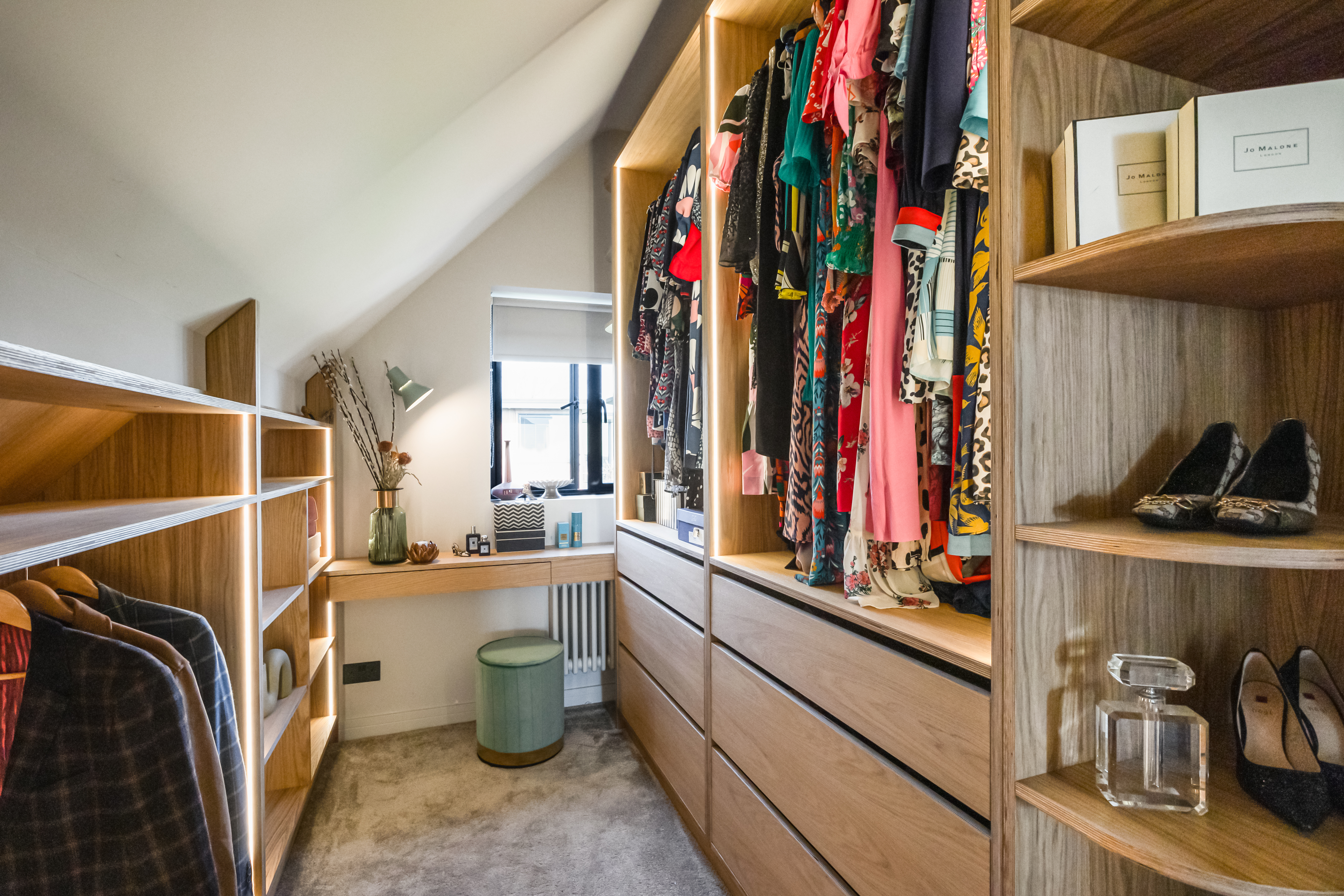 A big part of our brief for this project was bespoke joinery design. Our concept explored the idea of breaking up the expansive open-plan living area by creating a dual aspect joinery wall, encompassing a bio ethanol fireplace on one side, and the TV on the other in order to separate the snug area from the living room. Not only this, but our clients had an impressive collection of fabulous dresses and shoes, as well as records, decks and other music equipment… all of which needed a home. Our Senior Interior Architectural Designer meticulously designed bespoke storage solutions for every room in the house, liaising with the client at every stage about what she needed to store, and where.
