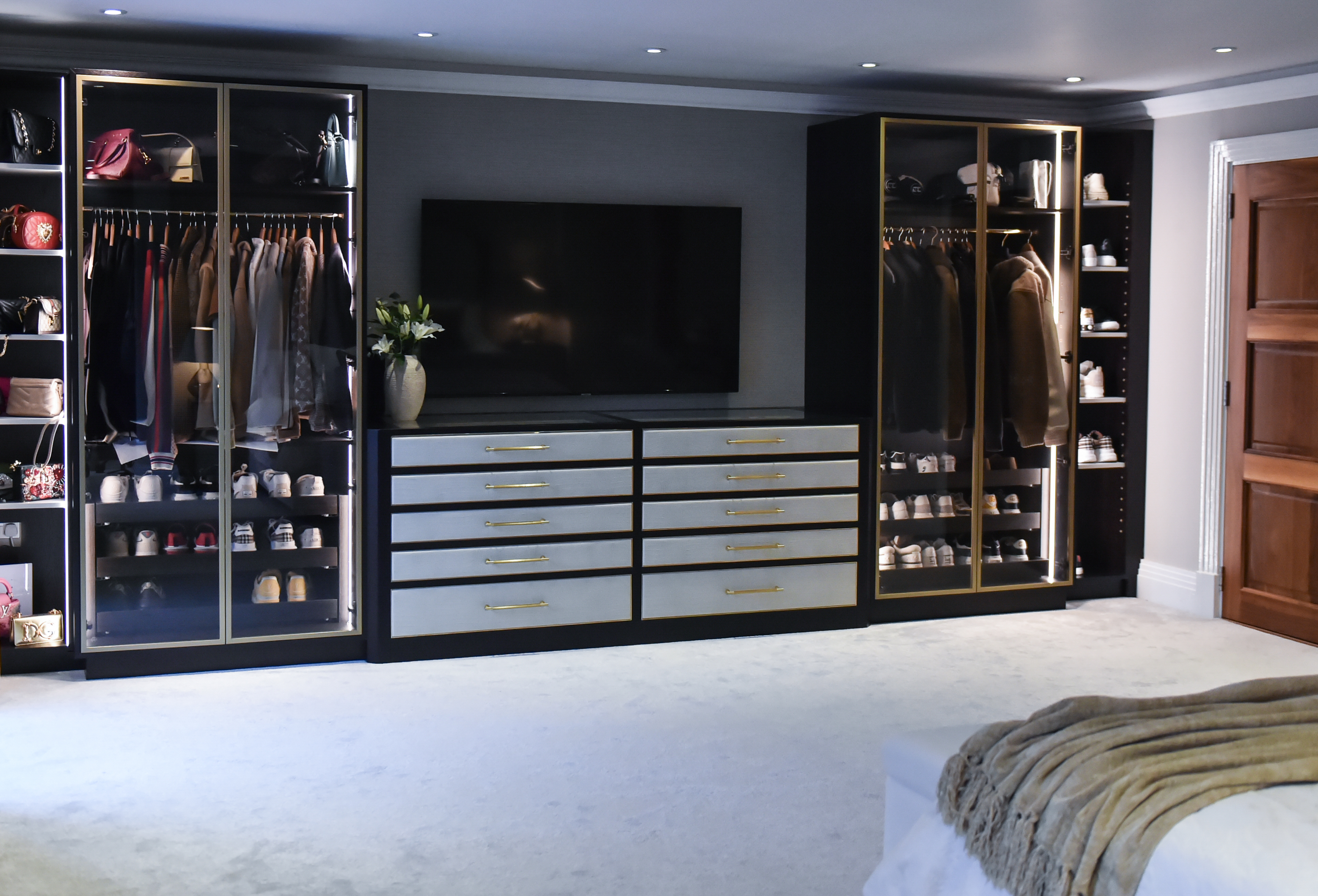 This master bedroom goes beyond the usual with a wardrobe that’s more like a personal gallery. We designed it specifically to showcase our client’s jewellery collection, bags, and unique pieces behind glass panels finished in warm brown tones.