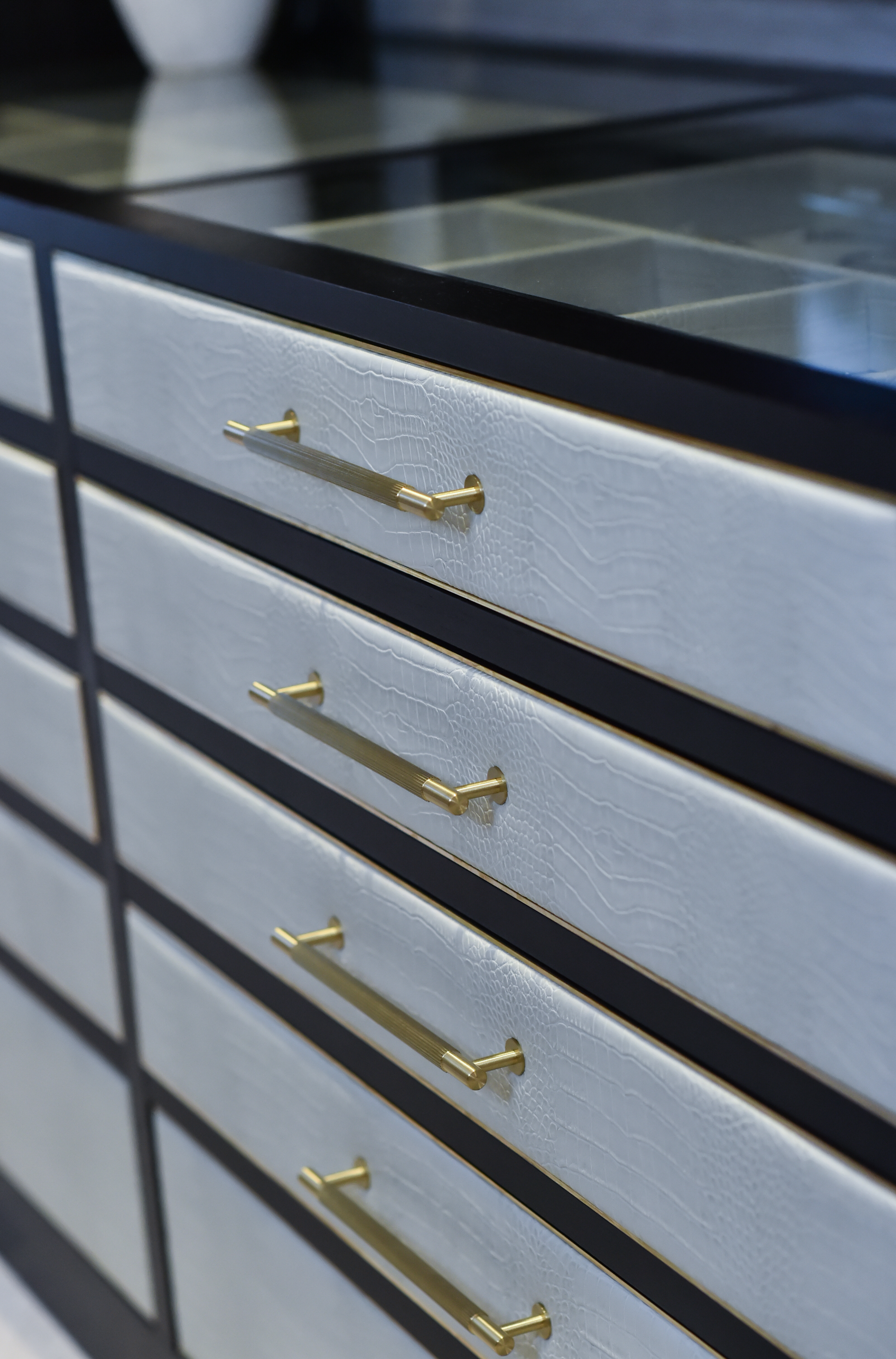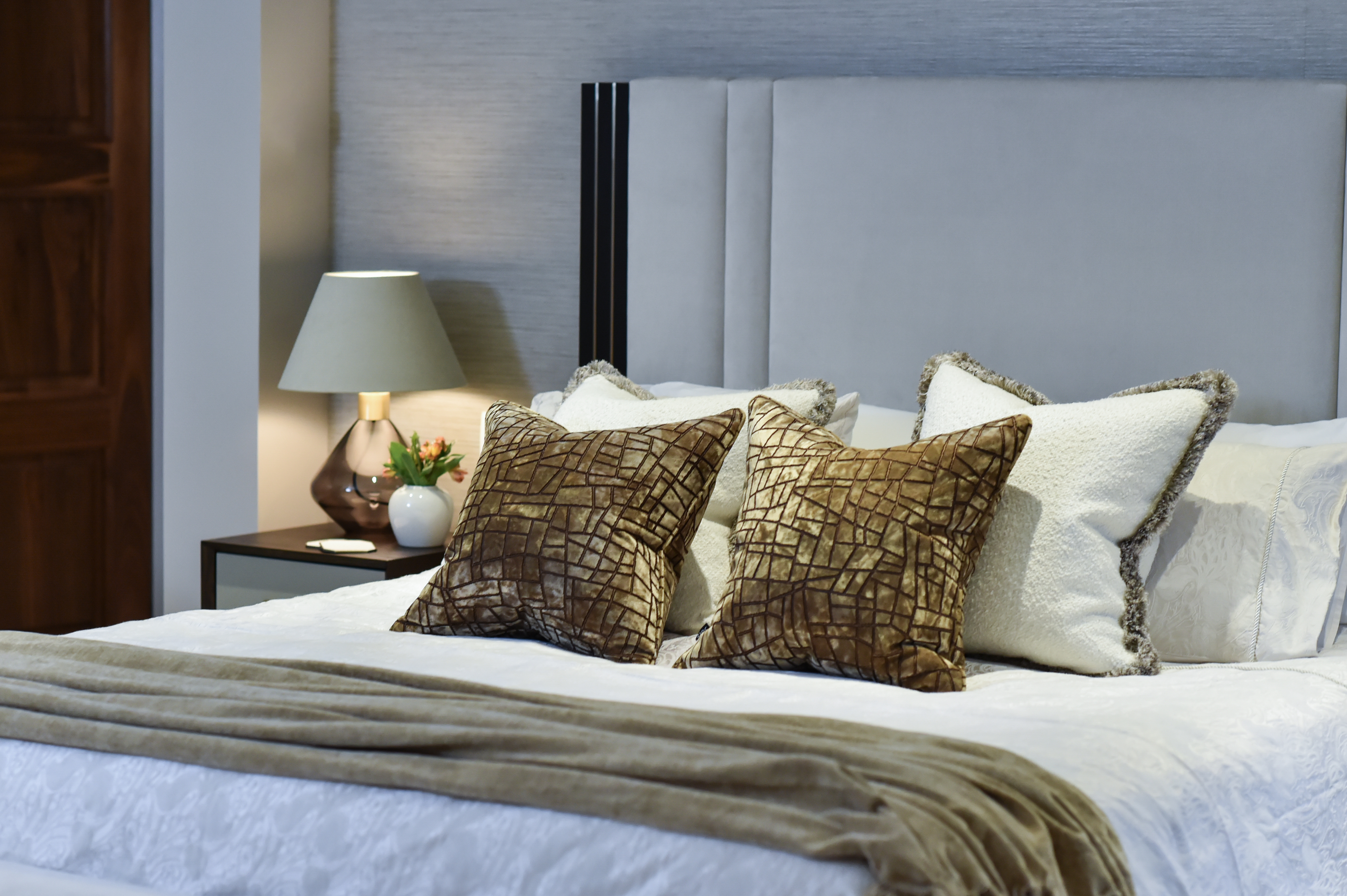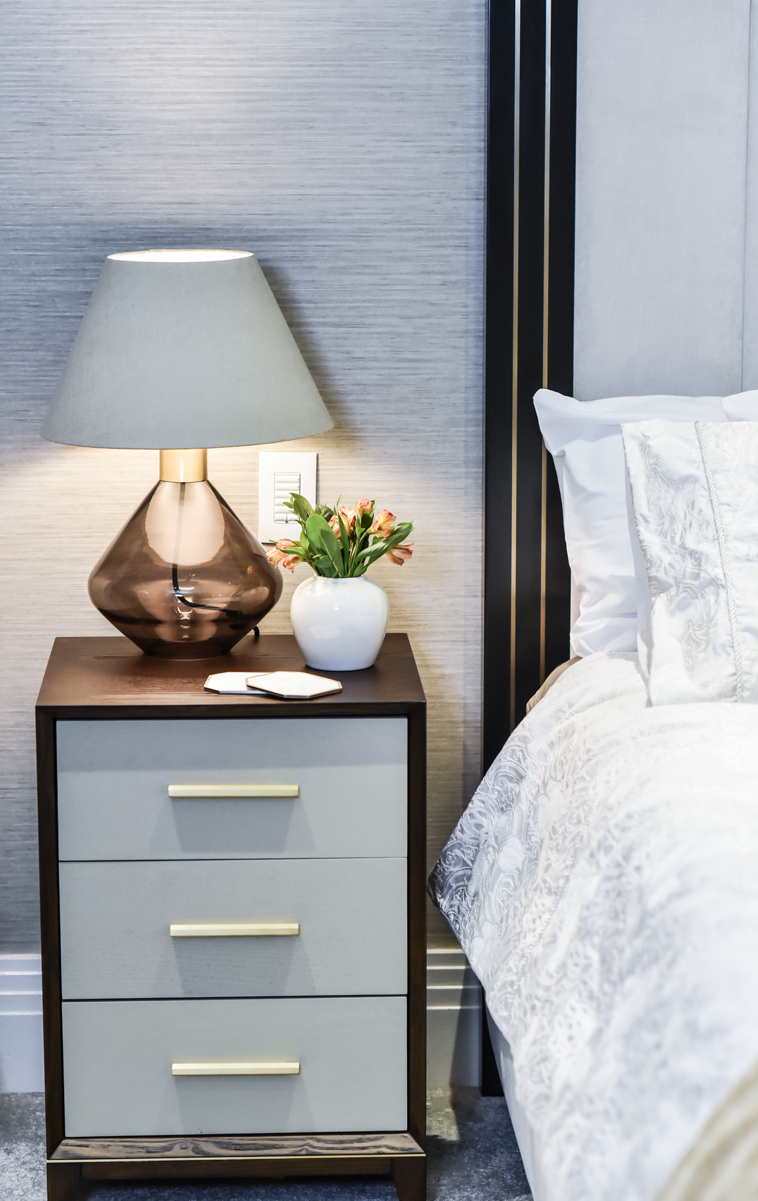 The details make the space unique. The wardrobe drawers feature a leather crocodile pattern and brass handles, while textured wallpaper adds depth to the walls. We chose dark wood furniture to contrast with the neutral velvet headboard, creating visual interest throughout the room. A custom bench with dark bronze details and lighting ties the space together, matching the brass elements we used elsewhere.