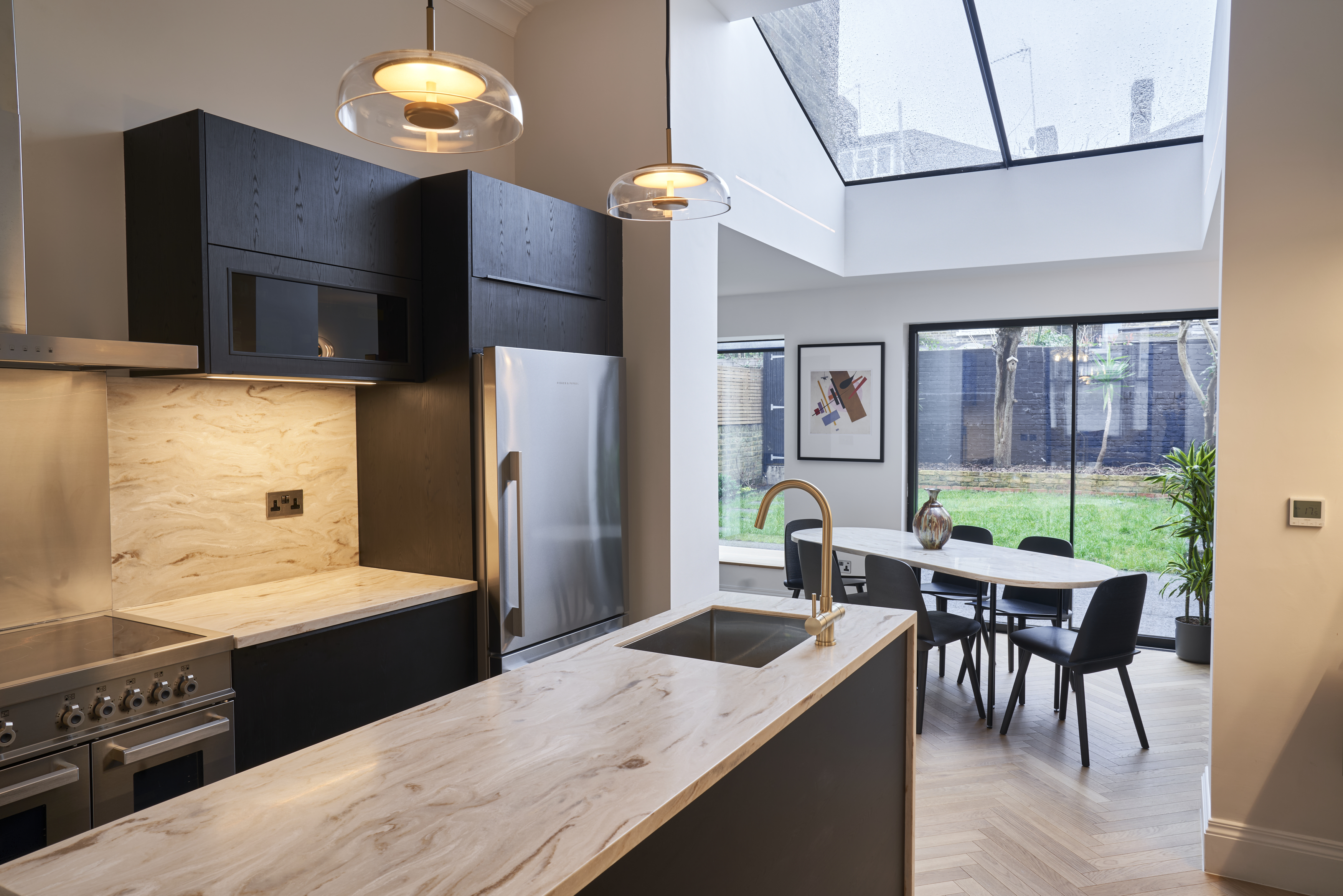 A Thermally Efficient Home with Air Source Heat Pump - The client connected with us through Design For Me - he needed someone that could completely take the strain away from the renovation of a 4 bedroom house he had just purchased. The house had not been updated for a long time, but had huge potential. As the rear garden was already relatively small it was decided to work with the existing foot print, improving, rebuilding, redesigning the existing extension. As the house is in a conservation area we applied for Planning Permission to change the external experience along with installing an Air Source Heat Pump. In order for the house to become thermally efficient we took it back to its bones, we insulated throughout, including the external walls. Underfloor heating has been laid throughout. We tendered and appointed the contractor and MCS accredited ASHP supplier - working closely with them both to provide suitable heating and hot water. Further sourcing & design included glazing, flooring, lighting , kitchen design, bathroom design, joinery design, fixtures & fittings, along with help with furniture. The client now has a low energy use house.