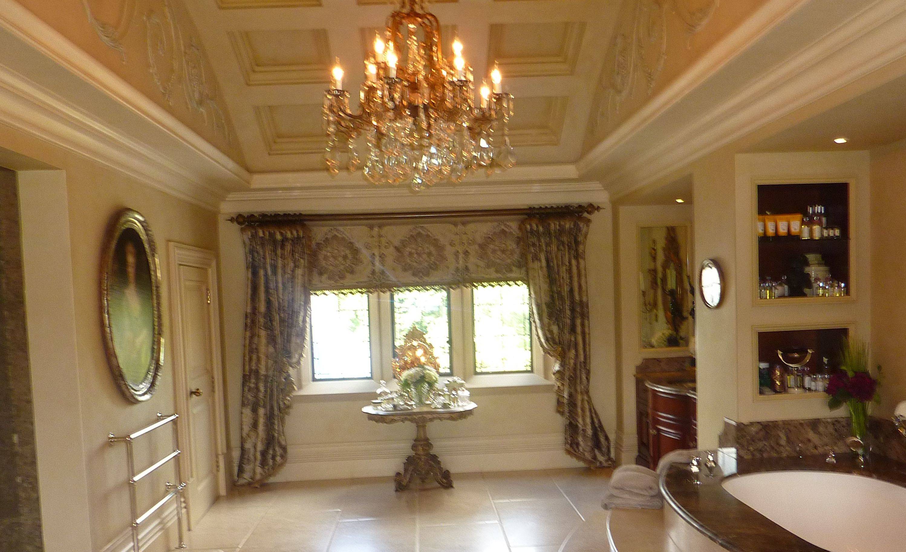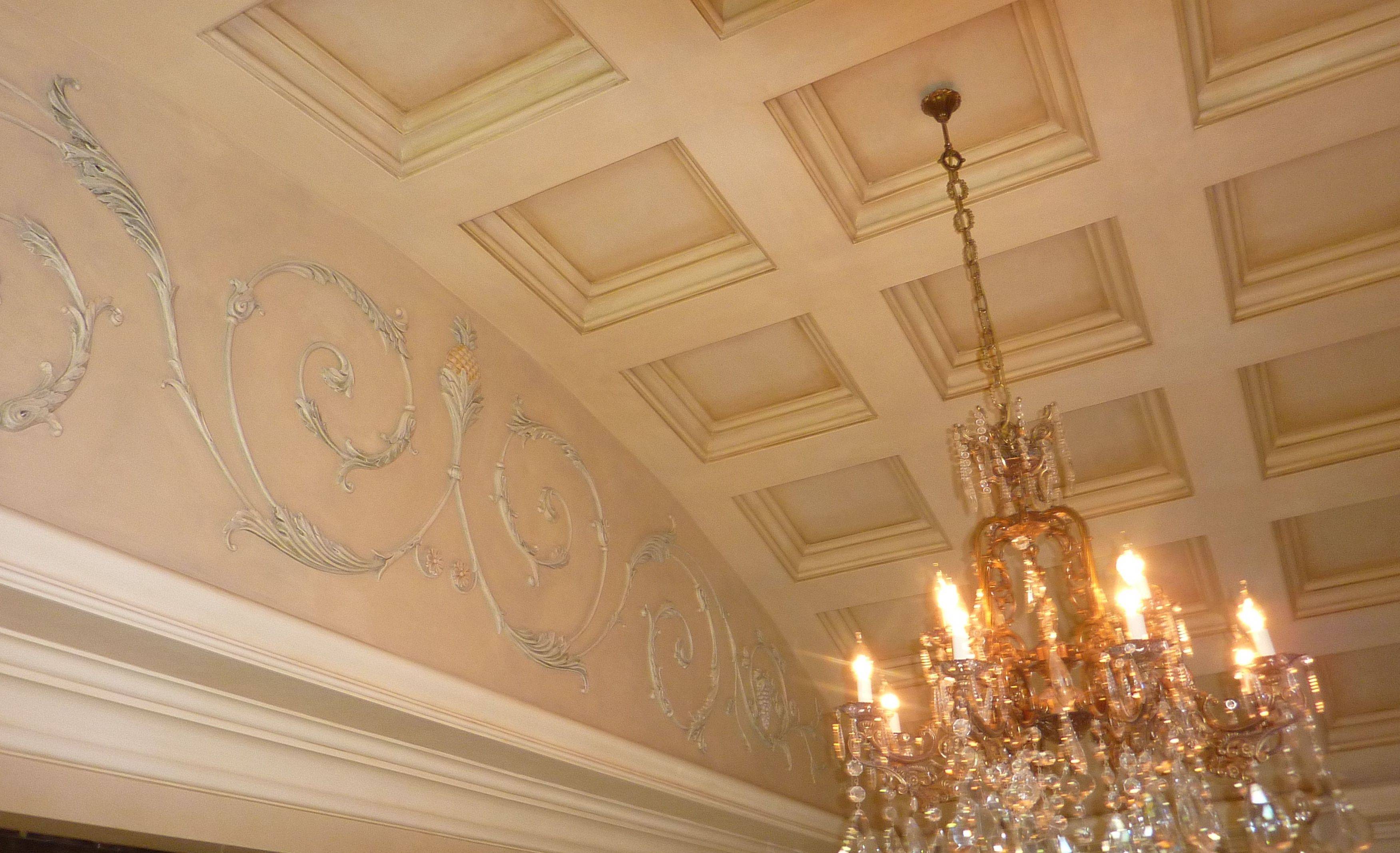 We removed the dividing walls to create a large elegant space and then removed the ceiling to form a barrel vaulted detail allowing us height to hang a chandelier.