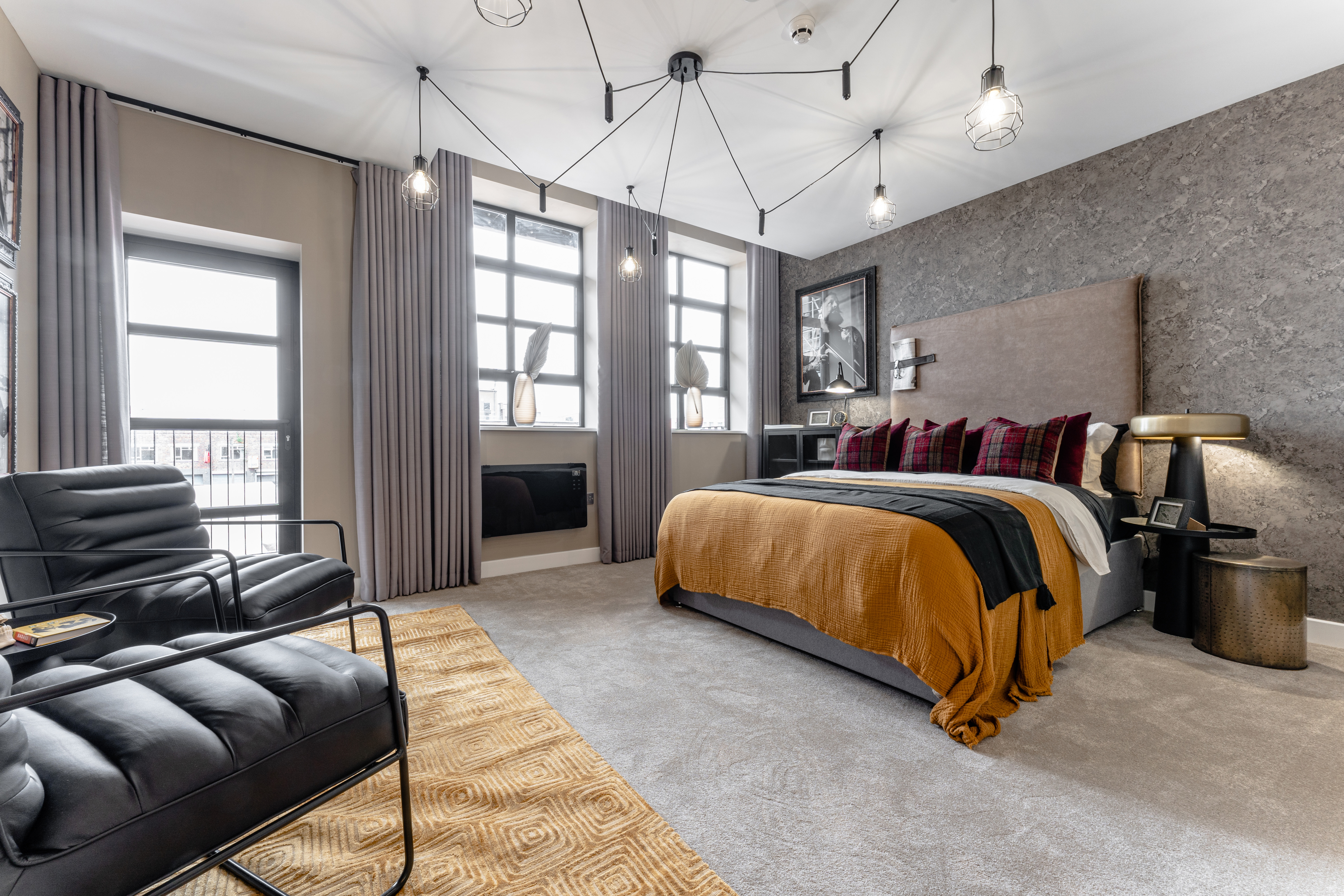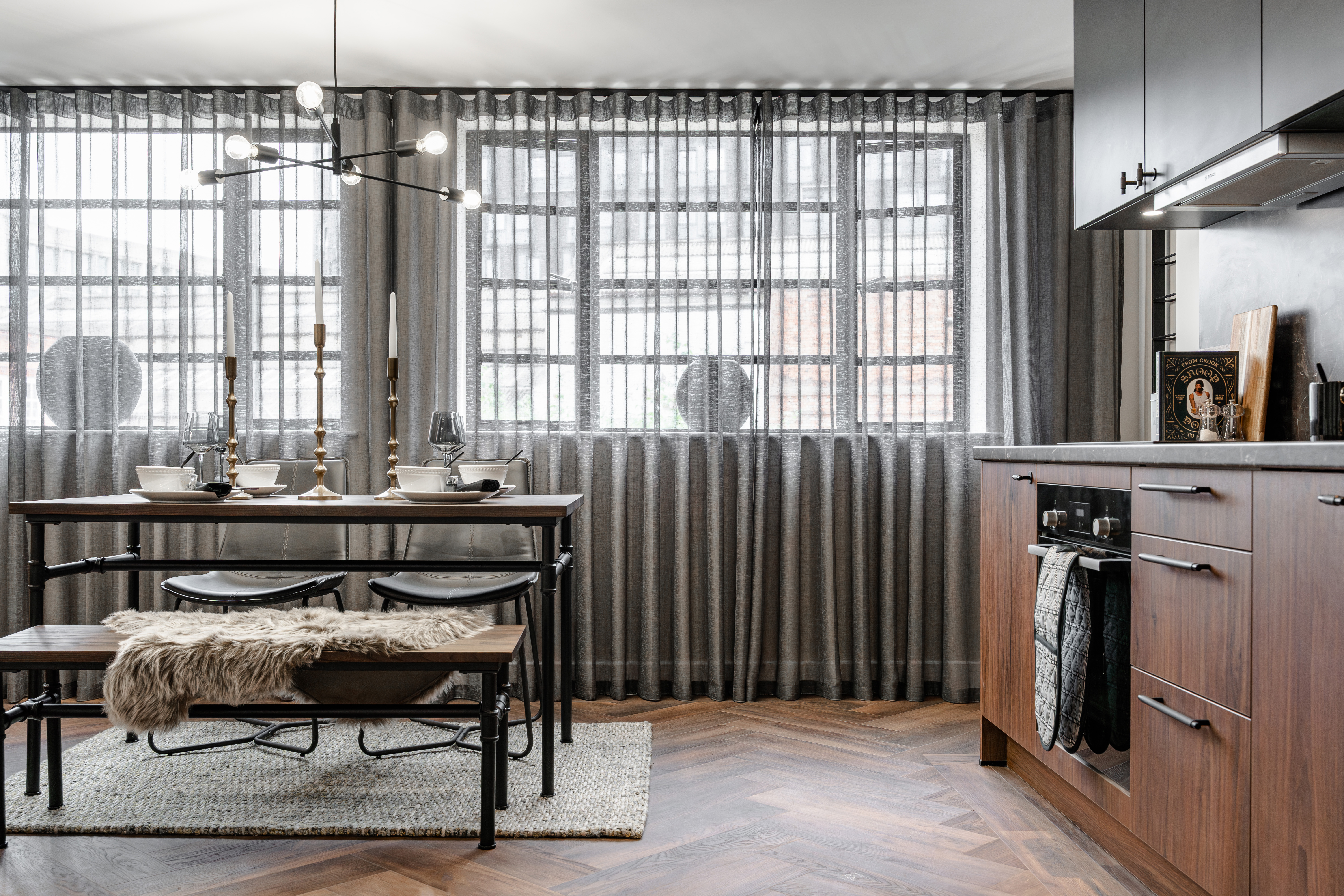 A wonderful project in a trendy Birmingham apartment: Dressing large traditional windows with full-length wave curtains, in high-quality linen. The simple wave heading creates a contemporary and stylish feel, adding a luxurious touch to the space.