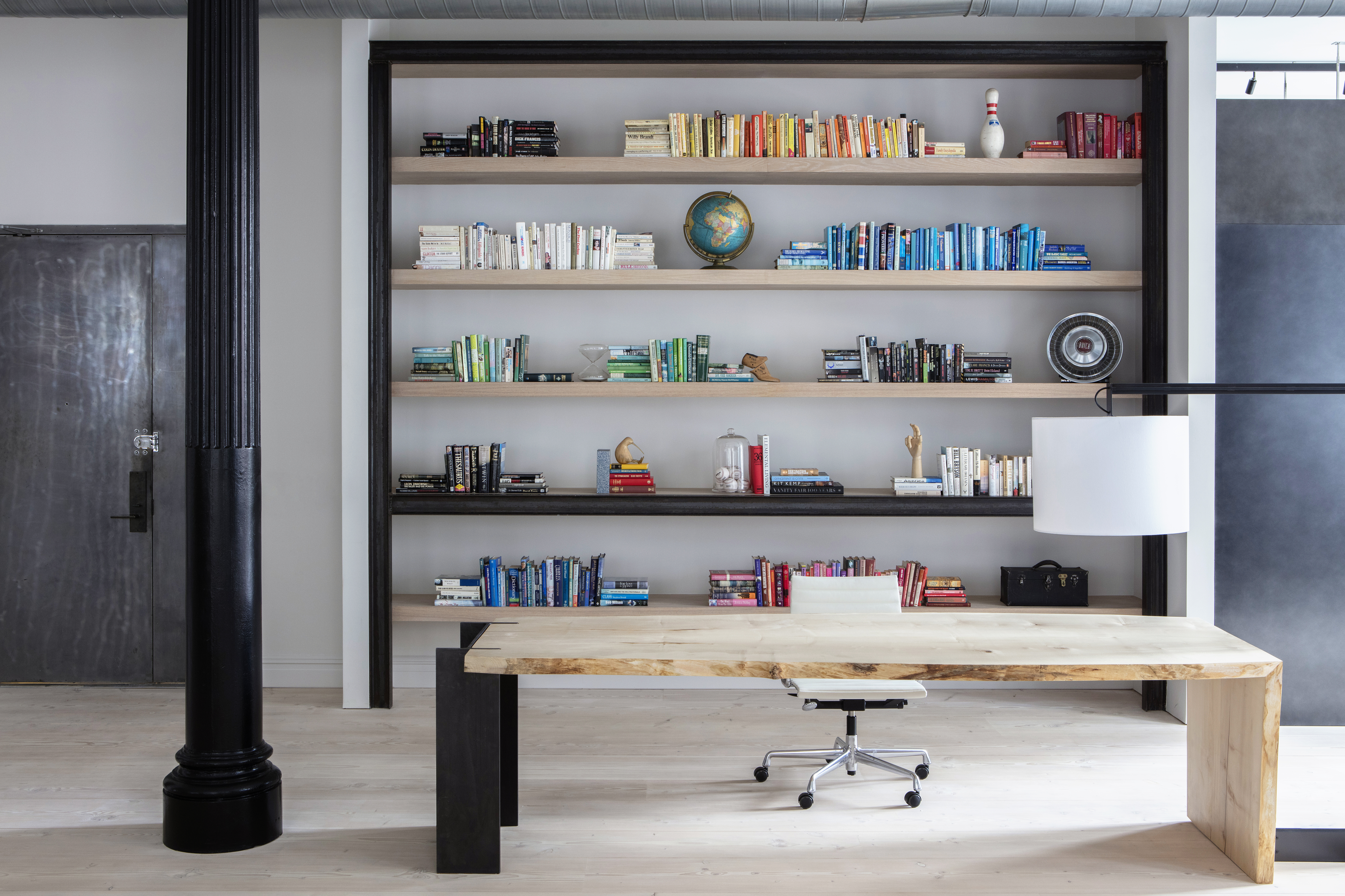 The apartment was fitted with Dinesen Douglas fir flooring which bought a natural warmth to balance the industrial feel of the space, large rugs were bespoke made to frame the various seating areas, and books were sourced and coordinated to add pops of colour to the work space in the main open plan area.
