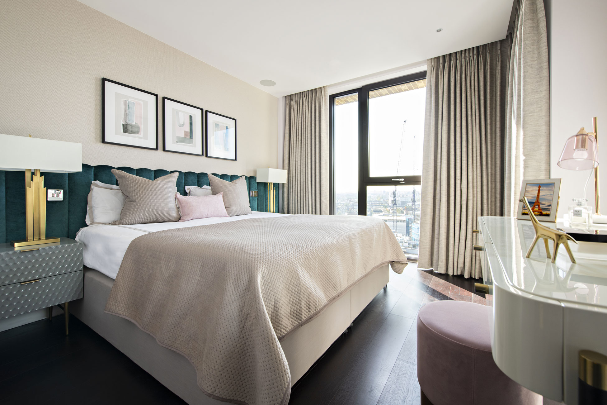 Our client had purchased a new development flat with commanding views of the local area and wanted to live in a new home with a stylish and classy luxury interior design. At Moretti Interior Design, we believe it is essential to include the lighting design for your interiors into account from the start of the creative process – as we did in this case. We also use colour psychology to ensure that the look and feel of each room is perfectly suited both to the character of the people who will inhabit it and the function of the room in question. In this instance, our client wanted a contemporary style with a hint of the 1960s and 1970s. To complement this process, we designed several bespoke items for the client. That included the wallpaper, headboard, rugs, the TV unit and office chair. That ensured the client could move smoothly into a new home with an interior design that epitomised their individual taste and style. That process was exemplified by a room that we created where the interior design reflected the client’s love of travel. We came up with an explorer theme, crowned by a stunning map of the world that filled a whole wall of the room.