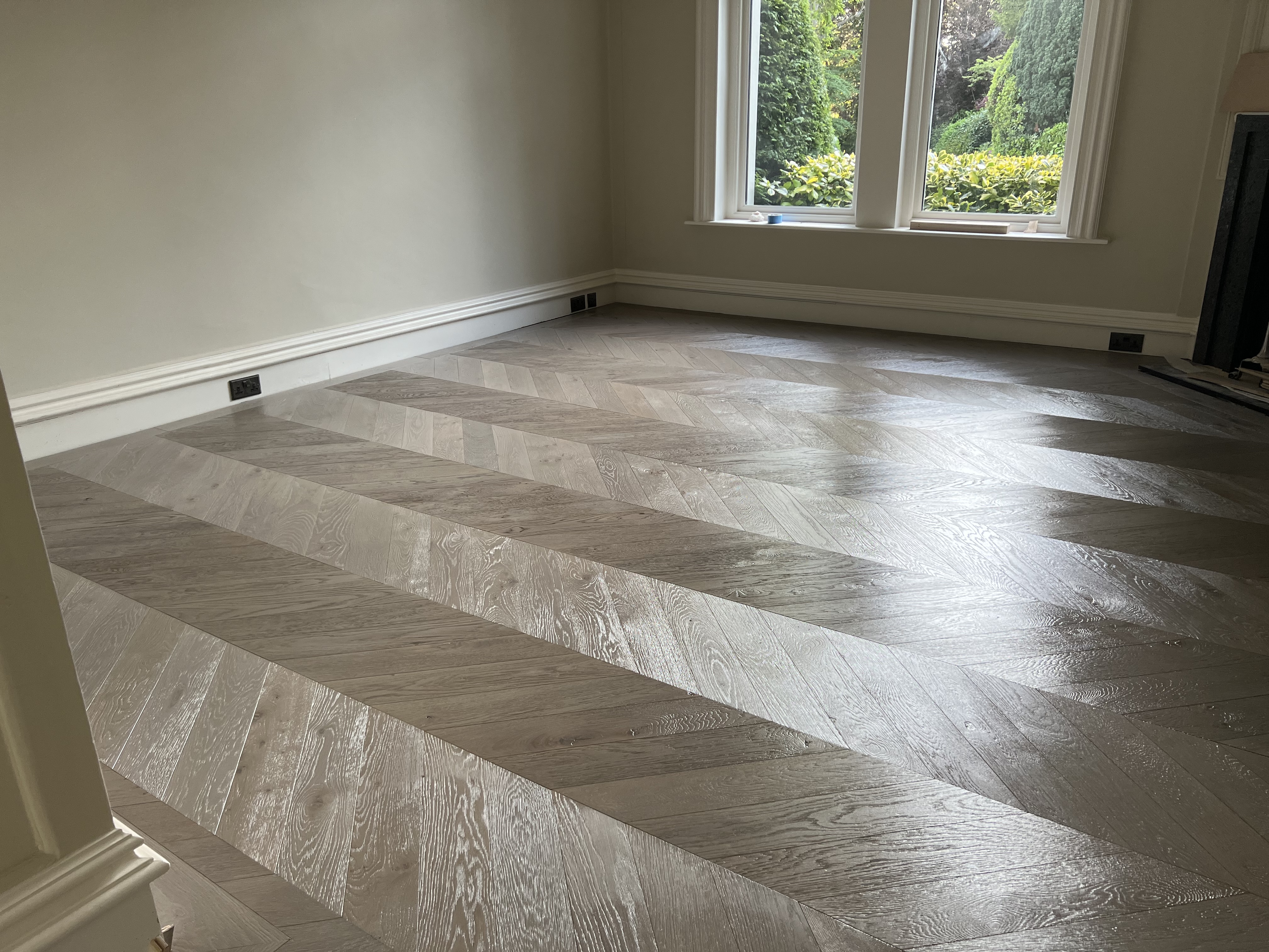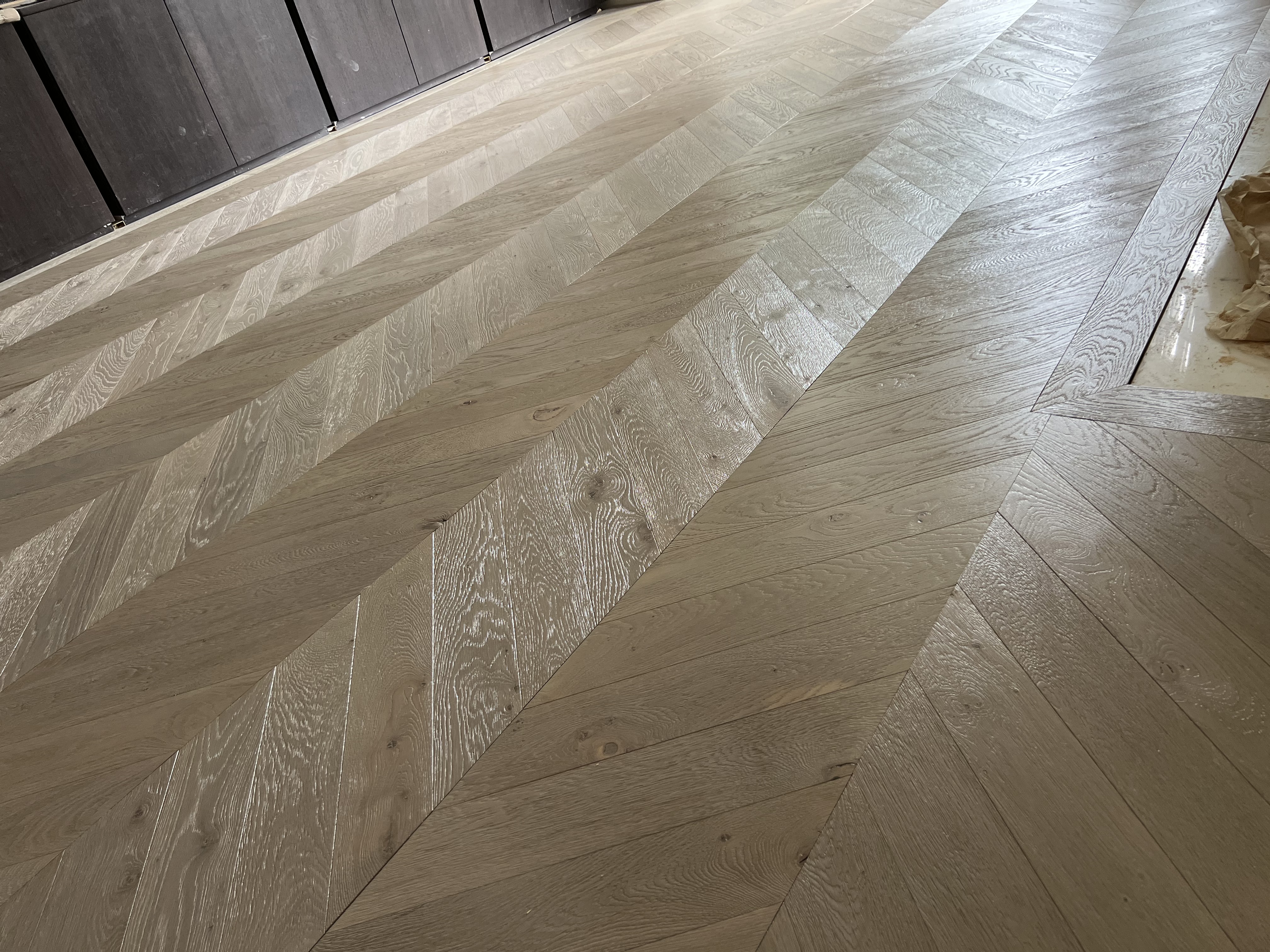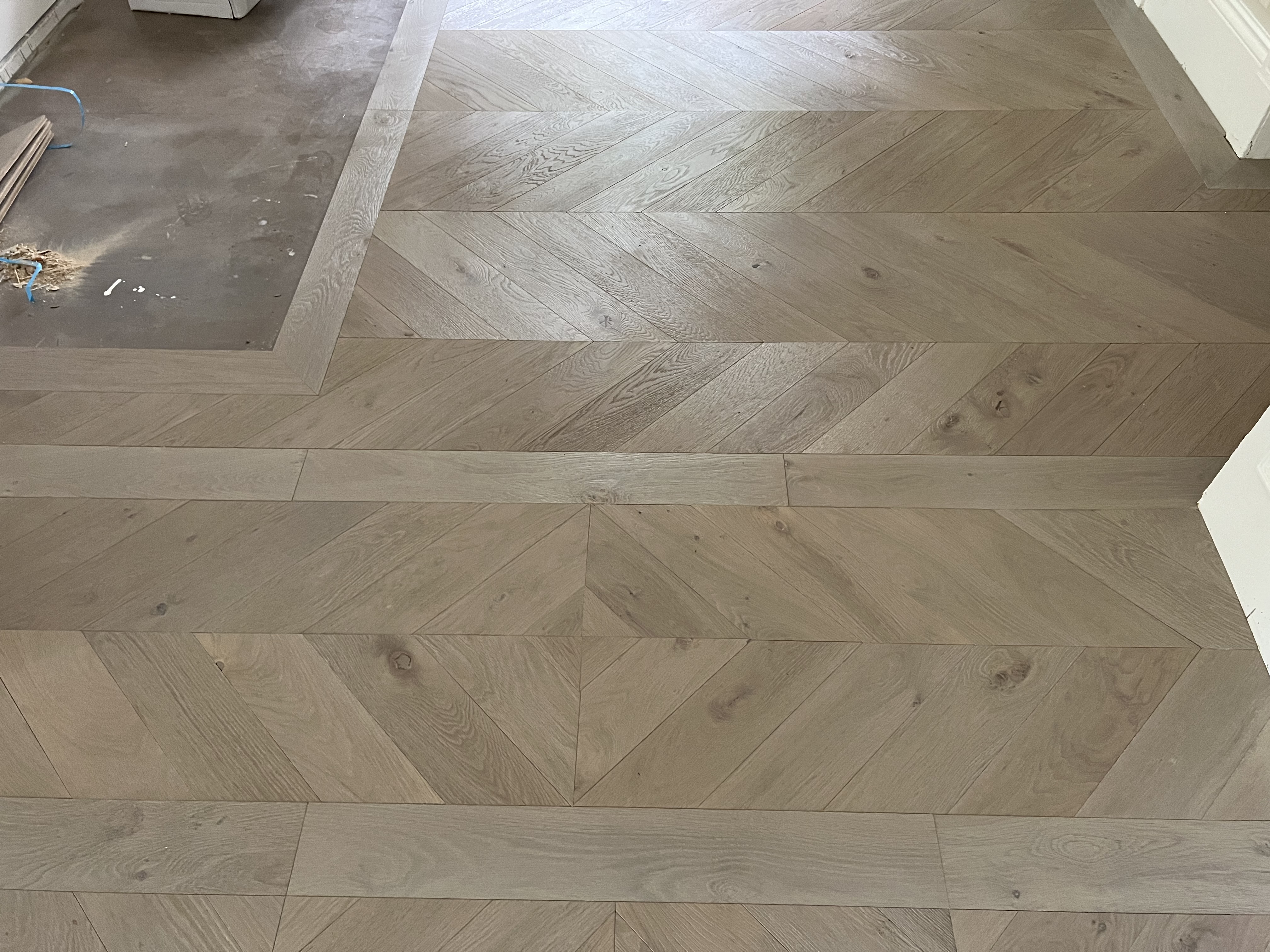 A fabulous project working with FBC London for a client in the North East. A custom sized cheveron in a bespoke colour to match FBC exact specification. Complicated sub floor preparation which we undertook to allow us to install to this great house on its way to becoming a fabulous home. Transition detailing between the entrace from the from door into the start of the living space adds real individuality to the home.