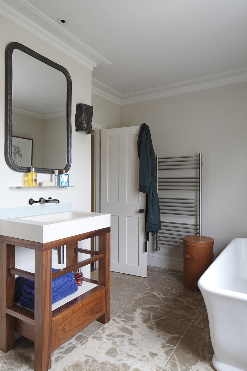 Bespoke elements were introduced including unusual materials and pieces, such as the giant air route map wallpaper, blue lacquer, walnut and smoked glass joinery, polished black nickel brassware and copper detailing on the stone fire surround.