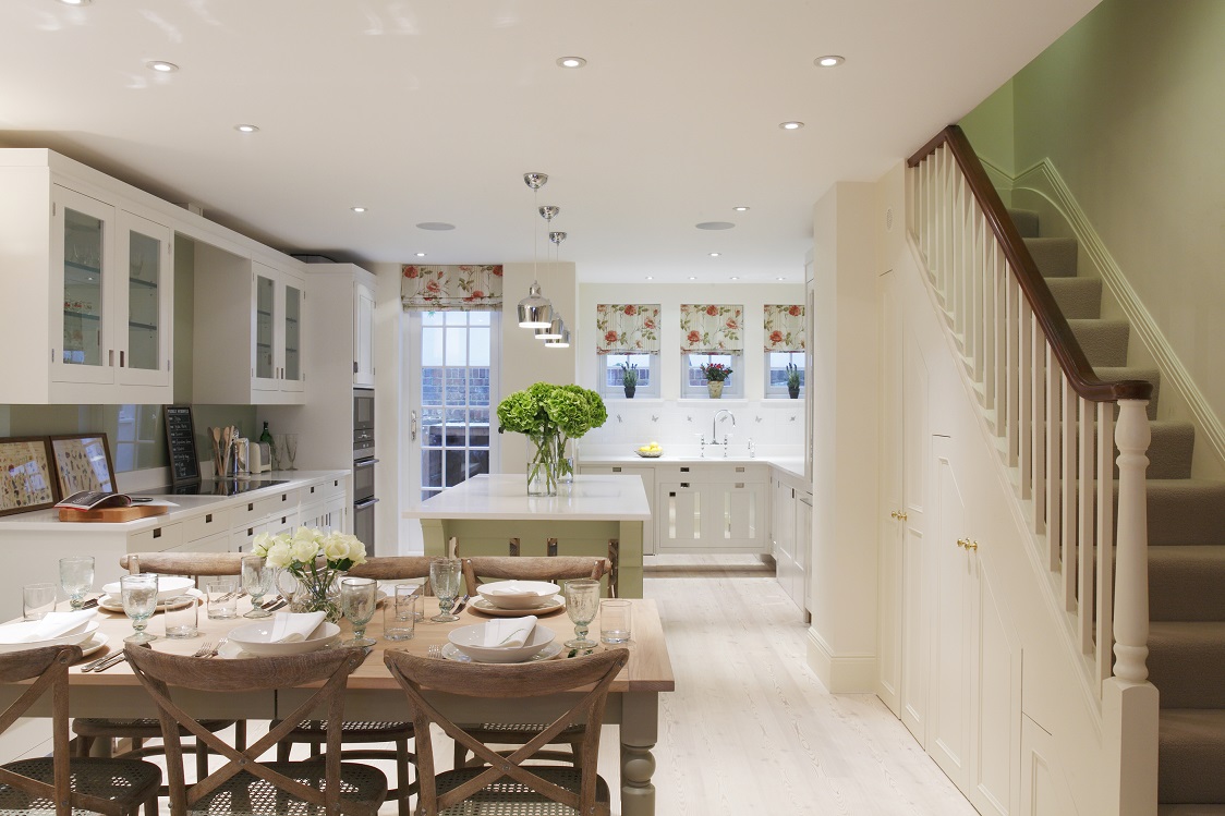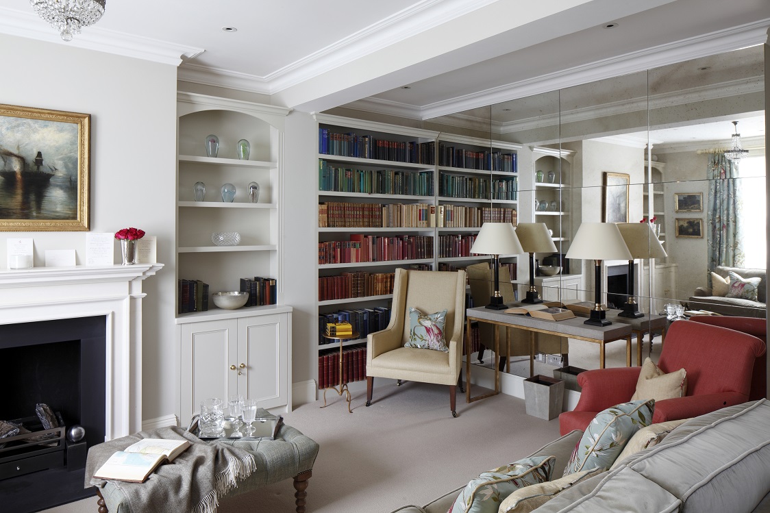 This 1500 sq ft Victorian Townhouse in Notting Hill was transformed into a beautiful family home spread over 3 floors with an elegant country feel. The interior was designed to create a welcoming and cosy space for everyday living and entertaining. The open plan kitchen, dining and living space is highlighted by a bespoke kitchen and a fresh complimentary colour palette. The first floor reception is doubled in size by a wall panelled in antique distressed mirror which accentuates the bookshelves adorned with colourful antique books next to a classic fireplace.