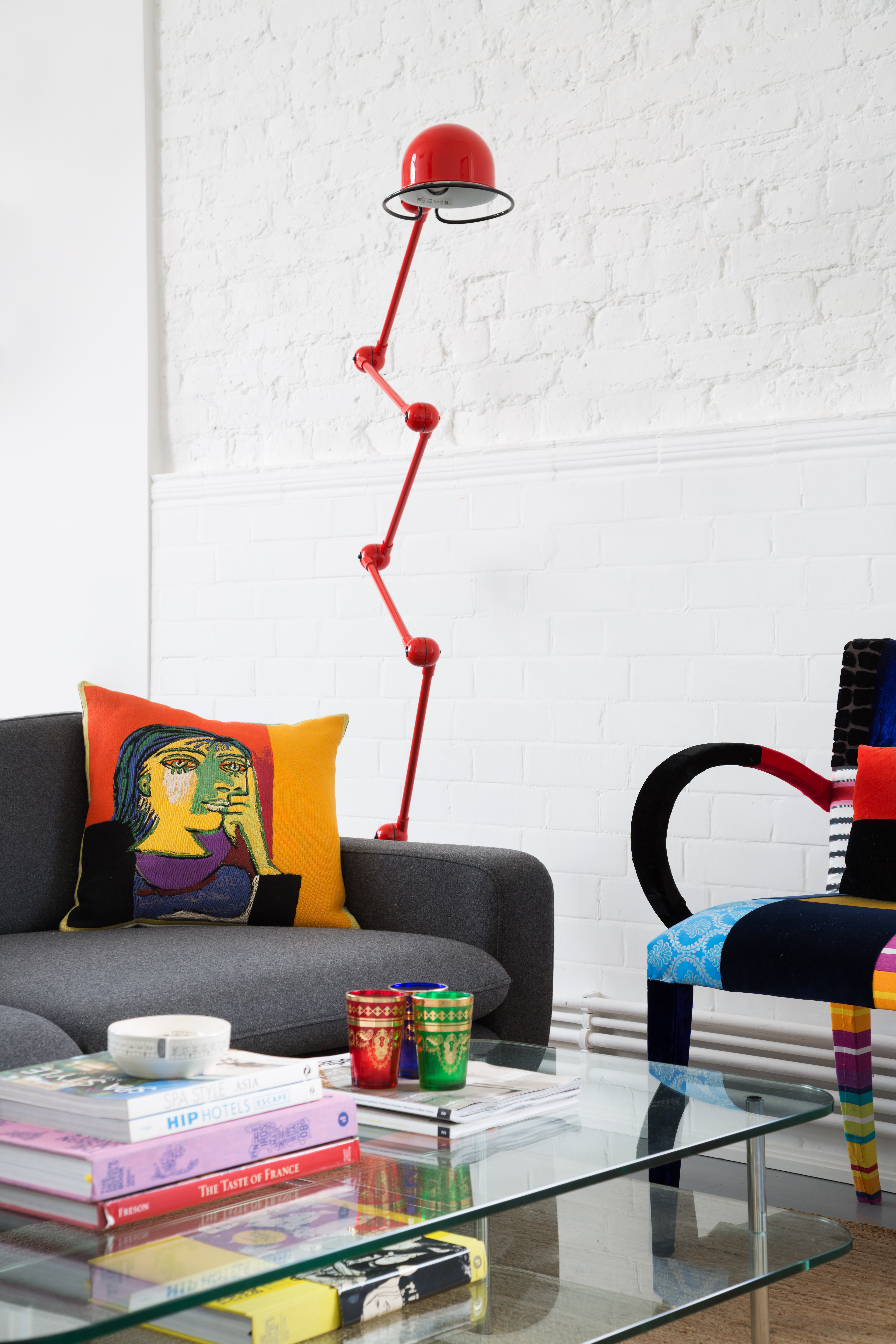 The most significant change was to move the kitchen from the living room into a storeroom. This required planning permission for the necessary ventilation and compartmentalisation, which had to be carefully executed so as not to introduce a visual intrusion on the Victorian exterior. For the actual kitchen, we wanted a “commercial kitchen” feel to reflect the client’s day-job, so installed a bespoke stainless-steel worktop to fit over standard Ikea units. There was nothing in the budget (and no time to change) the vast and badly damaged laminate floor, so we decided to use a floor paint to brighten the space up and create a neutral backdrop for the colourful rugs and soft furnishings. New steel radiators were fitted. Chrome wall lights enhanced the warehouse feel, and the mid-century modern furniture had a solid quality that helped to fill the double height space. There are some local pieces too from East London boutiques and furniture makers.