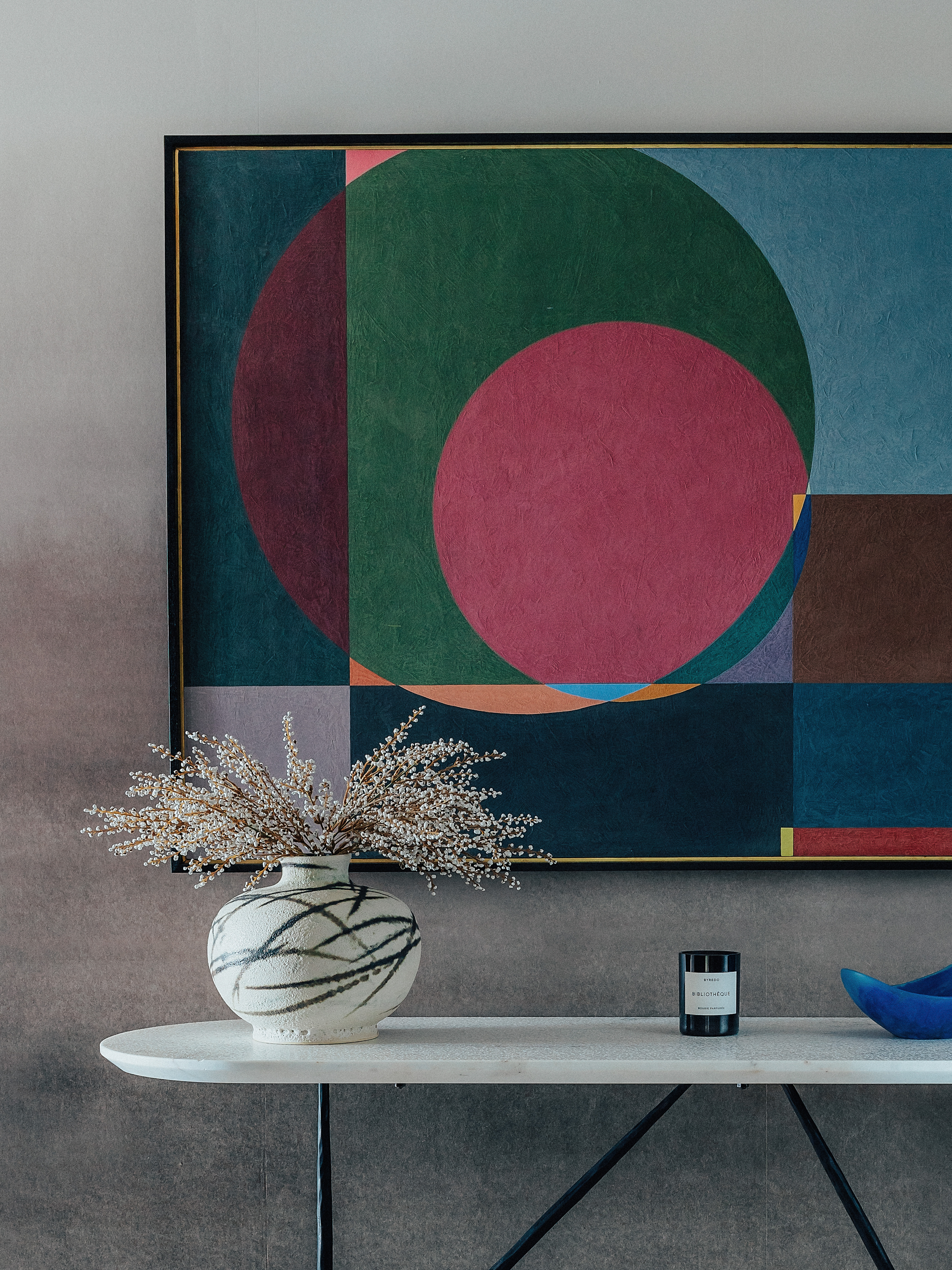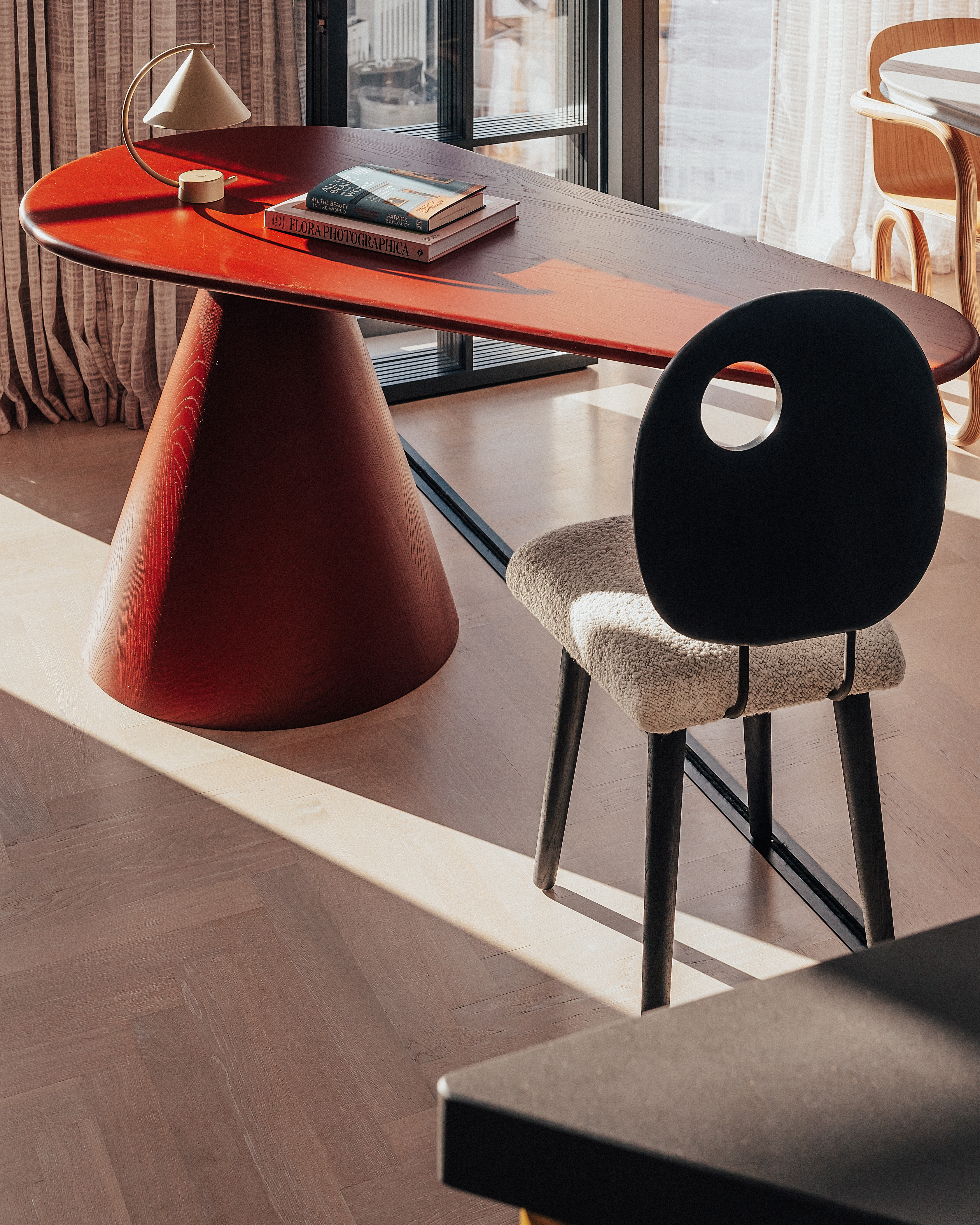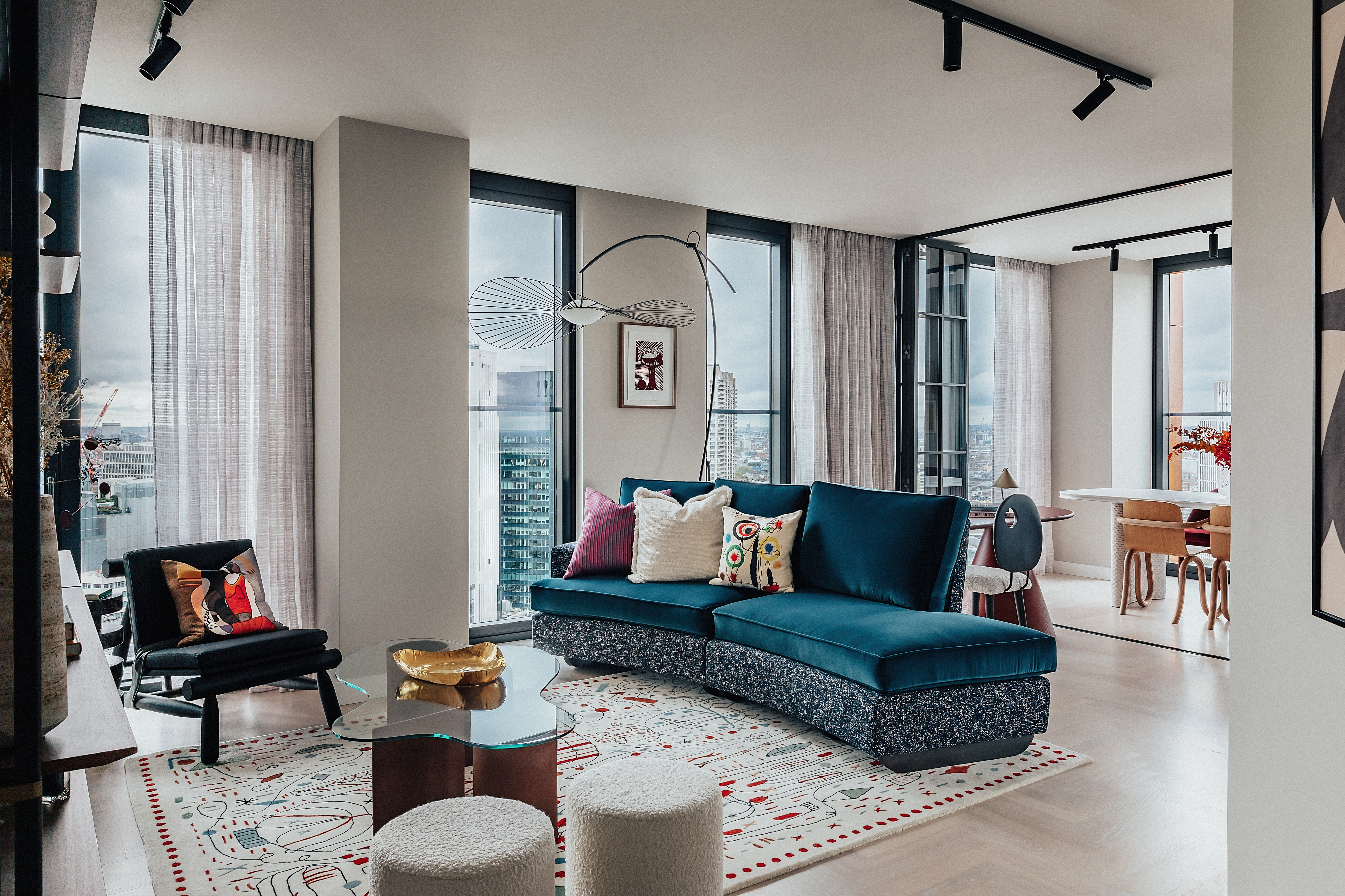 Triptych Bankside is a modern classic, as visually dynamic and architecturally uncompromising as the nearby Tate Modern and Millennium Bridge. It ripples, glistens and shines, qualities that have inspired many creations – from a light-reflecting dining table to a zigzagging sofa that provides multi-aspect seating. Other design highlights include a coffee table of hand-crafted travertine rosso slabs, and a spot table of handblown glass, which, when the light hits, casts liquid-green shadows across the floor.