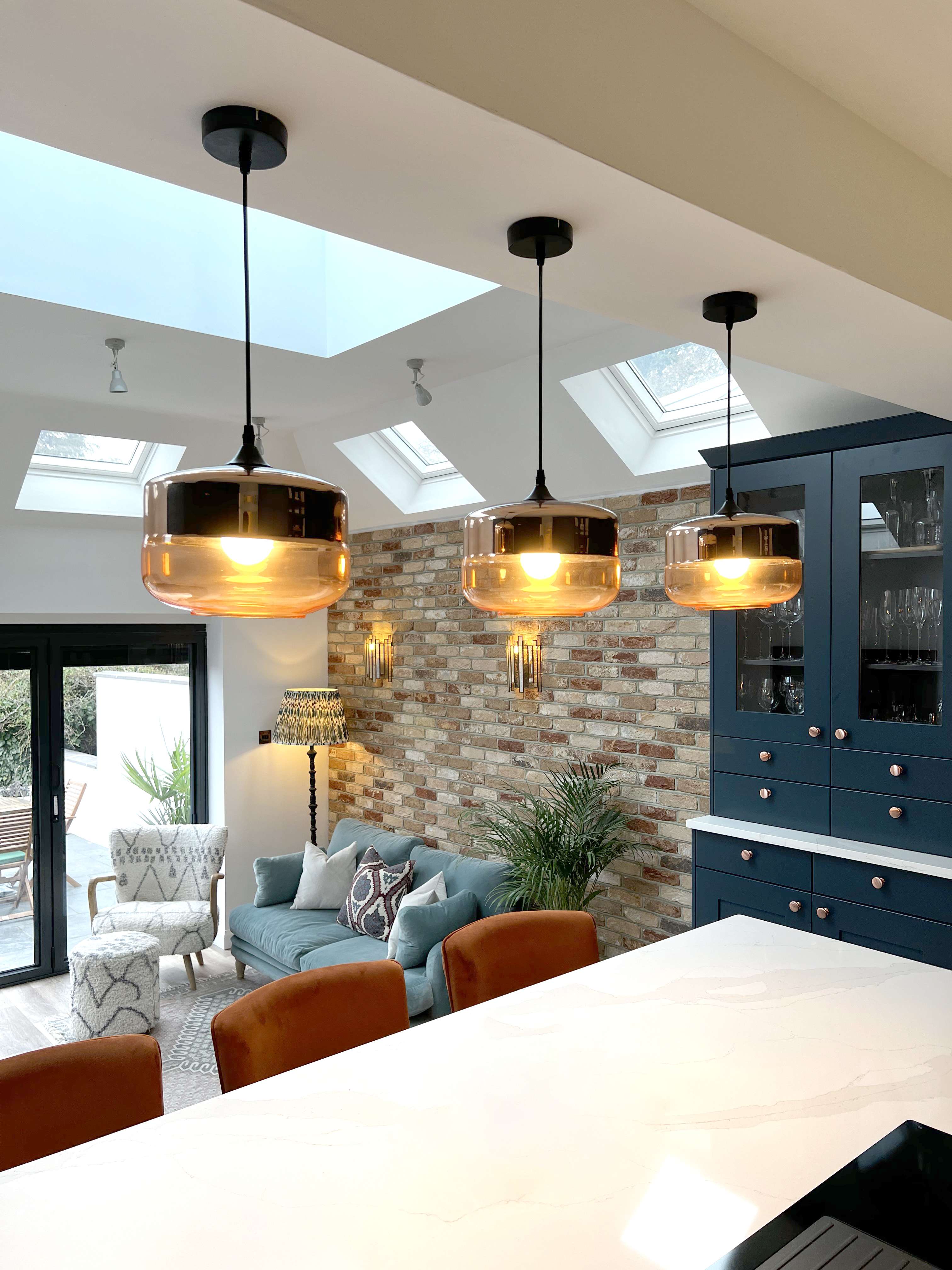 Texture was really important to zone the new open plan areas. The kitchen provided the backdrop, in a deep blue, bringing in tones of copper and warm brass through ironmongery and light fittings. While a warm internal brick texture frames the seating area and brings the warm copper tones onto the walls.