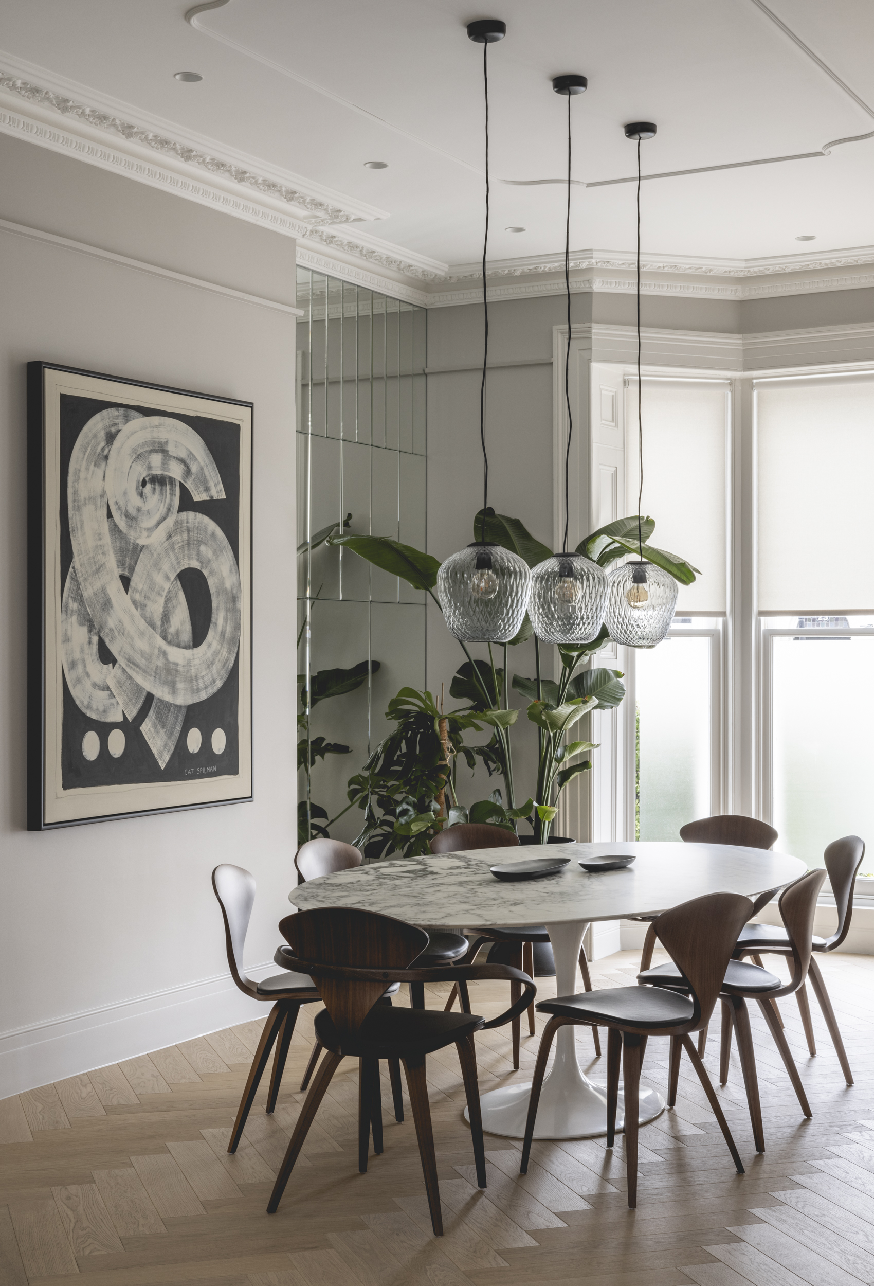 Indulge in the perfect blend of modern and mid-century aesthetics in the stylish dining area. The legendary Saarinen table with marble tabletop, wooden chairs, and captivating black-and-white artwork create an inviting space.