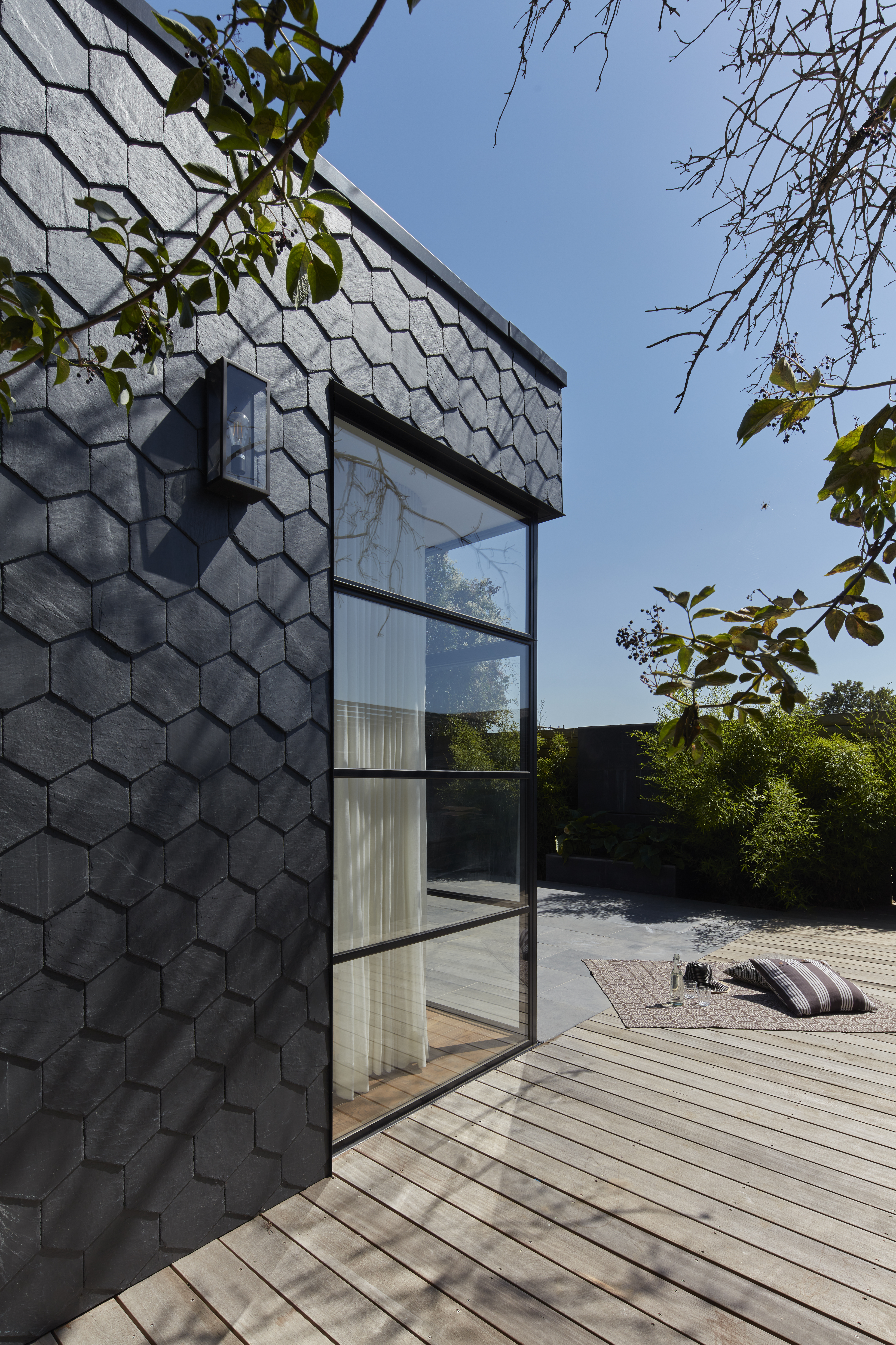 The Coach House has been designed with traditional proportions and materials to the street façade. This contrasts with the rear of the property, which features sharp detailing and hexagonal slate cladding to both the side and the rear extensions. This glitters in the sun and sets off the black limestone and hardwood decking of the garden.