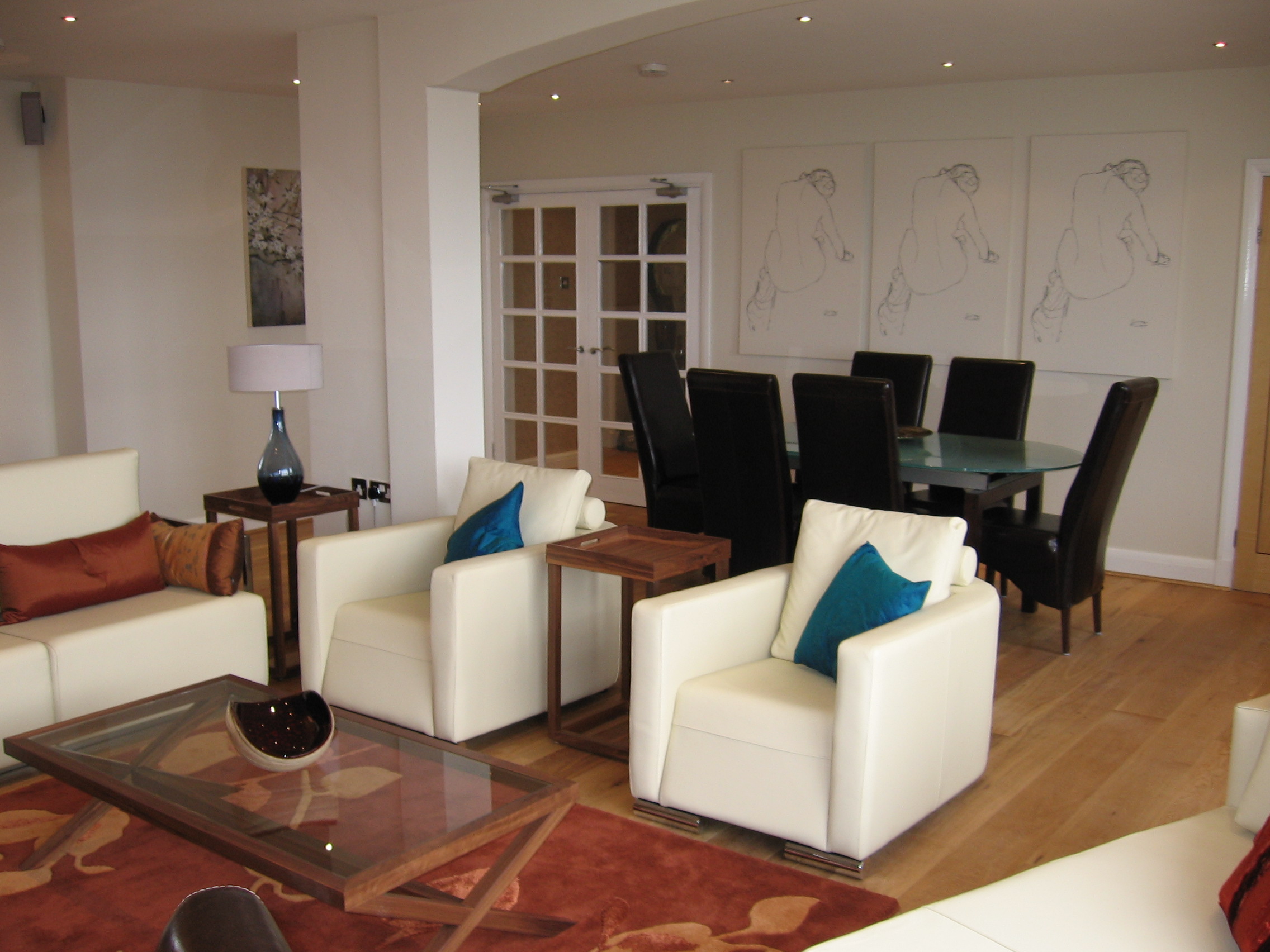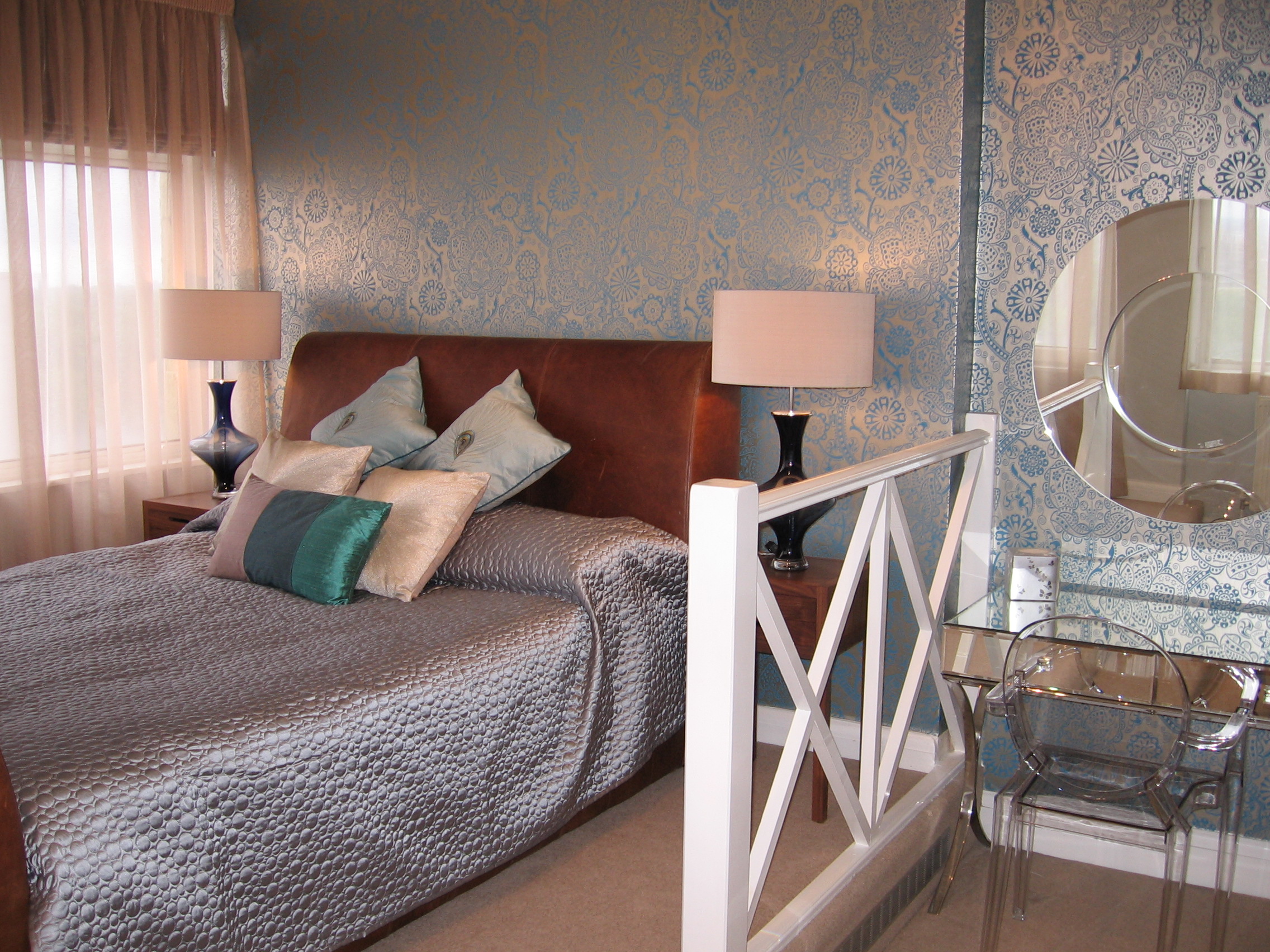 The property was tired and dated and lacked any cohesion and personality. Where possible the bedroom furniture was to be re-used and certain other pieces of furniture retained. A new oak floor was laid throughout the main living spaces; the bedrooms, which were re-carpeted and new tiles were laid in the new master bedroom en-suite and kitchen. All the windows received new window treatments more in fitting with the value of the property. The main lighting was already in place and added depth and interest was created with new table, floor and bedside lamps. In the bedrooms, new furniture was added where necessary, dramatic impact was created with feature walls, and a cohesive look with new bed coverings, cushions and artwork. The master bedroom suffered from poor layout with a high raised platform. This was turned into a feature with the re-positioning of the bed, to make the most of the stunning views, and a new half step and balustrade added.