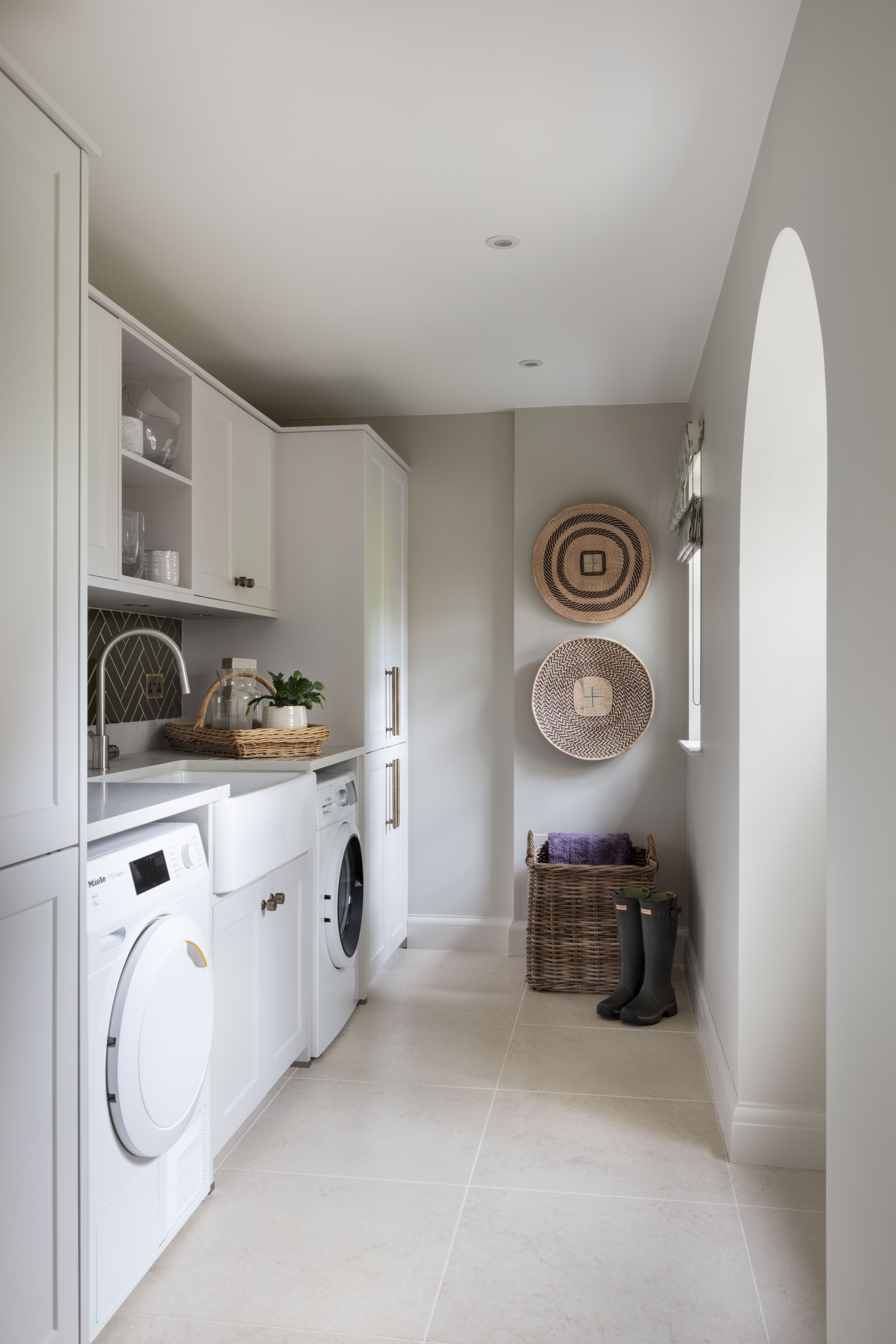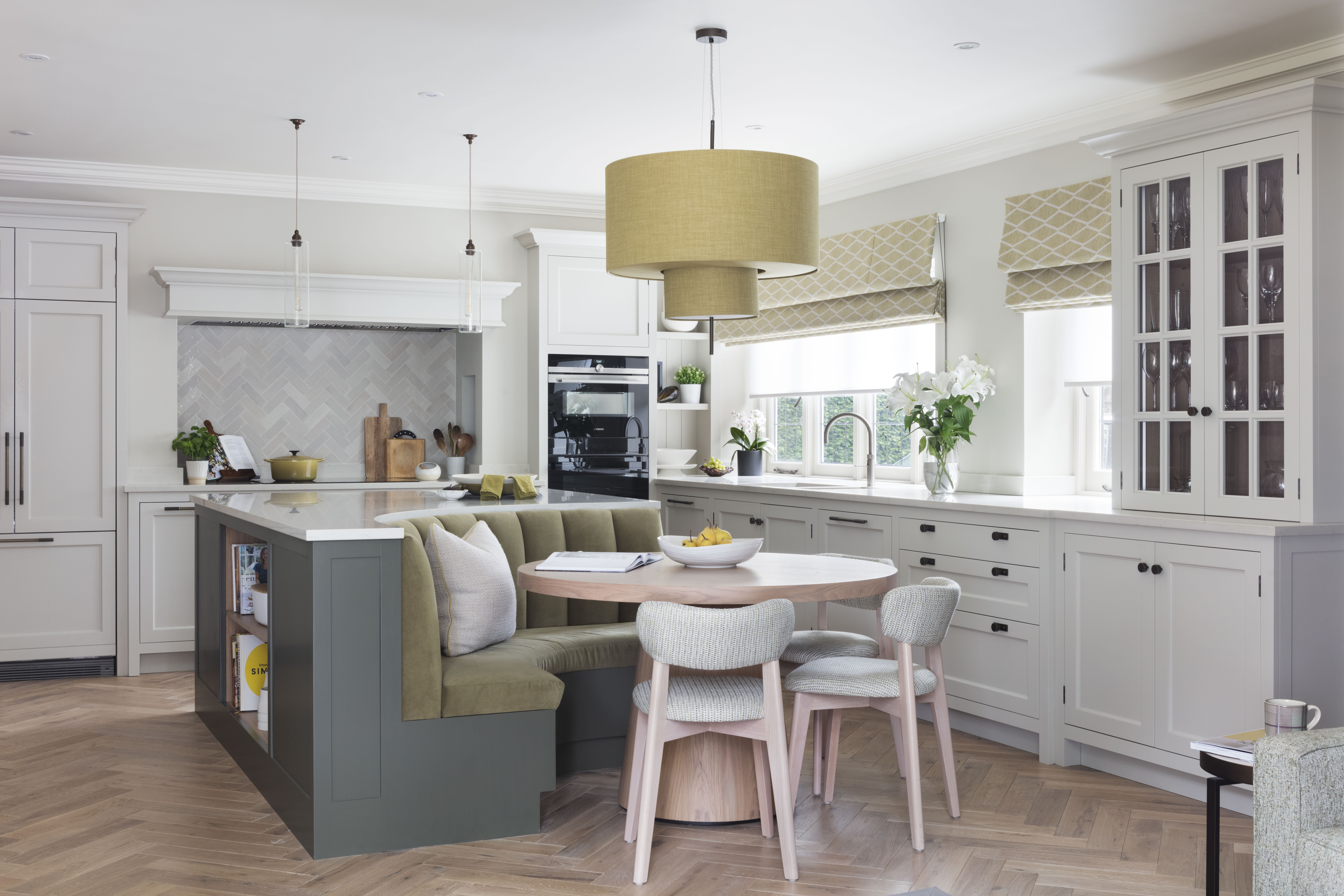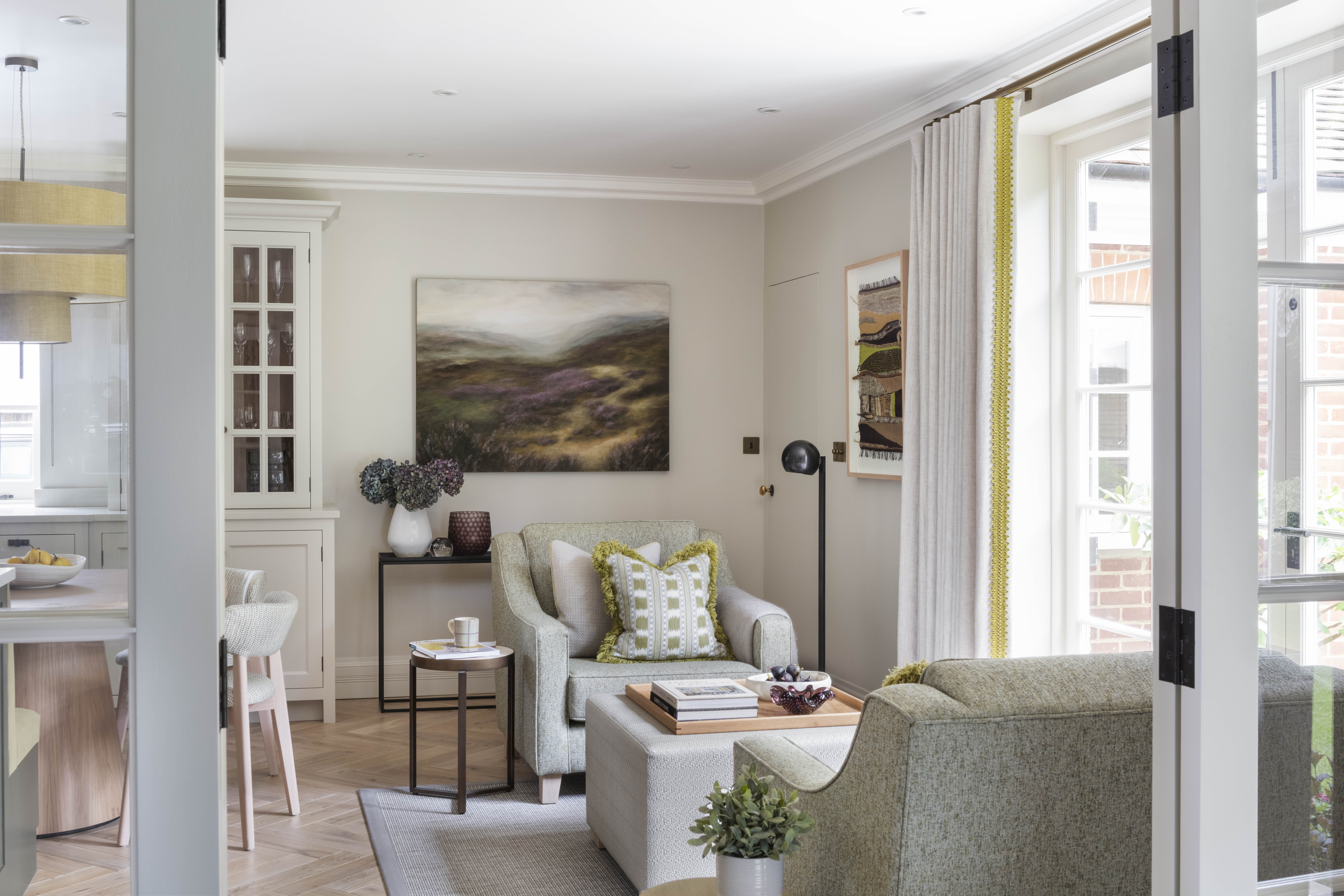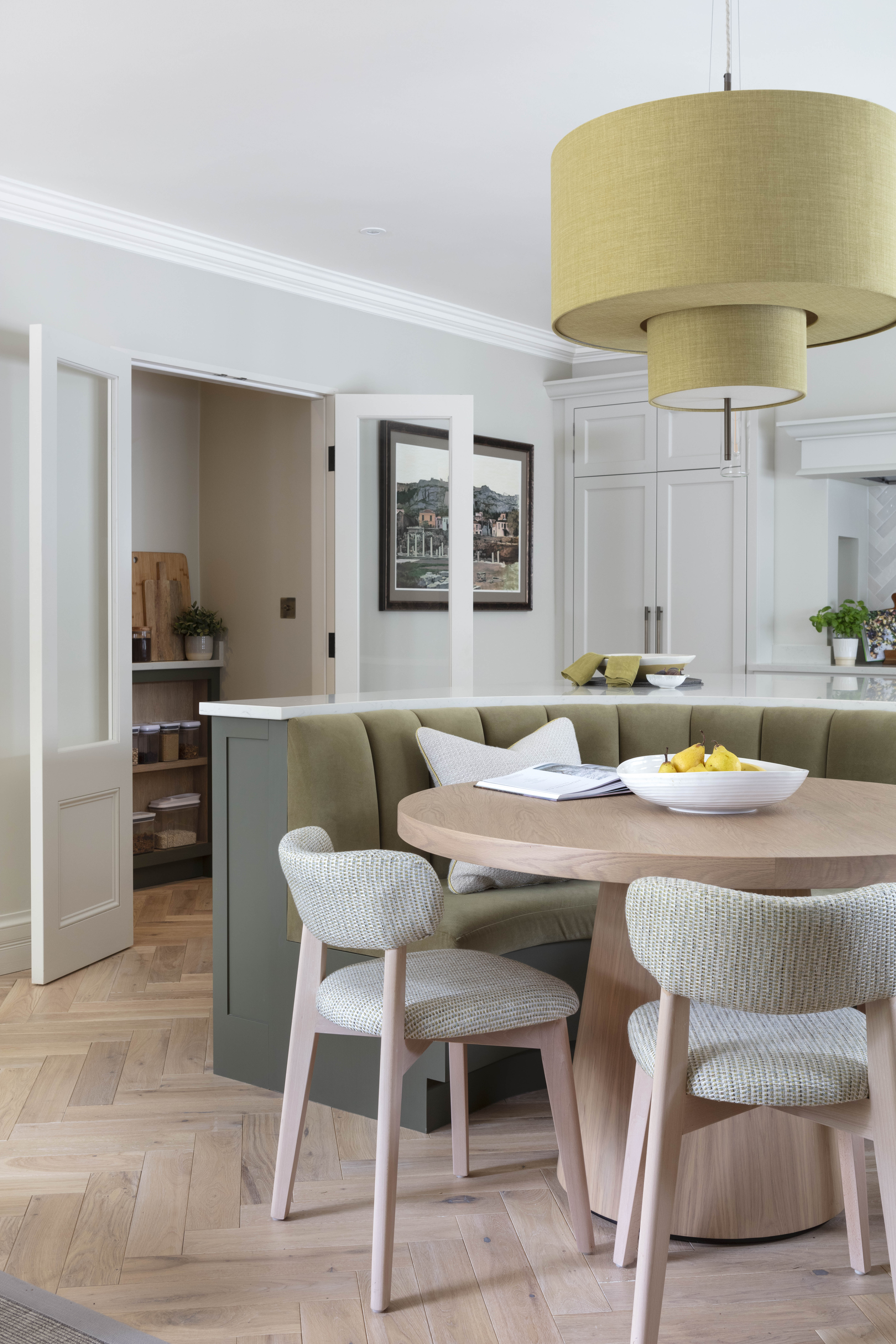 Our recent kitchen renovation project on Parkside is a true transformation of a space that was once dull and outdated. The focal point of this renovation was the replacement of a large dining area window with stunning bespoke French doors leading out to the garden, and panelled internal doors leading from hallway to kitchen. The kitchen re-design effortlessly integrates two deep and cosy amchairs and a large faux leather ottoman, alongside a bespoke, deeply curved green velvet banquette seating area, perfect for entertaining guests or enjoying a cozy family meal. The contemporary shaker style kitchen was a perfect choice for this home, with its simple, clean lines and timeless appeal. Inspired by our clients’ large and rather gorgeous Scottish Moors painting, we introduced fabrics in various shades of green, blue and heathery purples to complement their artwork. Overall, this kitchen renovation in Wimbledon was a true success, transforming an underwhelming and outdated design into an overwhelming joyous social space - the heart of their home.
