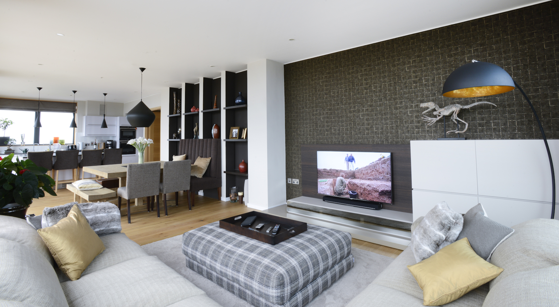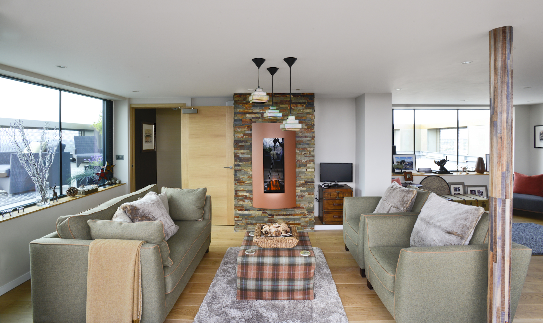 The interior has been designed to complement the view from the room-height glazed panels using natural materials and a variety of textures.