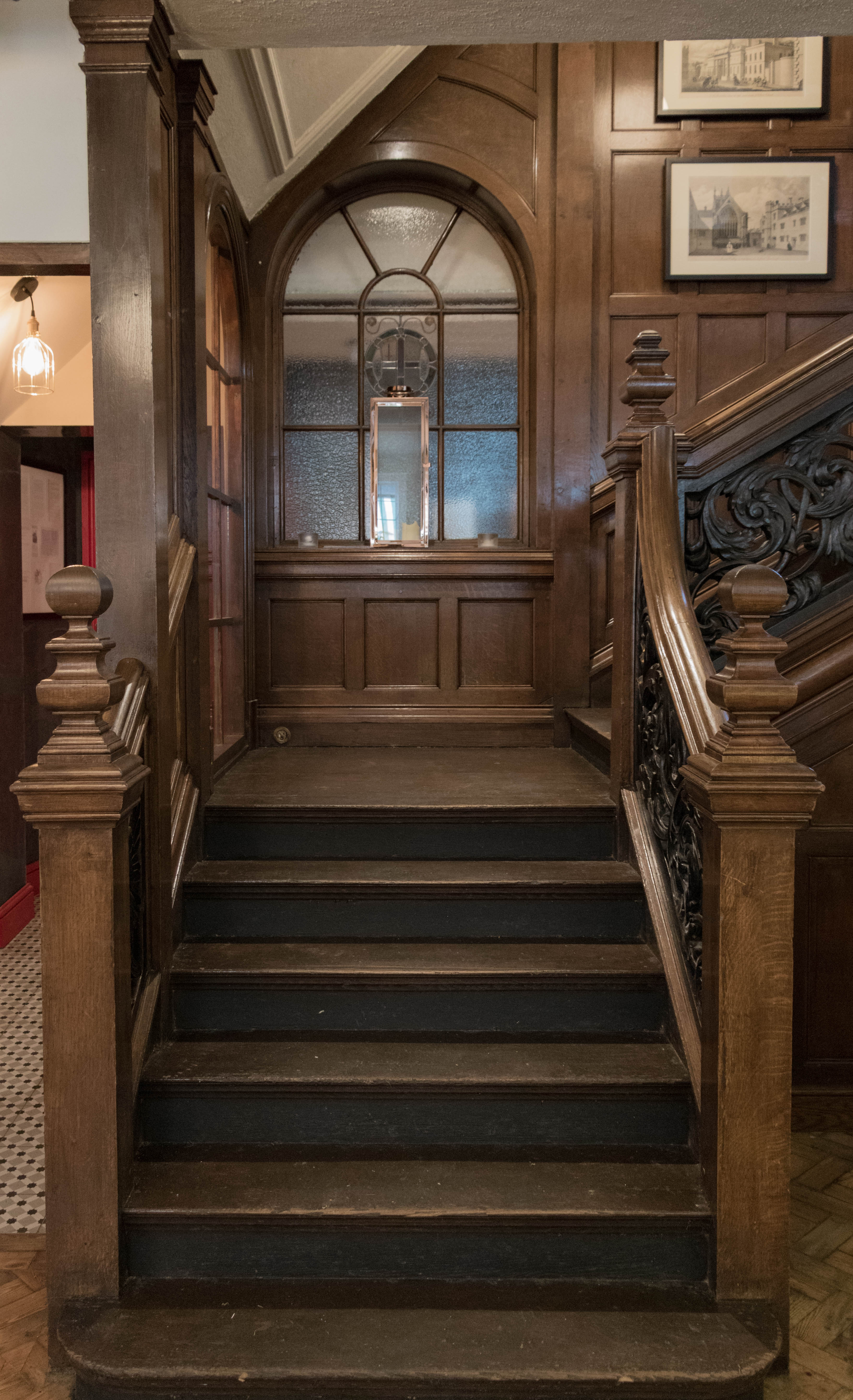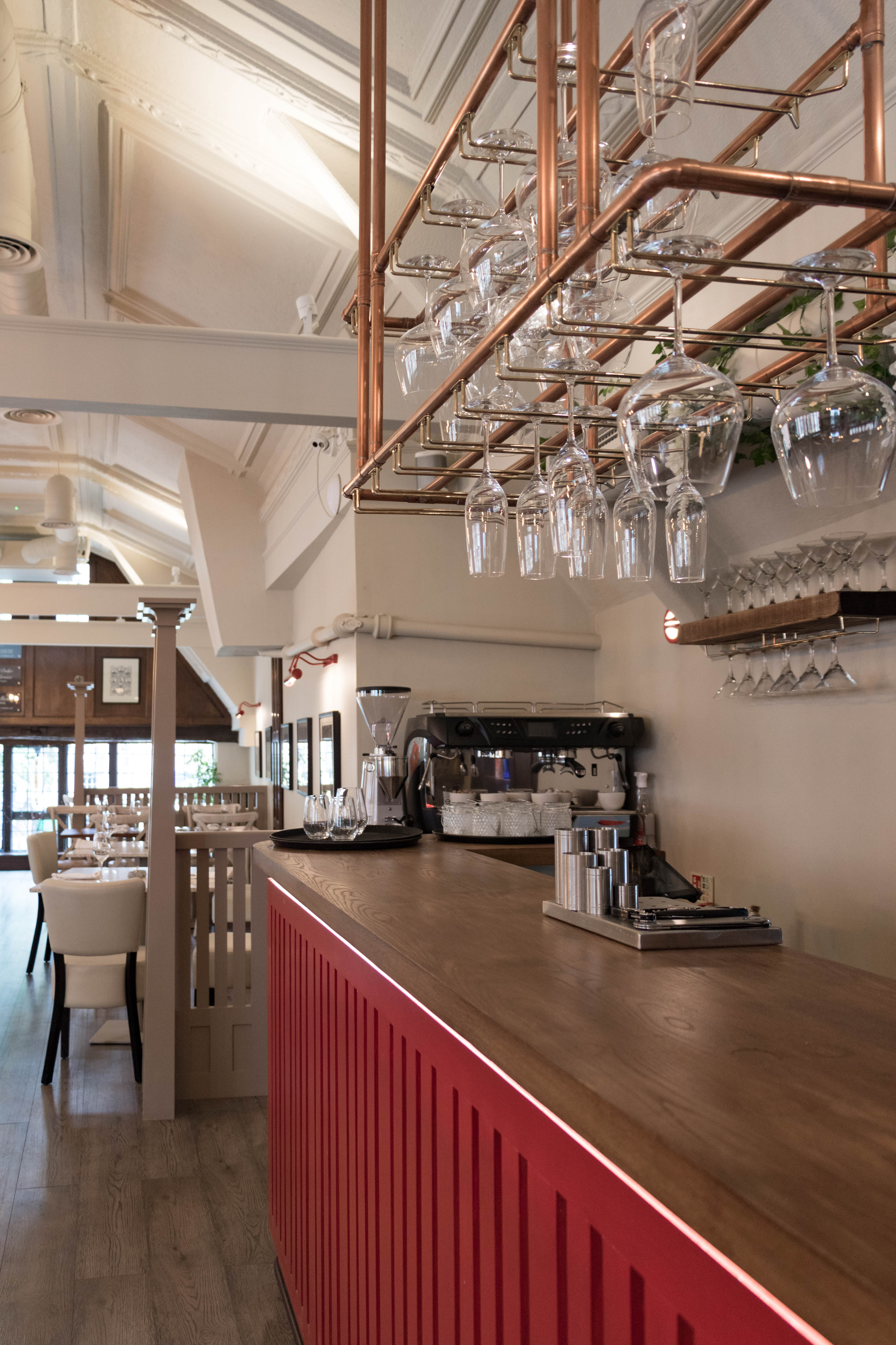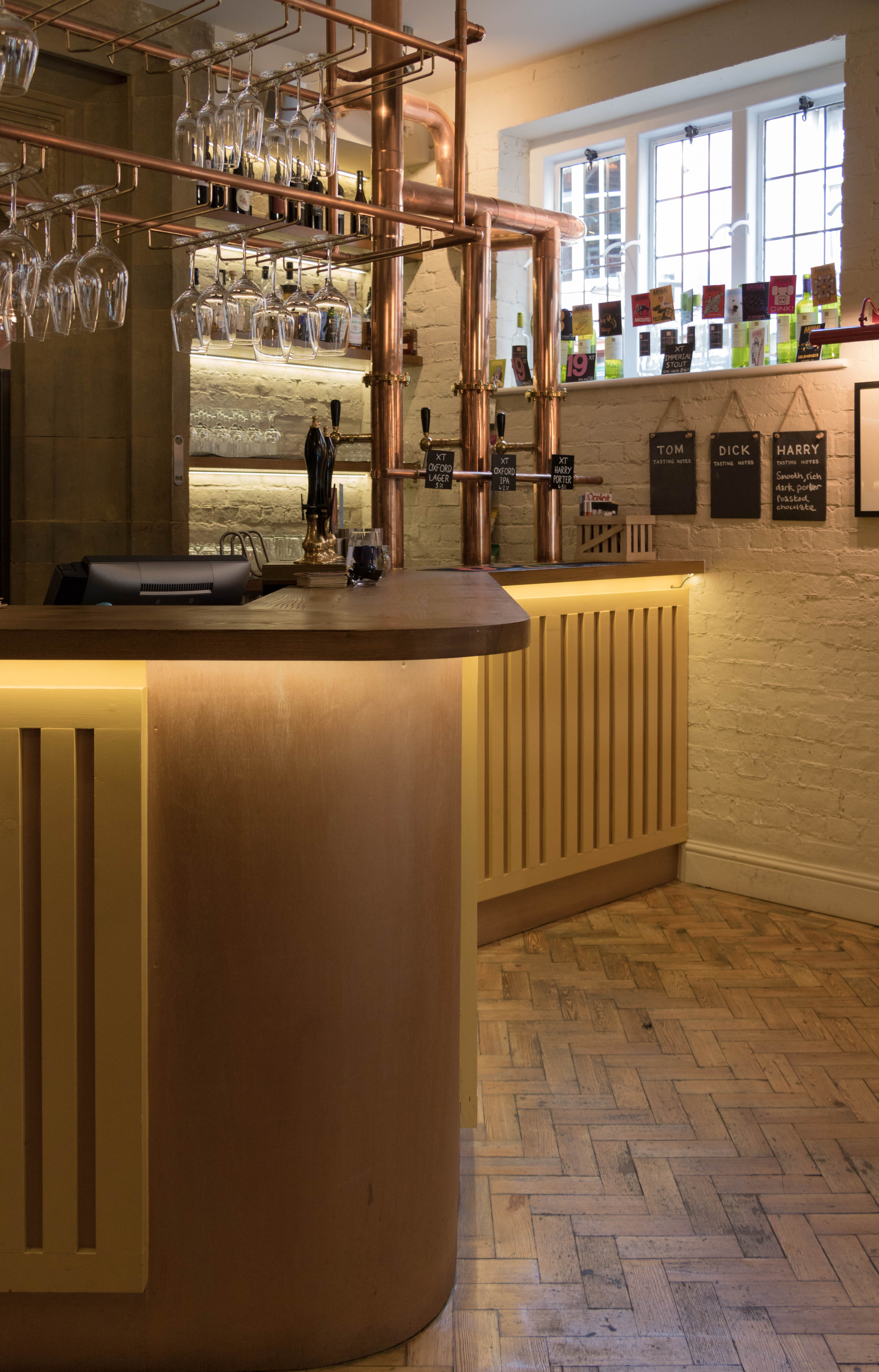 All of the bar joinery was designed and detailed by Element, using natural materials such as wood and copper. This along with the bespoke banquette seating, was designed to complement the existing Arts & Crafts elements in the building. Light fittings were chosen and colour coded to match the furniture, with a different arrangement downstairs to the first floor so that they related to one another but also felt different: more formal eating upstairs and a café/bar atmosphere on the ground floor.