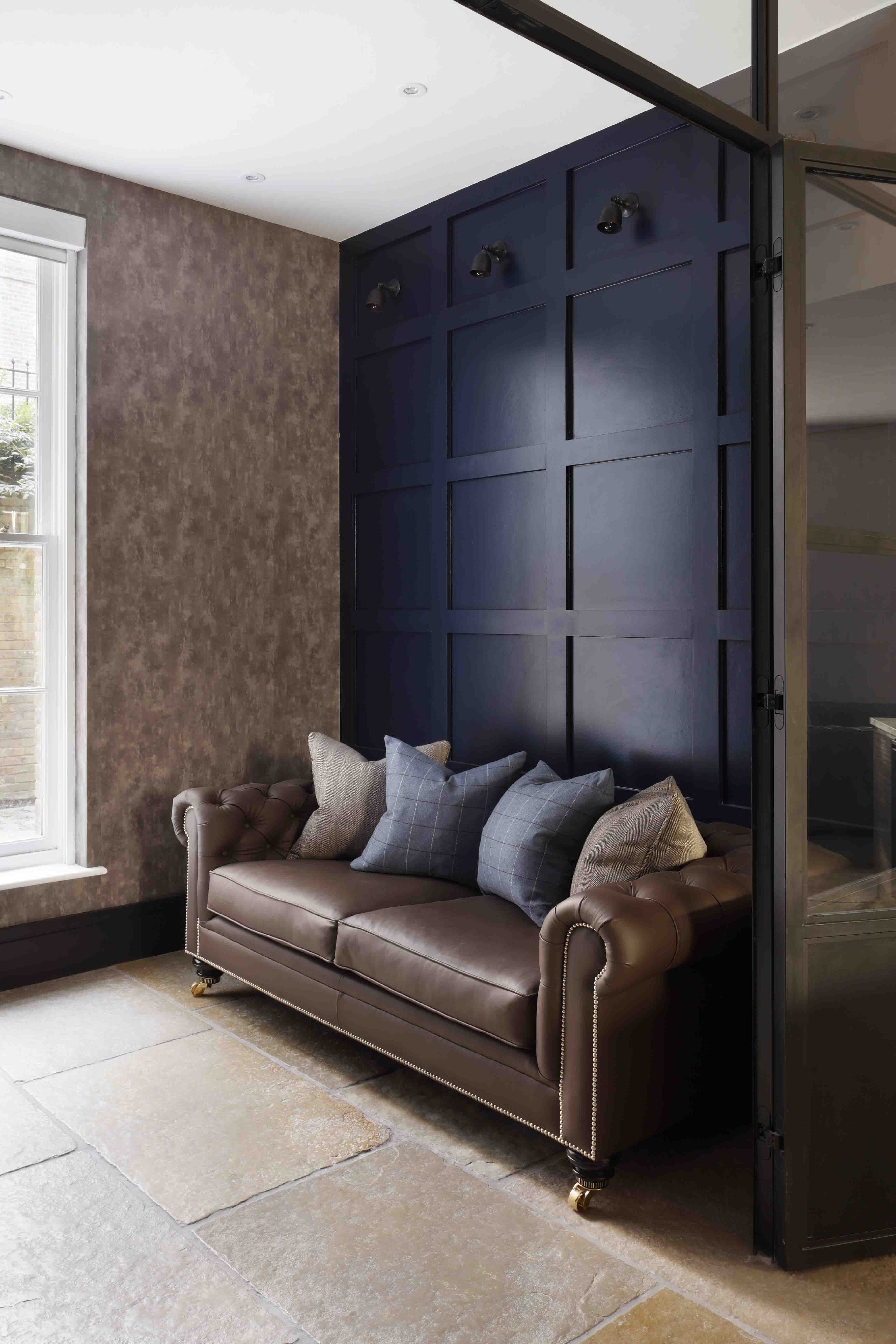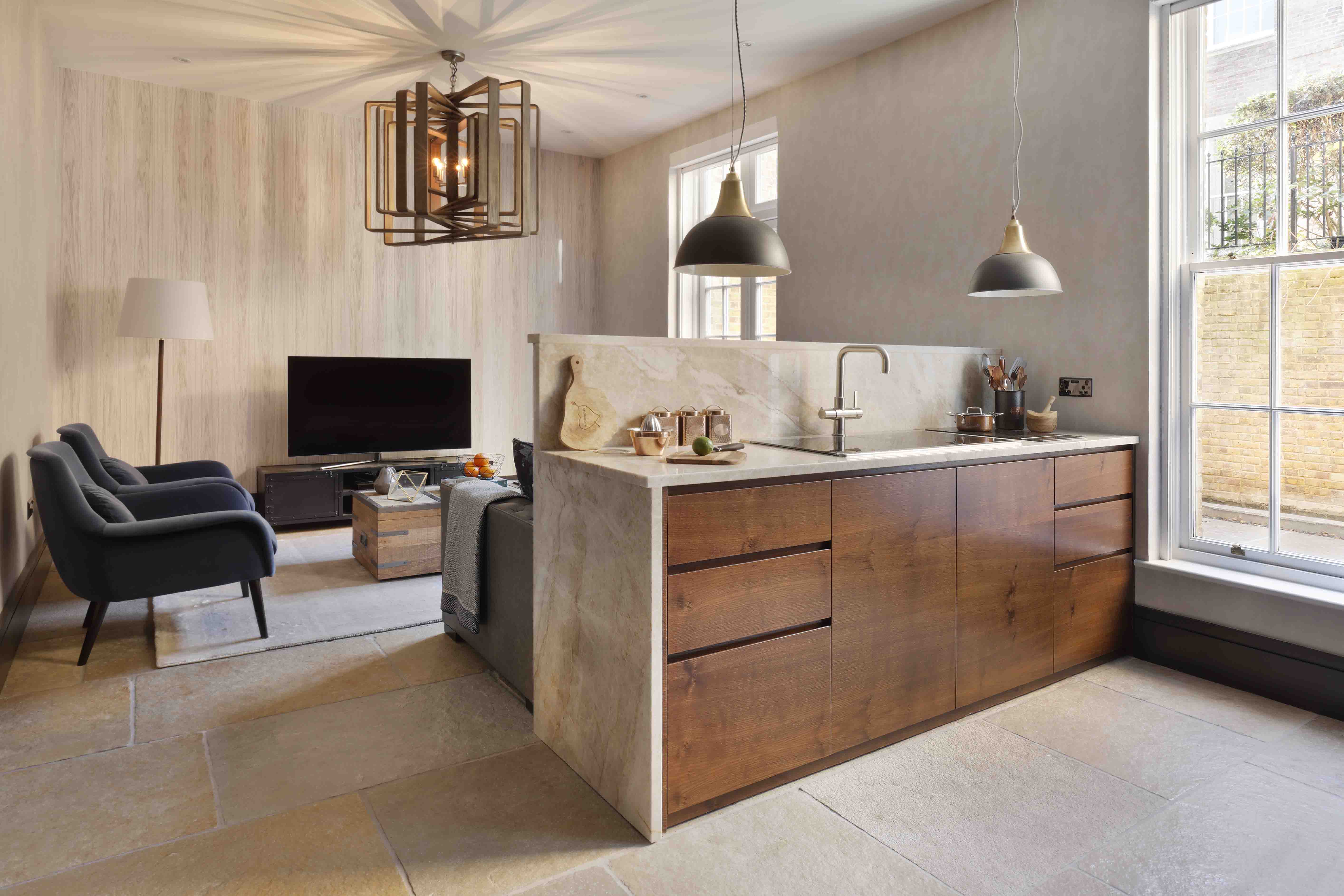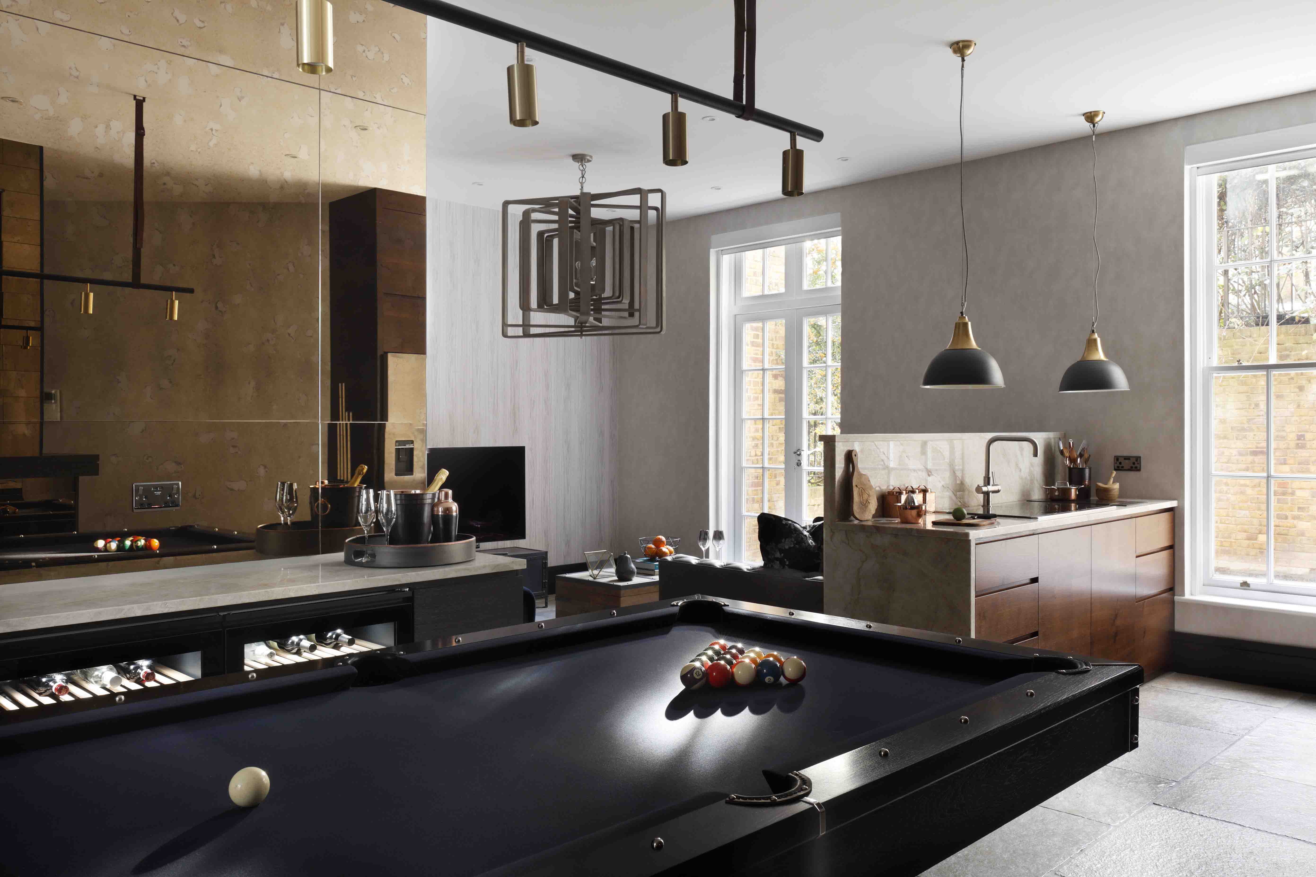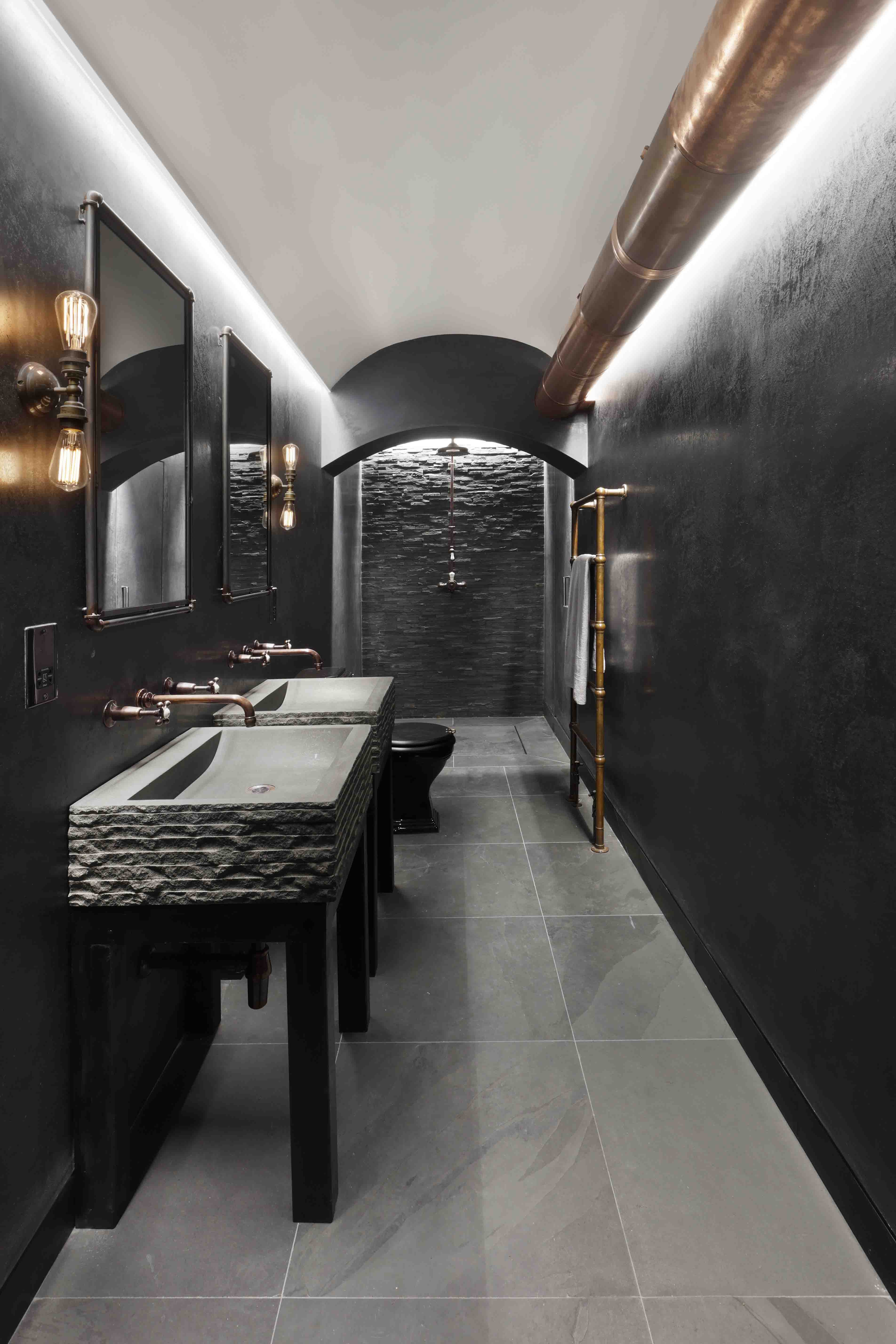 We embraced the tension between old and new, masculine and feminine. York stone flooring, original exposed brick, and slate finishes contrast beautifully with polished Taj Mahal marble worktops, antiqued bronze mirrors, and striking copper details — a combination that feels contemporary yet warm.