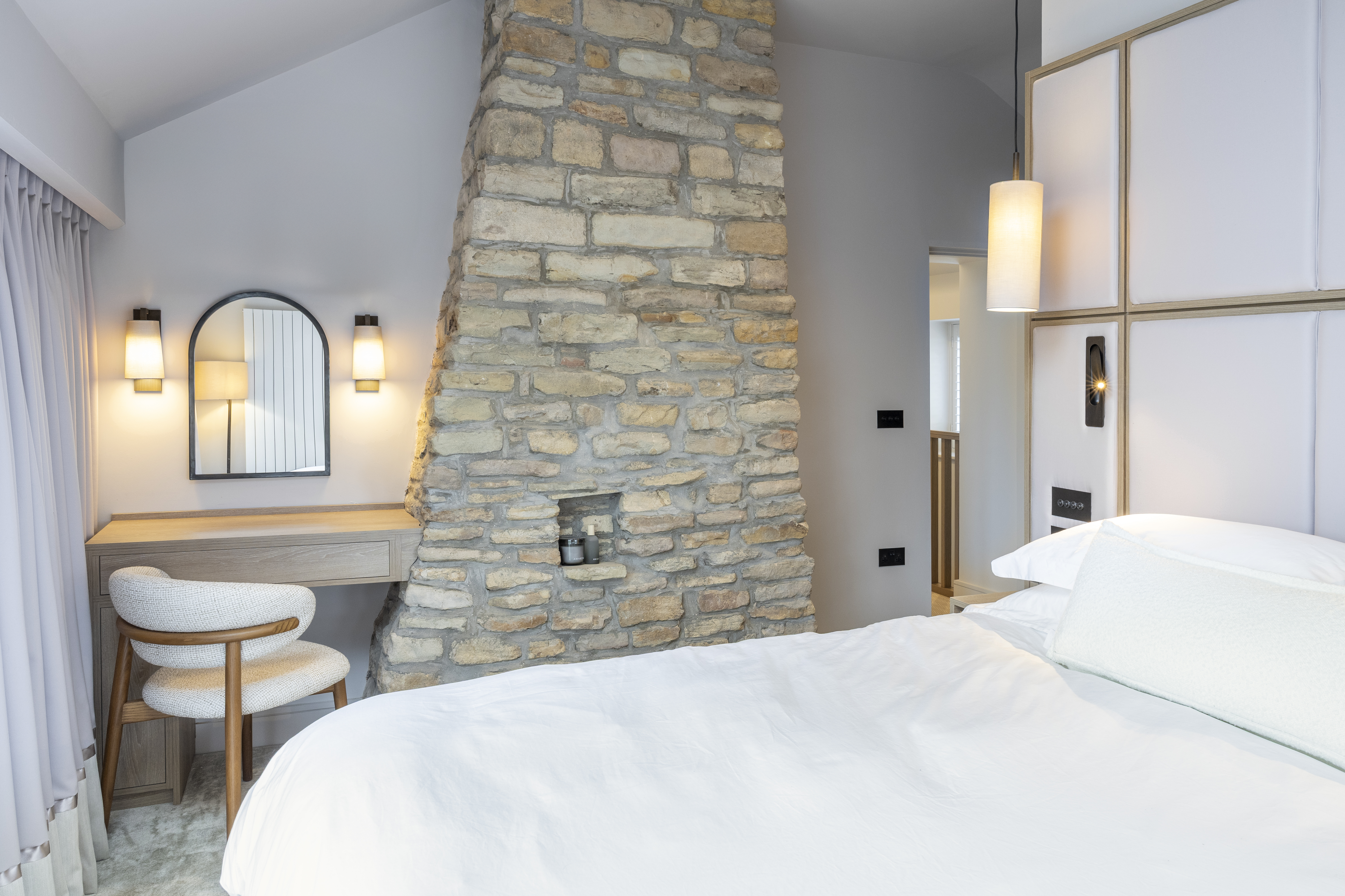 This principal suite includes a bespoke fitted dressing area, and vanity table with besopke joinery. A bespoke upholstered headboard in the bedroom area and a pocket door through to a private ensuite.