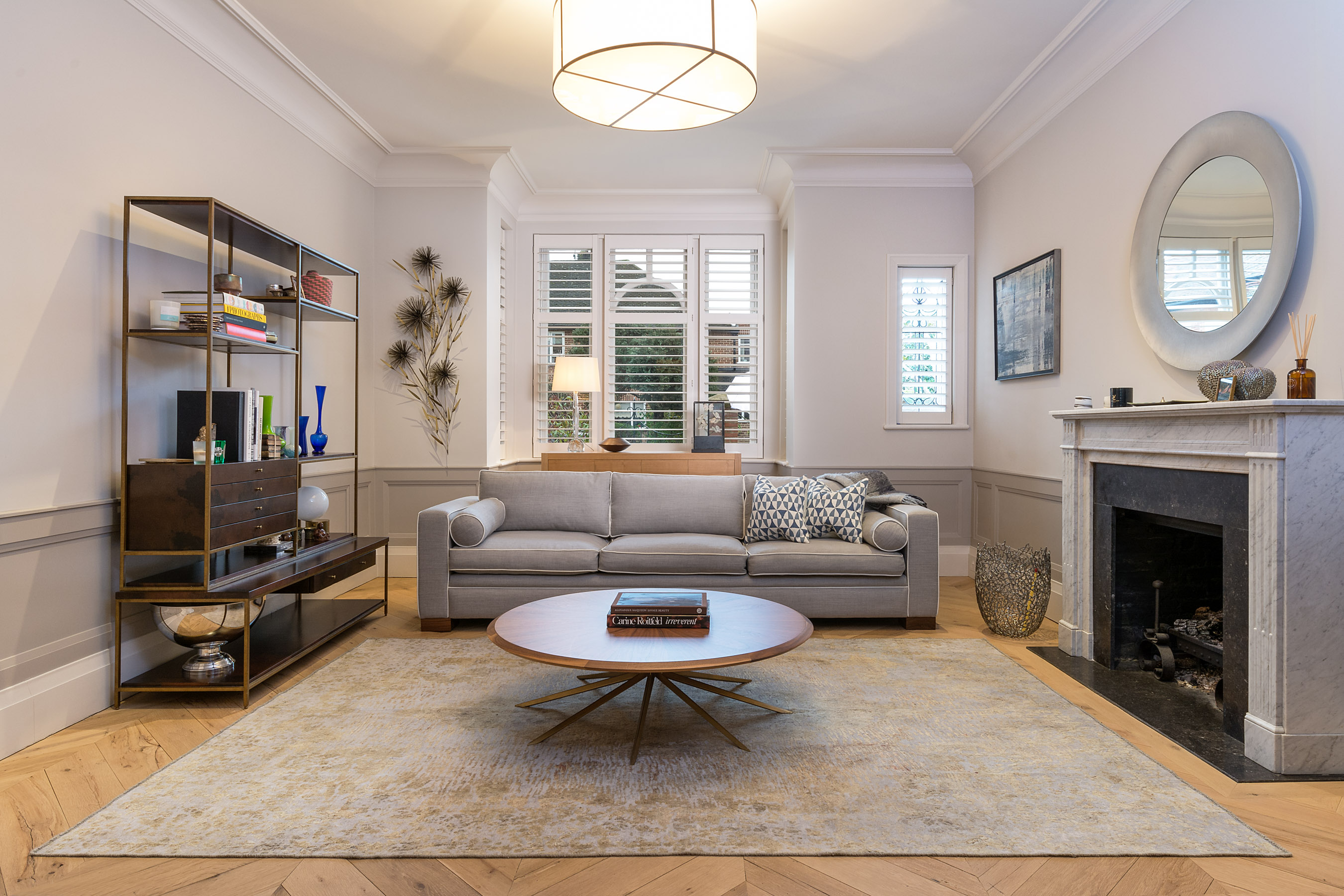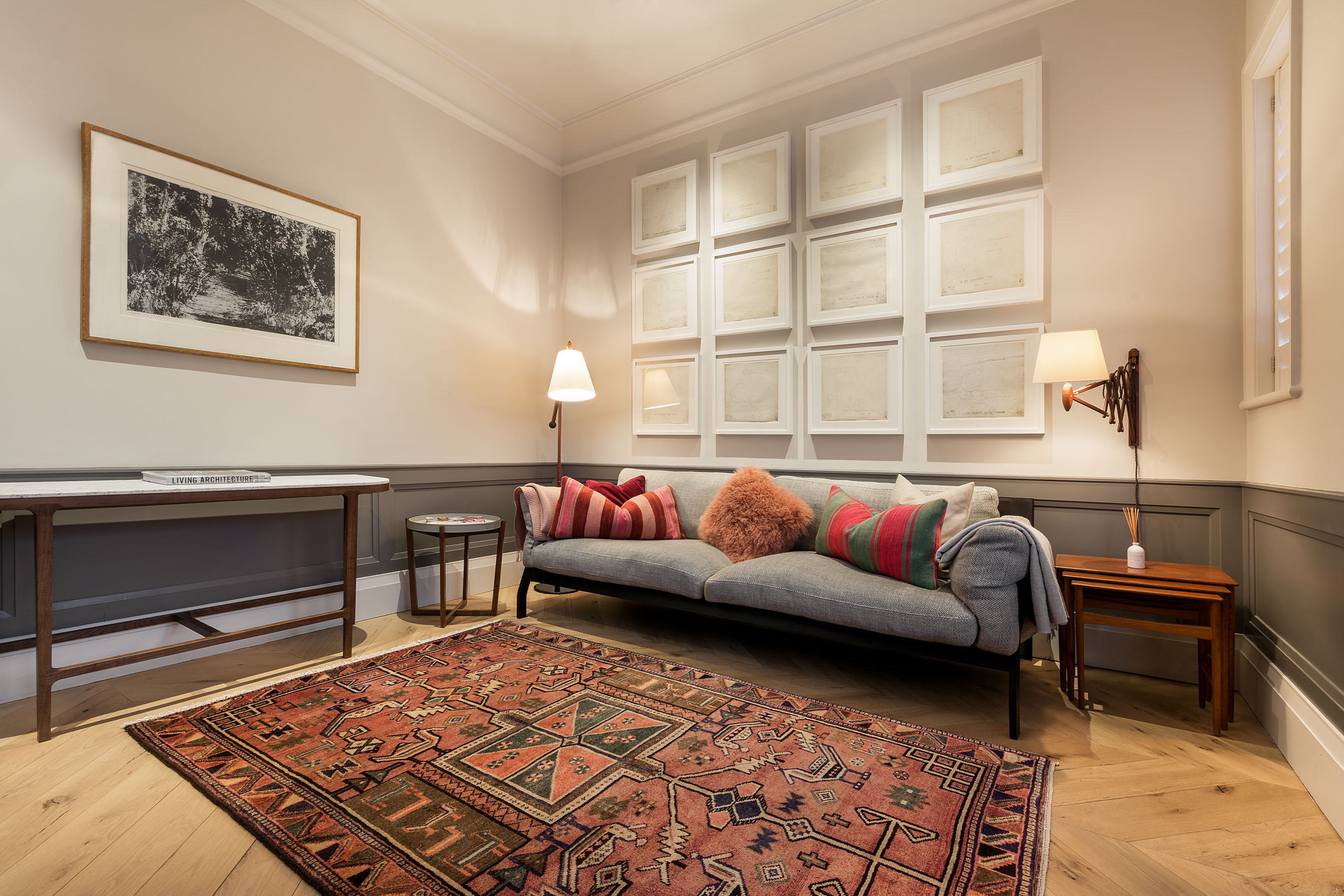 Sticking to soft colours for the formal living space. The Overdyed collection is perfect for a period home that still has many beautiful old features, but needs to feel current and fresh. A Persian overdyed rug is exactly that.