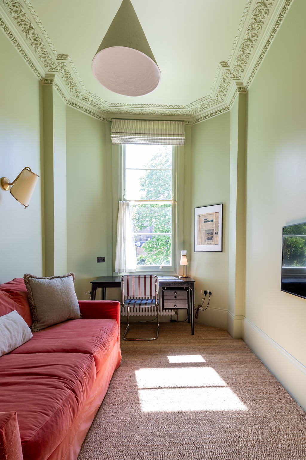 A welcoming study space painted in soft pastel green, which creates a refreshing and calming atmosphere. The ornate crown moulding along the ceiling adds an exquisite touch of elegance.