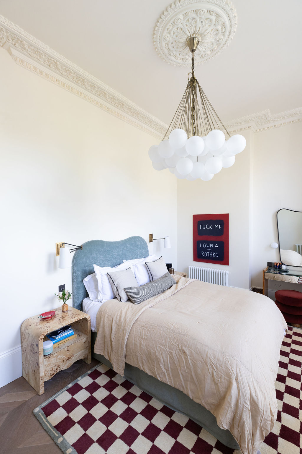 A timeless main bedroom exudes a sense of elegance and comfort, featuring a harmonious blend of classic and modern design elements. A vibrant red and white checkered area rug adds a playful pop of colour and pattern, creating visual interest and complementing the rich wood tones of the herringbone floor.