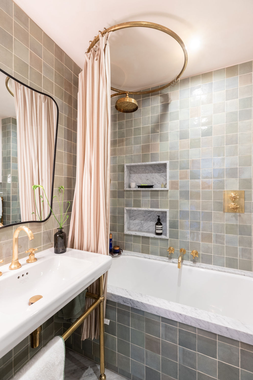 A round brass shower curtain rod and the brass rain shower head echoes the bathroom’s gold accents, ensuring a cohesive look that ties the entire space together.