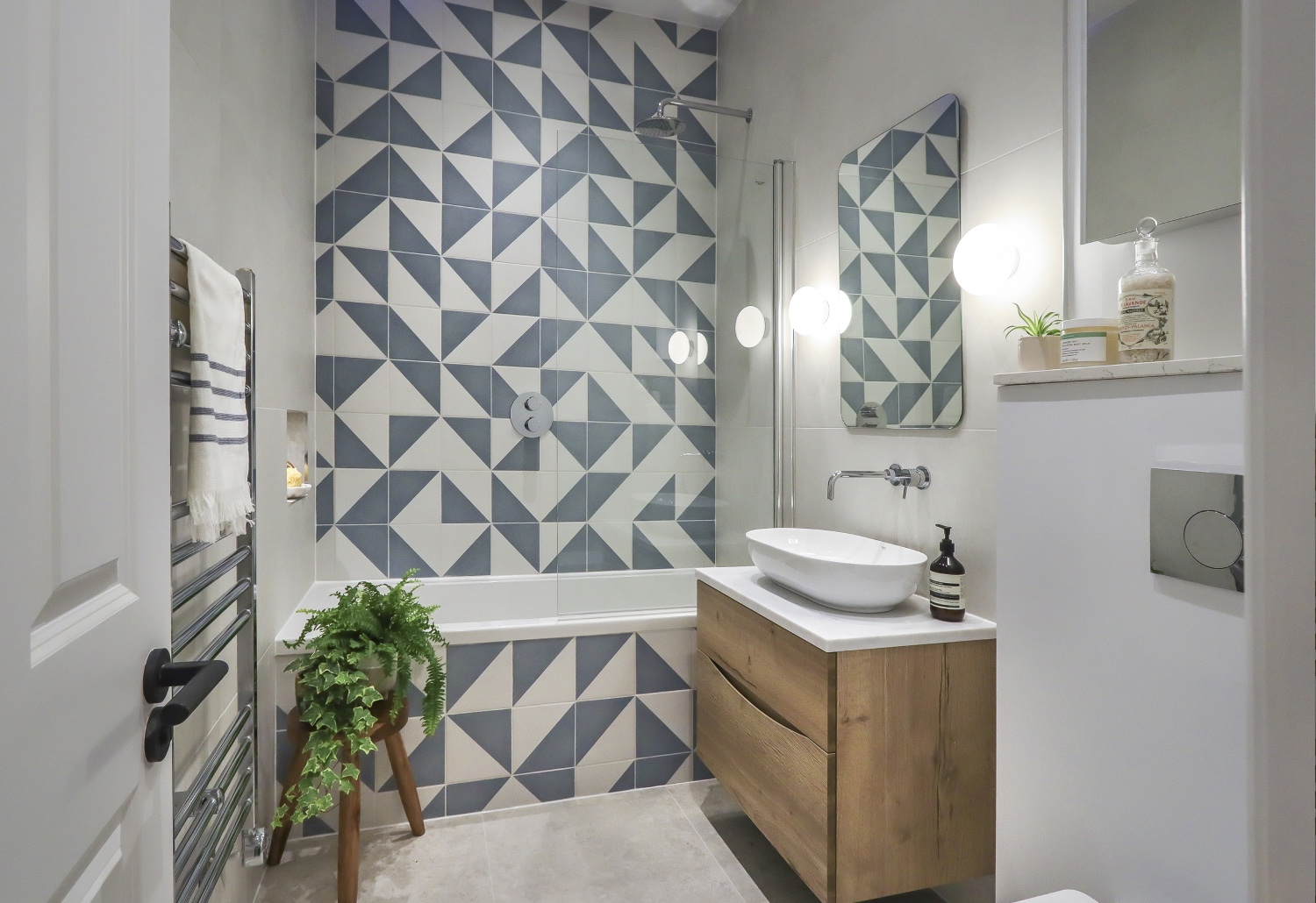 The bathrooms use a more muted palette of colours and textures, but the eclectic mix of tiles continues the character of the more colourful versions on the ground floor.
