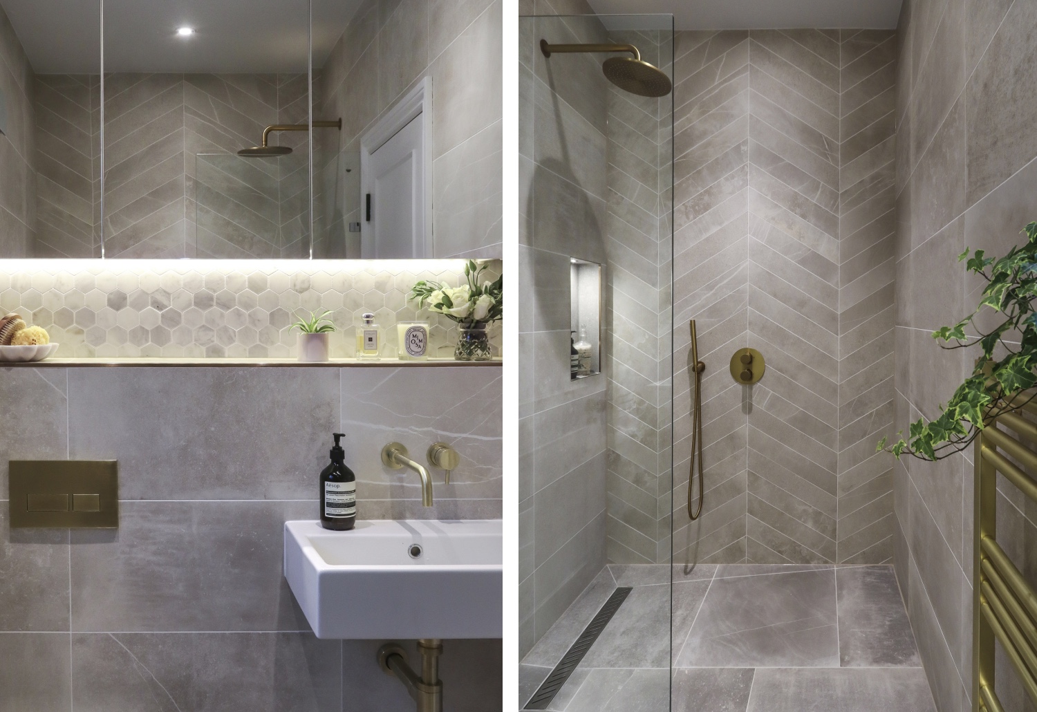 A neutral palette of materials is used throughout. Working with some of the original Victorian architectural details, grey washed timber floors, a brick feature wall, geometric windows and matt dark grey kitchen units add a contemporary feel. Each bathroom uses a different mix of eclectic tile patterns to create individual atmospheres.