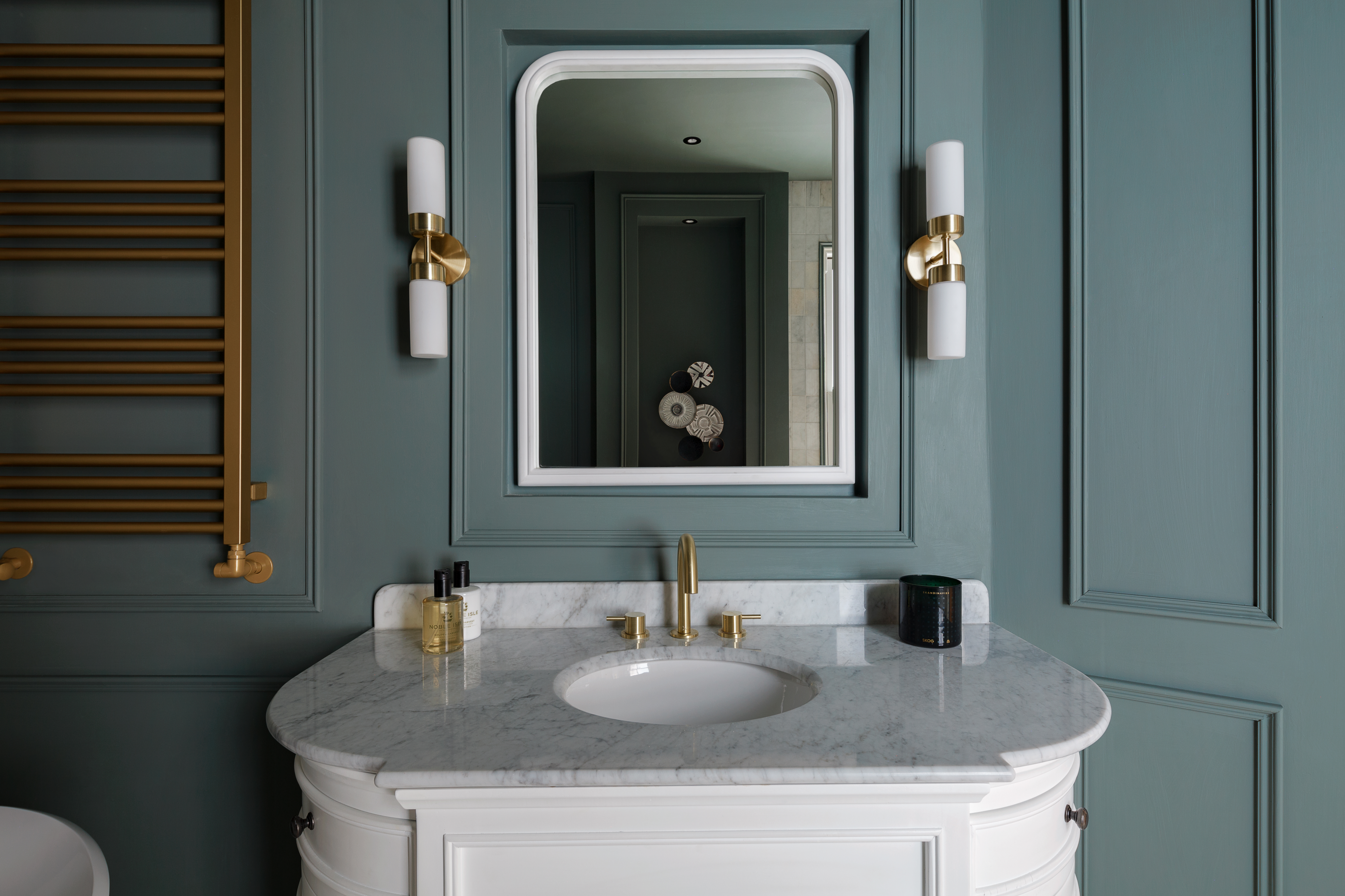 Luxurious and modern bathroom incorporates modern details within a classic Victorian style property, adding burnished brass and soft green to contrast the bright marble
