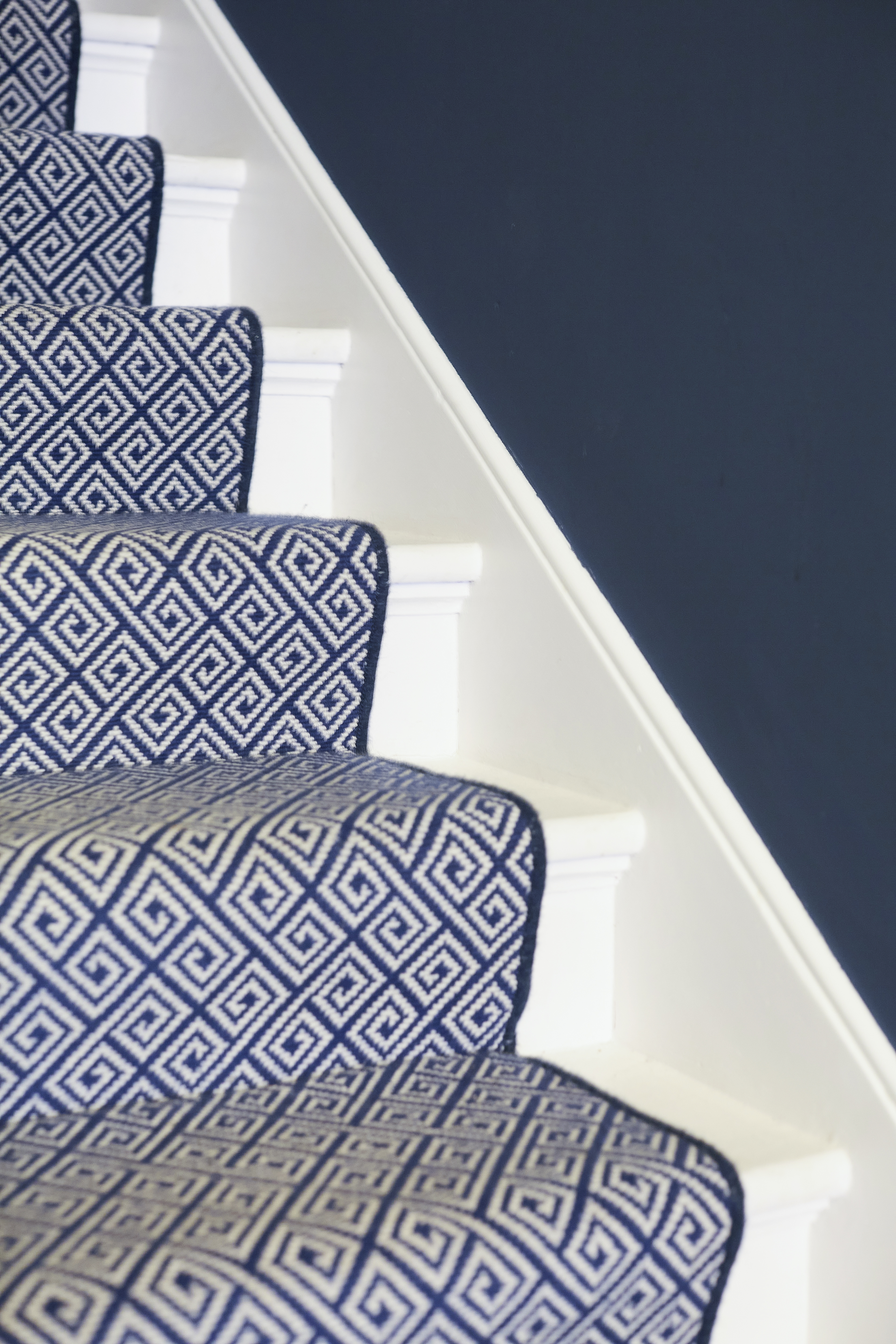 Beautifully patterned stair runner chosen to perfectly match the wall paint and steps
