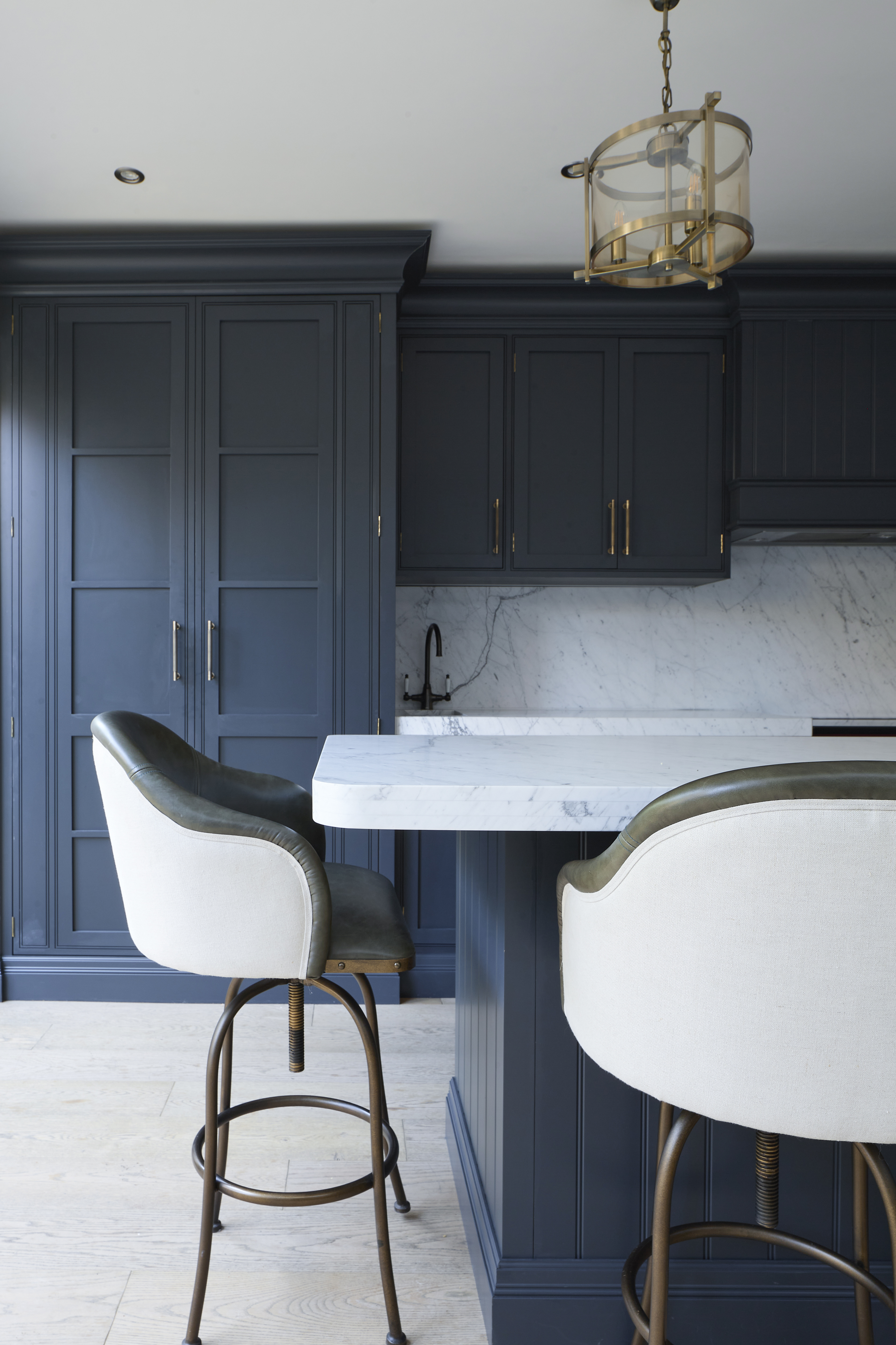 This kitchen's bespoke step-in pantry was designed to the client's precise storage requirements, from the batwing doors to the marble countertop