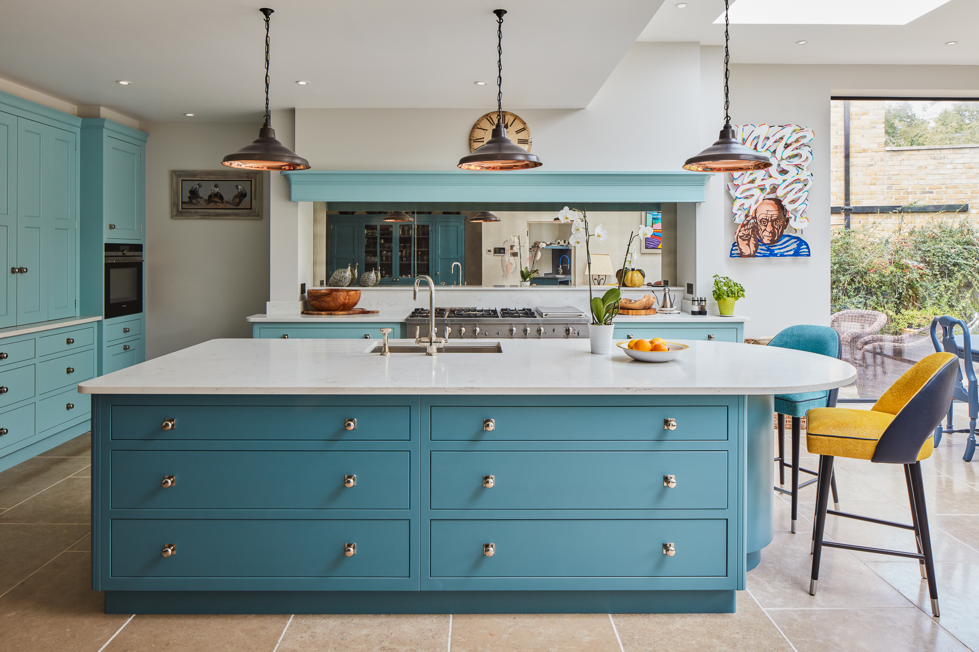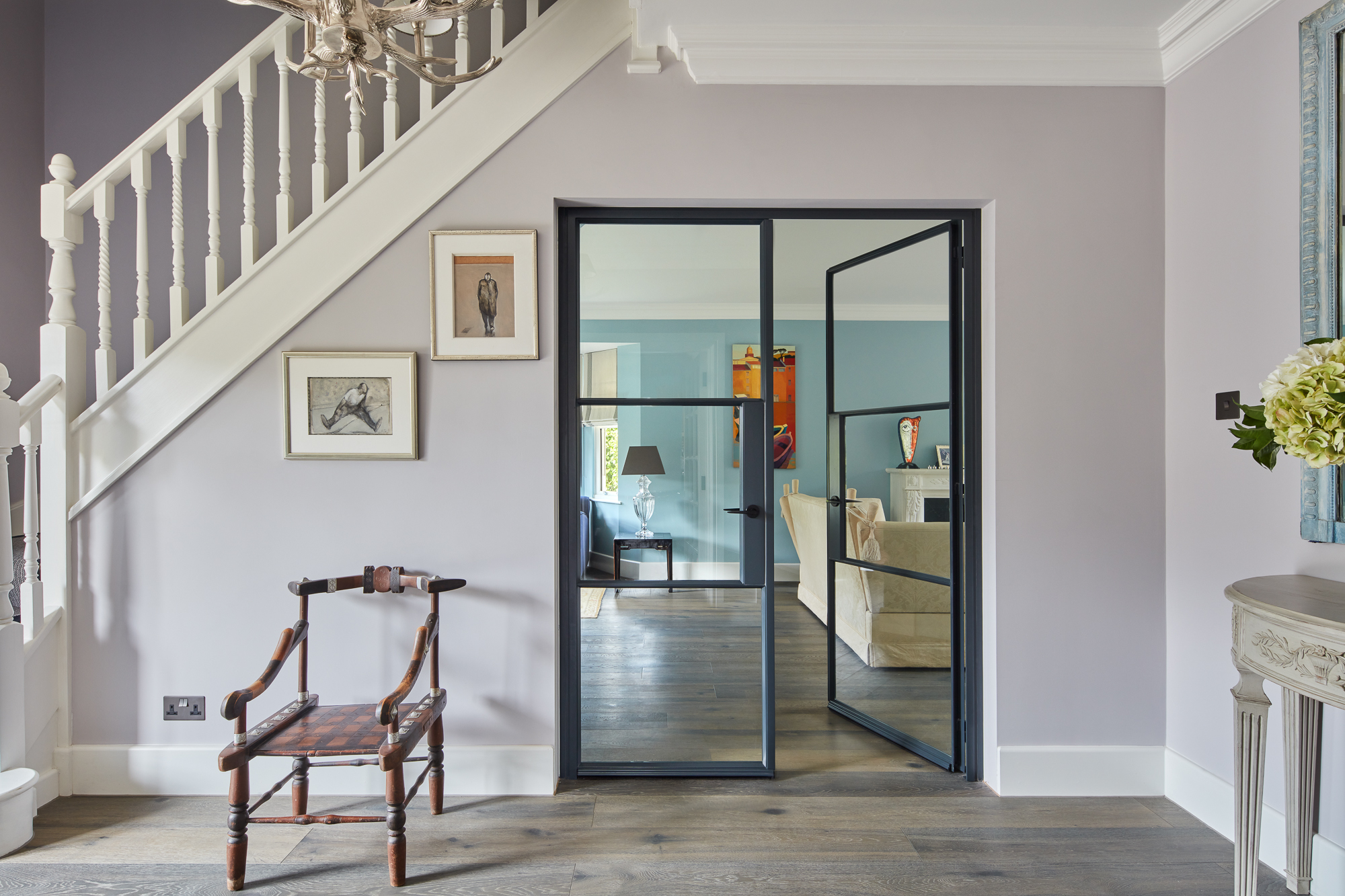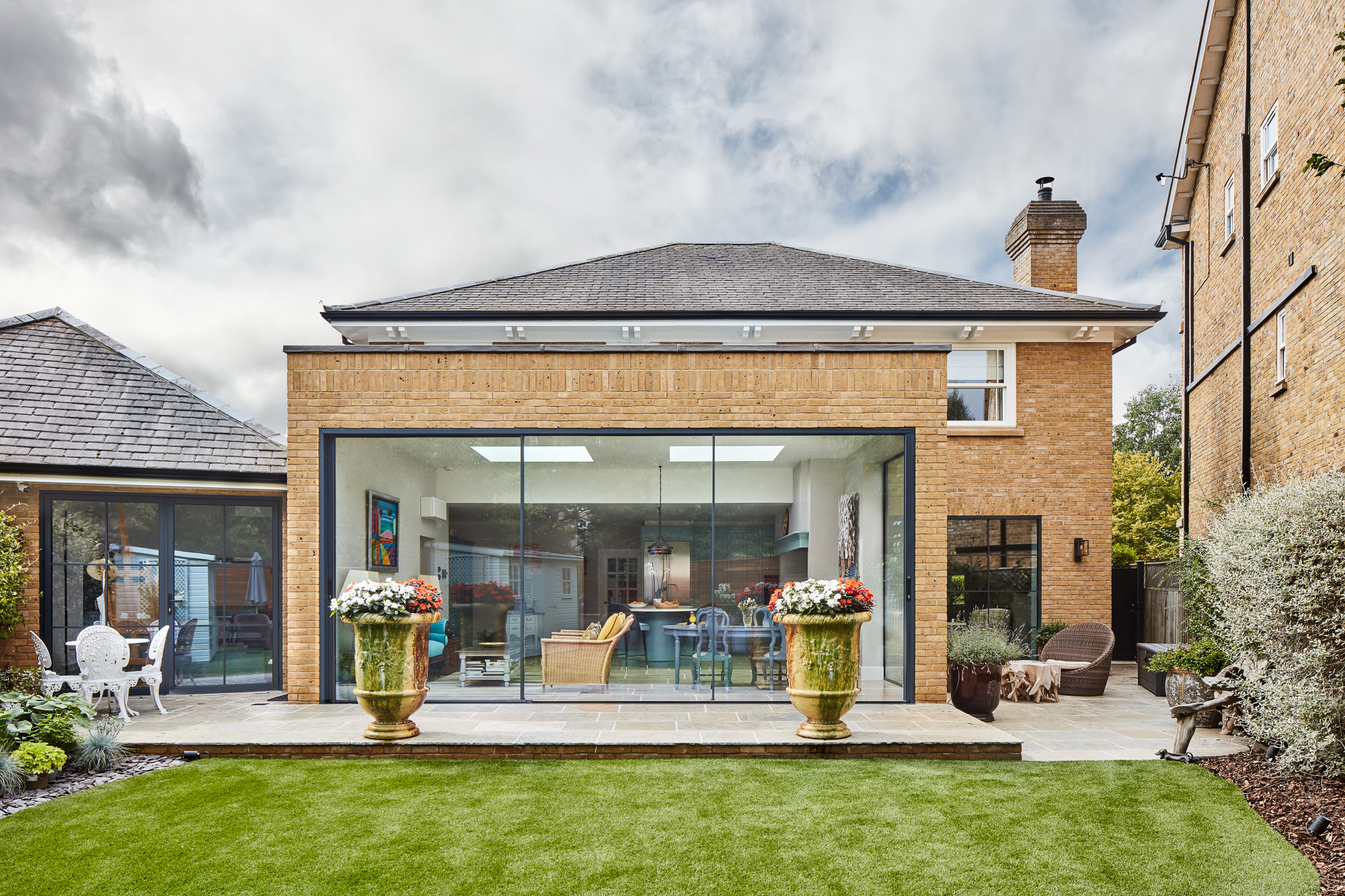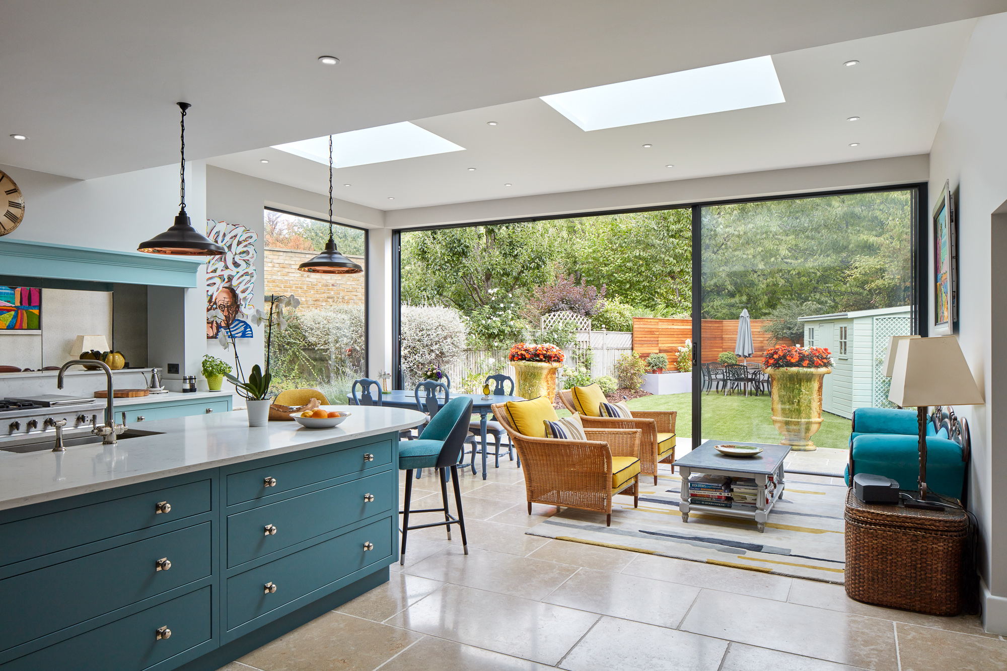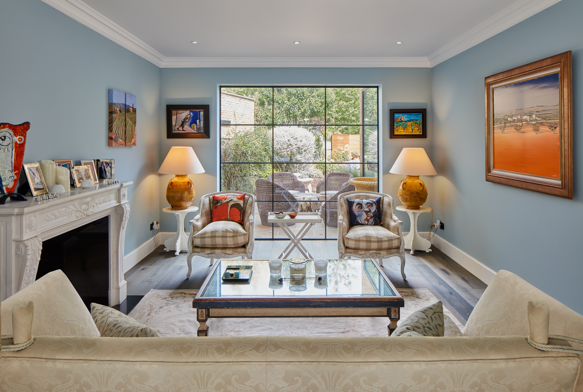 In this house we were able to significantly increase the usable living space with a sizable kitchen extension, and by converting the existing garage into an artist’s studio. We pulled light through the whole house using full width glazed doors and skylights in the kitchen and studio, and an oversized picture window in the living room to maximise views of the garden. We also replaced solid internal doors with glazing to improve light and flow through the house. Glazing was minimal framed aluminium to maximise thermal efficiency, with steel-look glazing bars added for character.