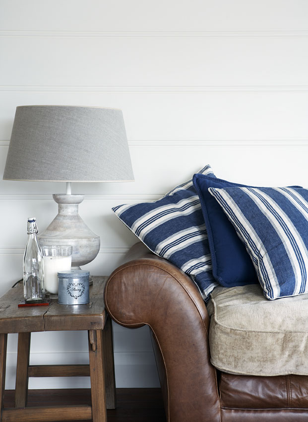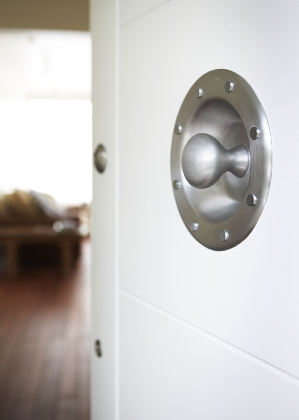 This 1st floor apartment within a 1960s block of flats overlooking the river was in need of a total refurbishment. The theme of the interiors was to follow the Client’s love of all things nautical, with clever nods to the theme evident throughout the entire apartment. The walls were cladded with ship lacquered boarding and a teak floor was installed to create the feeling of the deck of a boat. Bespoke storage was built to house the Client’s media with quirky portholes added. An eclectic mix of furniture and upholstery were selected to compliment the theme, from an aged leather sofa scattered with nautical striped cushions to a quirky union jack print deck chair, rounded off with handmade Philip Watts door handles.