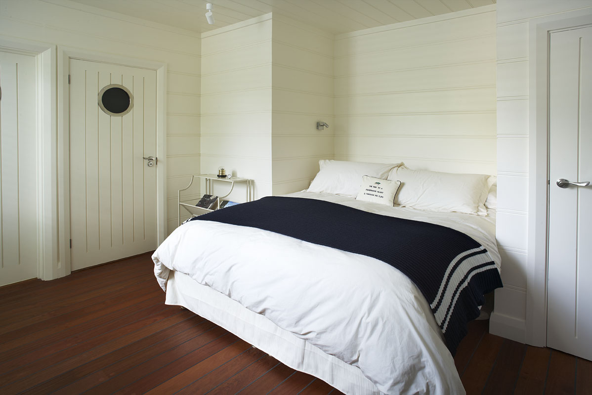 The ship lacquered boarding and teak flooring continues through to the bedrooms which are complimented by the navy blue and white colour palette.