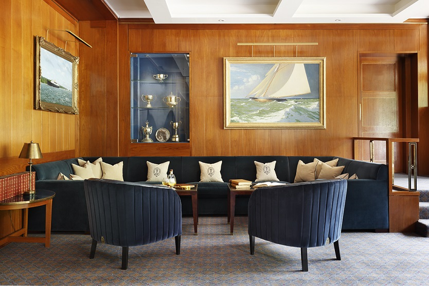 We were privileged to be asked to re-design The Britannia Bar in The Royal Thames Yacht Club. Overlooking Hyde Park, this centrally located clubhouse in Knightsbridge is the oldest continuously operating yacht club in the world. Velvet and leather upholstered seating in sumptuous navy blues and deep reds work together with brass finishes creating a sophisticated and elegant interior. The finish is a timeless space for the club’s members to relax and socialise.