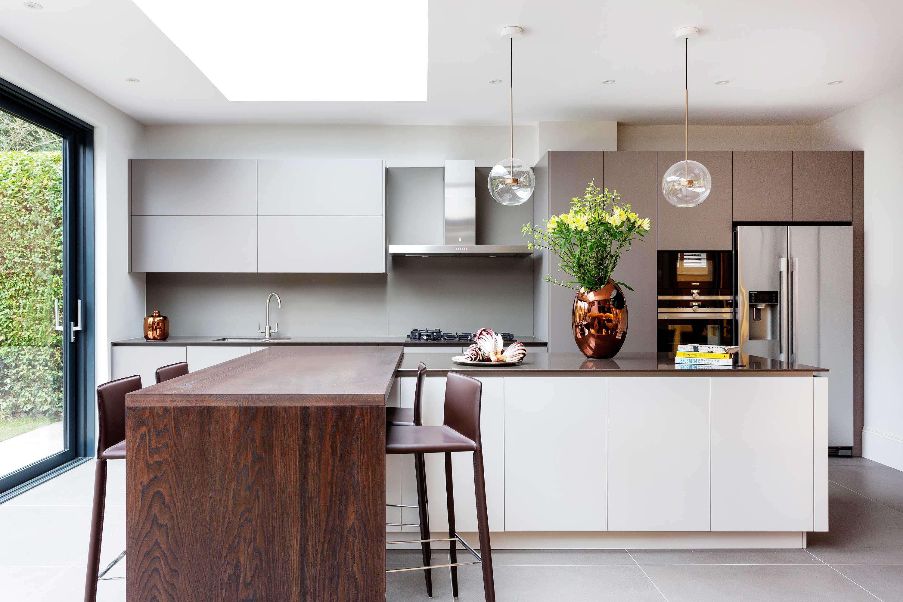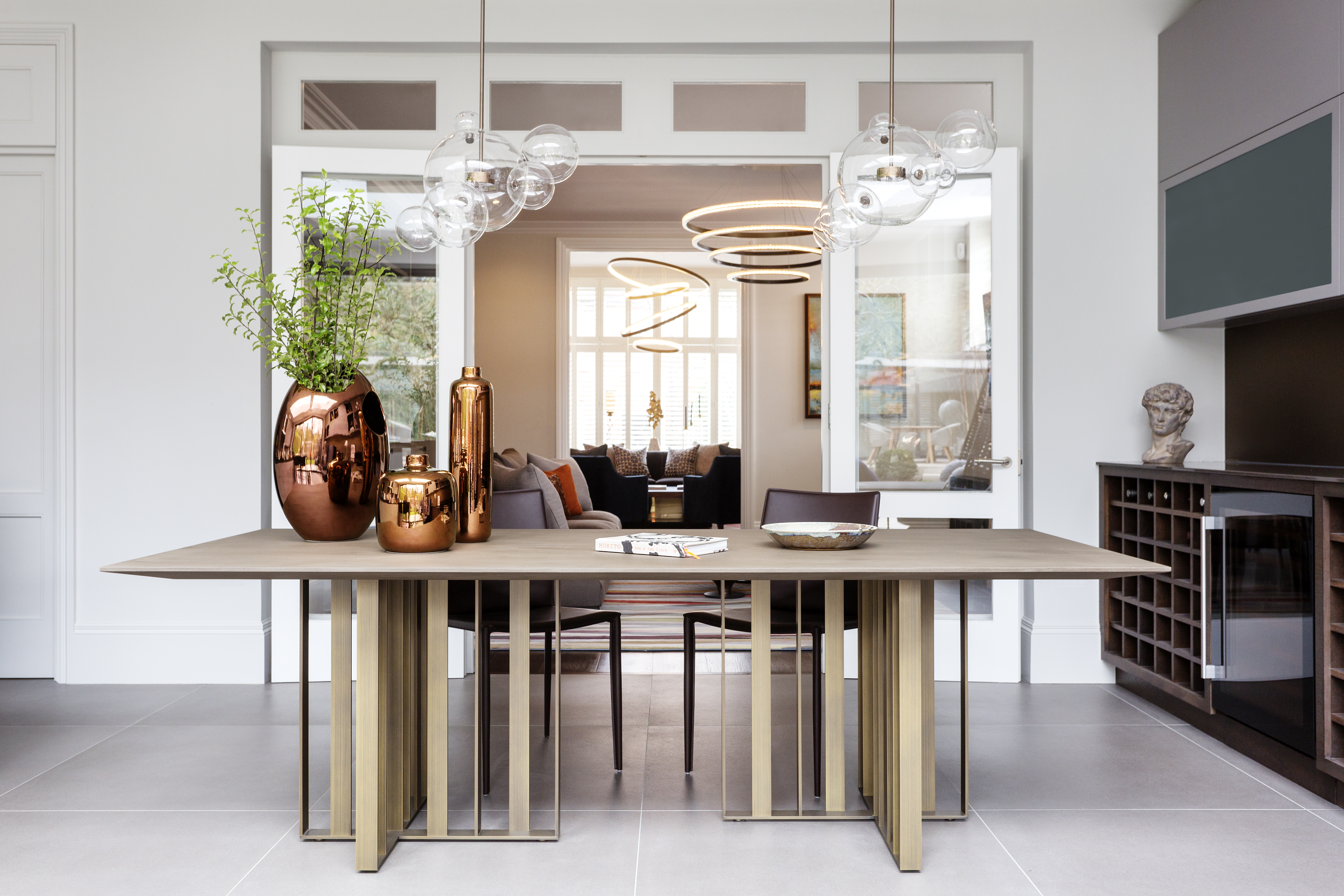 Dramatic lighting was also key, so we selected two coordinating sculptural hoop pendants and multiple spherical glass lights which were hung throughout the interconnecting rooms. The dark walnut veneer & satin smooth cappuccino spray-painted units of the kitchen are given extra depth by the contrasting bronze steel splashbacks. The unique dining room bar joinery design is stylish, contemporary and warm. Upstairs the master bedroom headboard spans the entire wall and opposite a 3D feature wall conceals the TV. In the bathroom we went for a modern luxury spa feel with a deep oval bath and design-led brassware. The finale was the impressive office which was opened into the eaves above a mezzanine level with a spectacular double-height wenge bookcase with bronze railings and ladder as a feature. The overall effect is of a contemporary, sleek family home where every room is enjoyed to the max. Thanks to HUX for the fabulous kitchen, panelling and joinery throughout.