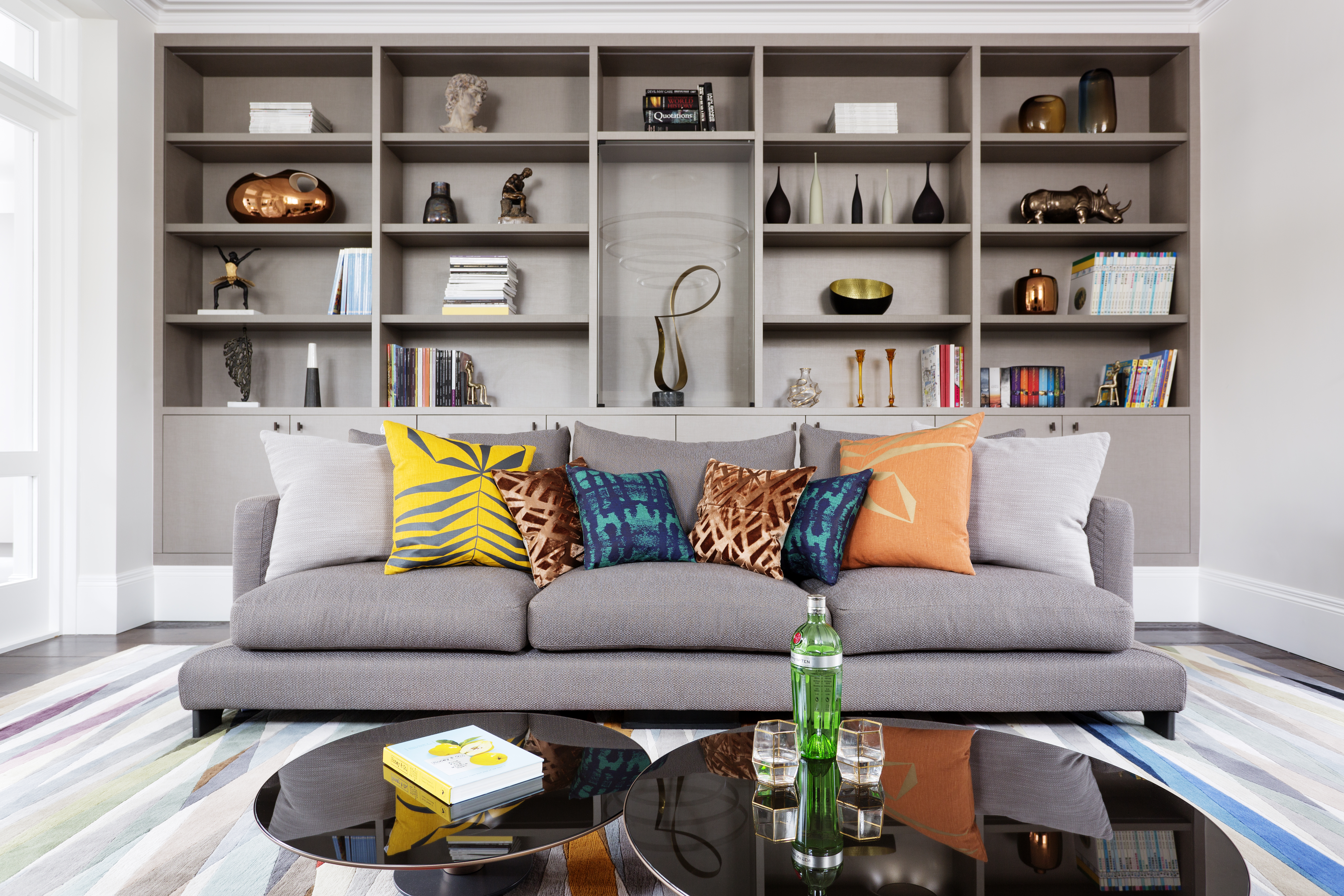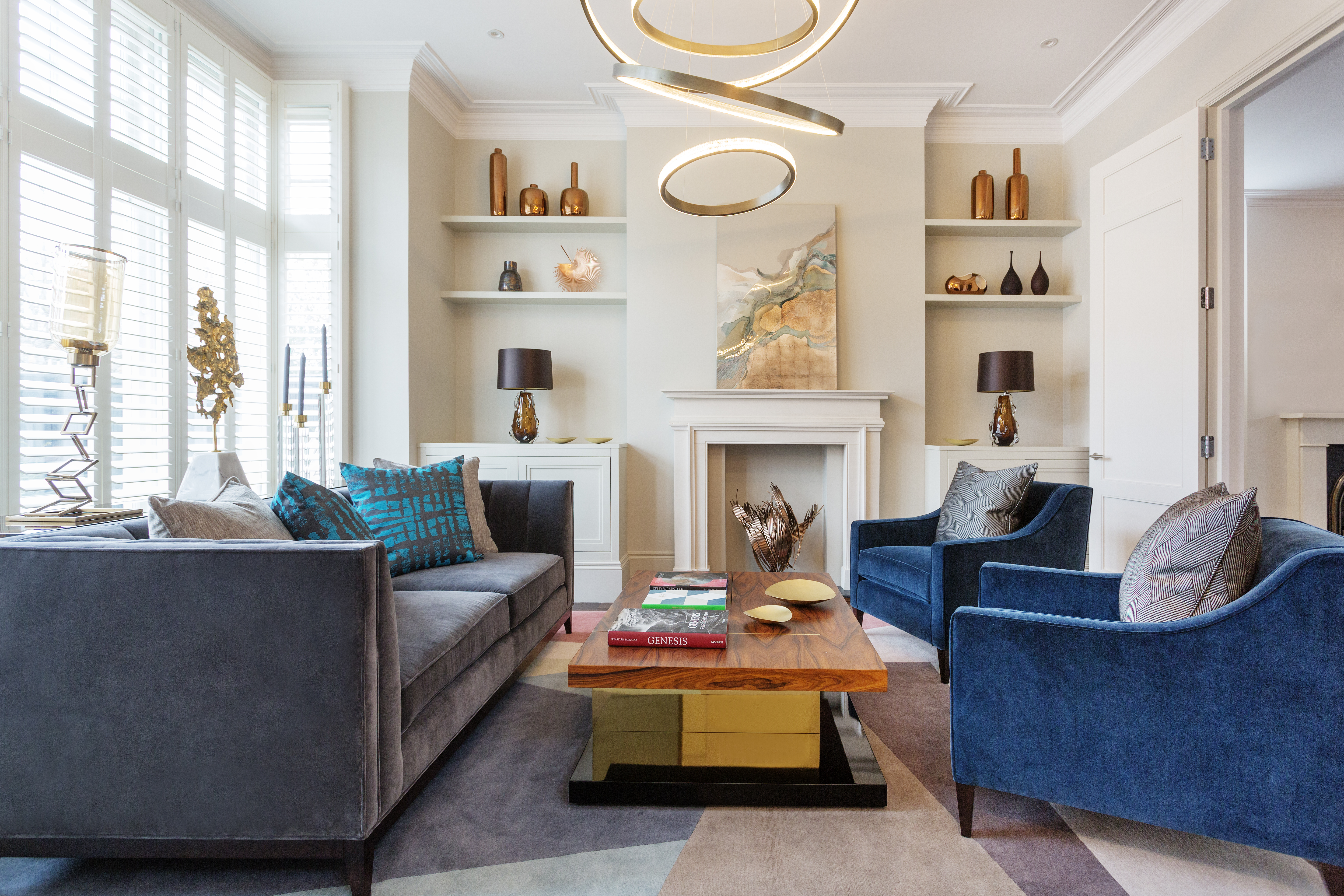 The brief was to transform a dark five-bedroom Edwardian detached house into a colourful, light free-flowing family home. Everything started with the design of the main family room / kitchen. We removed a corridor from the hall to kitchen and designed three sets of double doors for inter-connecting rooms to link the social spaces of the ground floor. A large glass panelled double door connects the kitchen to the generous snug with a wall-to-wall bespoke bookcase. Our inspiration was Modern British design, with a timeless feel. Our clients fell in love with the colourful Paul Smith rugs, so that set the tone for the rest of the scheme as we were able to pull out those colours in the furniture and accessories.