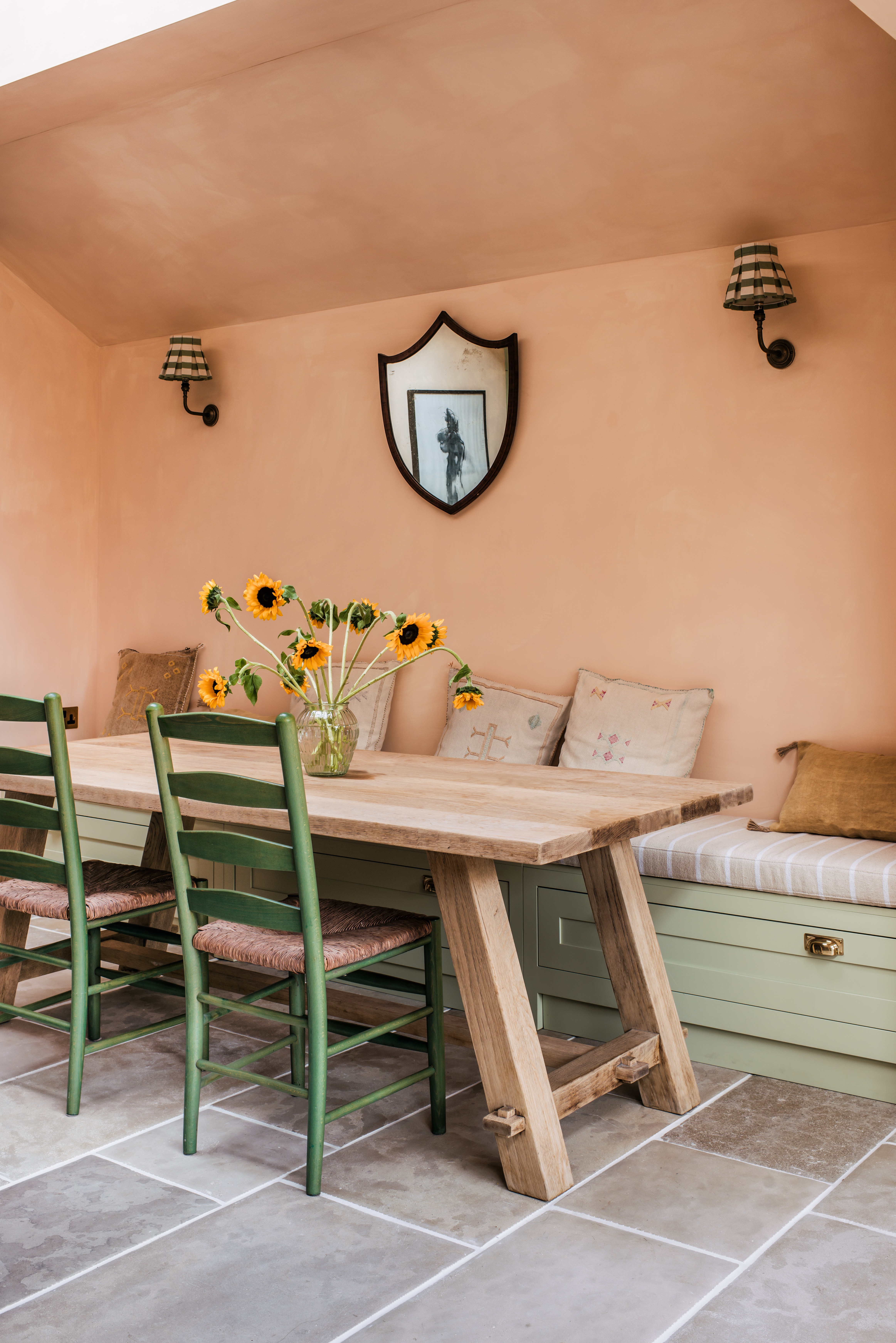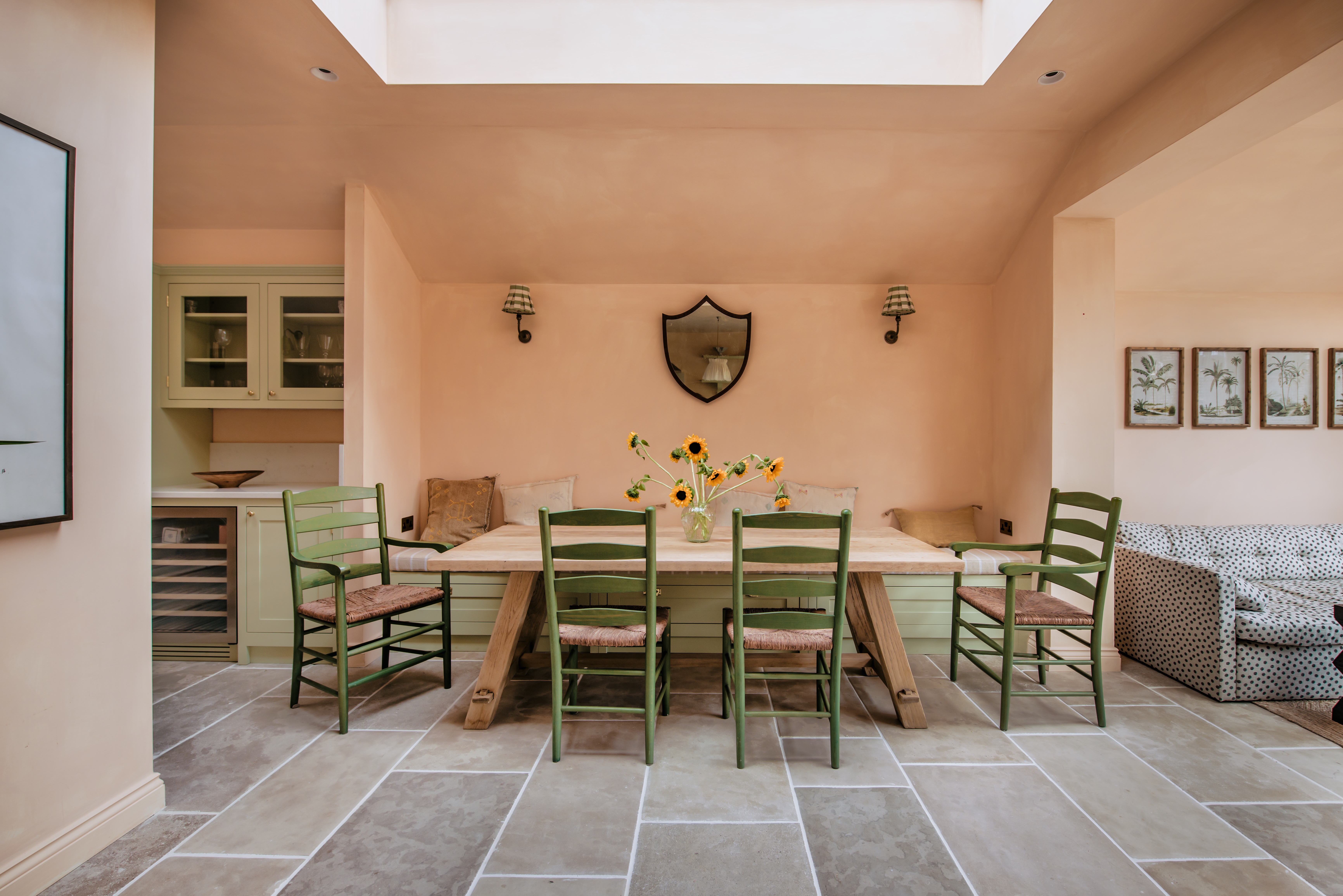 Bright palette modern extension in Victorian townhouse set over two floors. Douglas Fir floorboards with linen & boucle and lime-washed walls with antique limestone slabs.