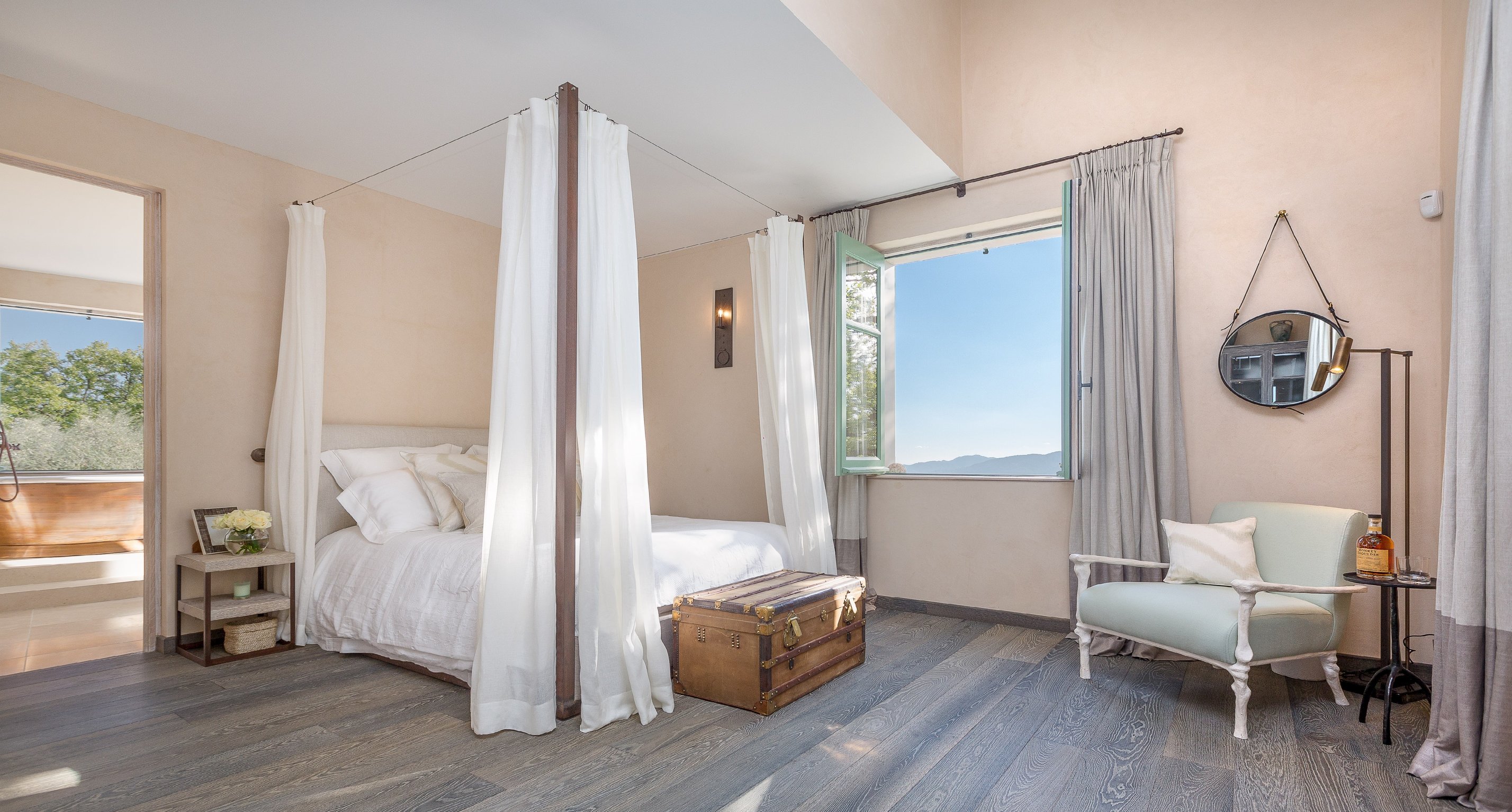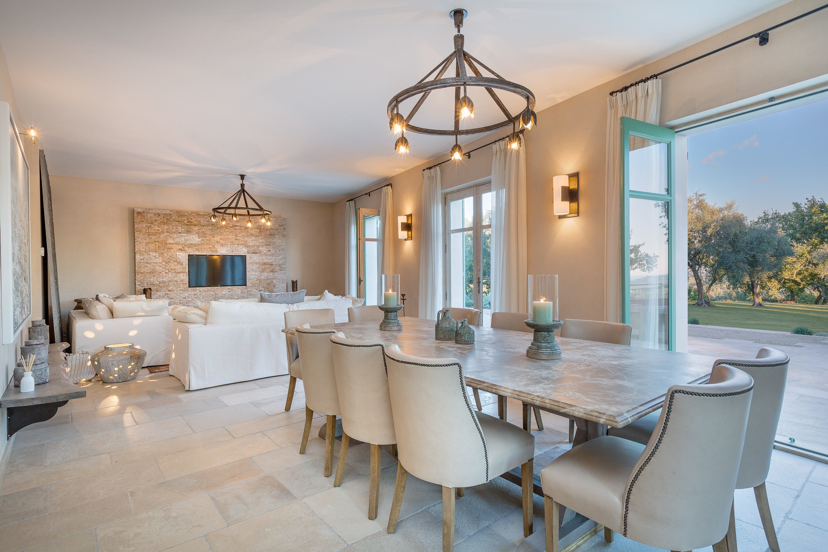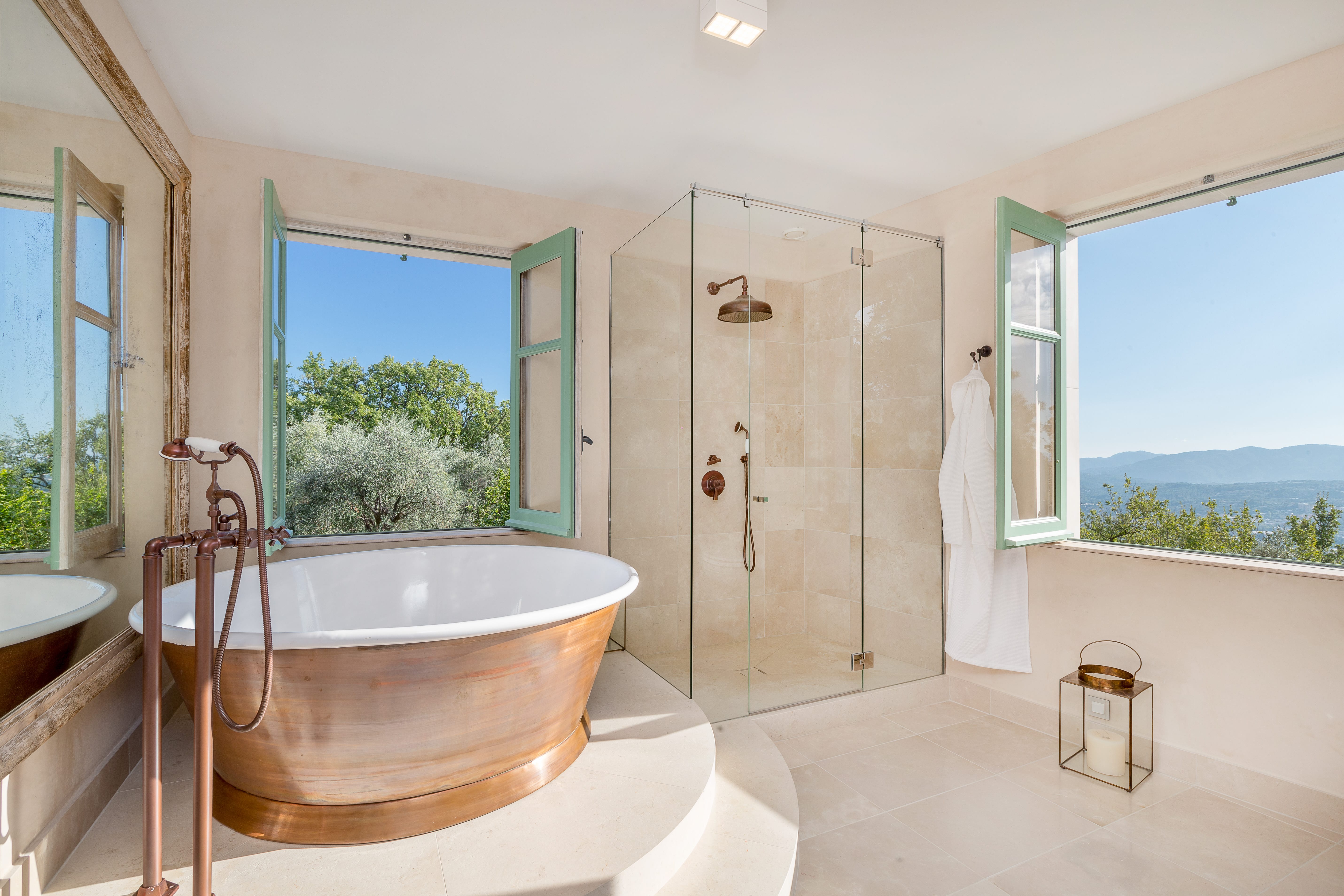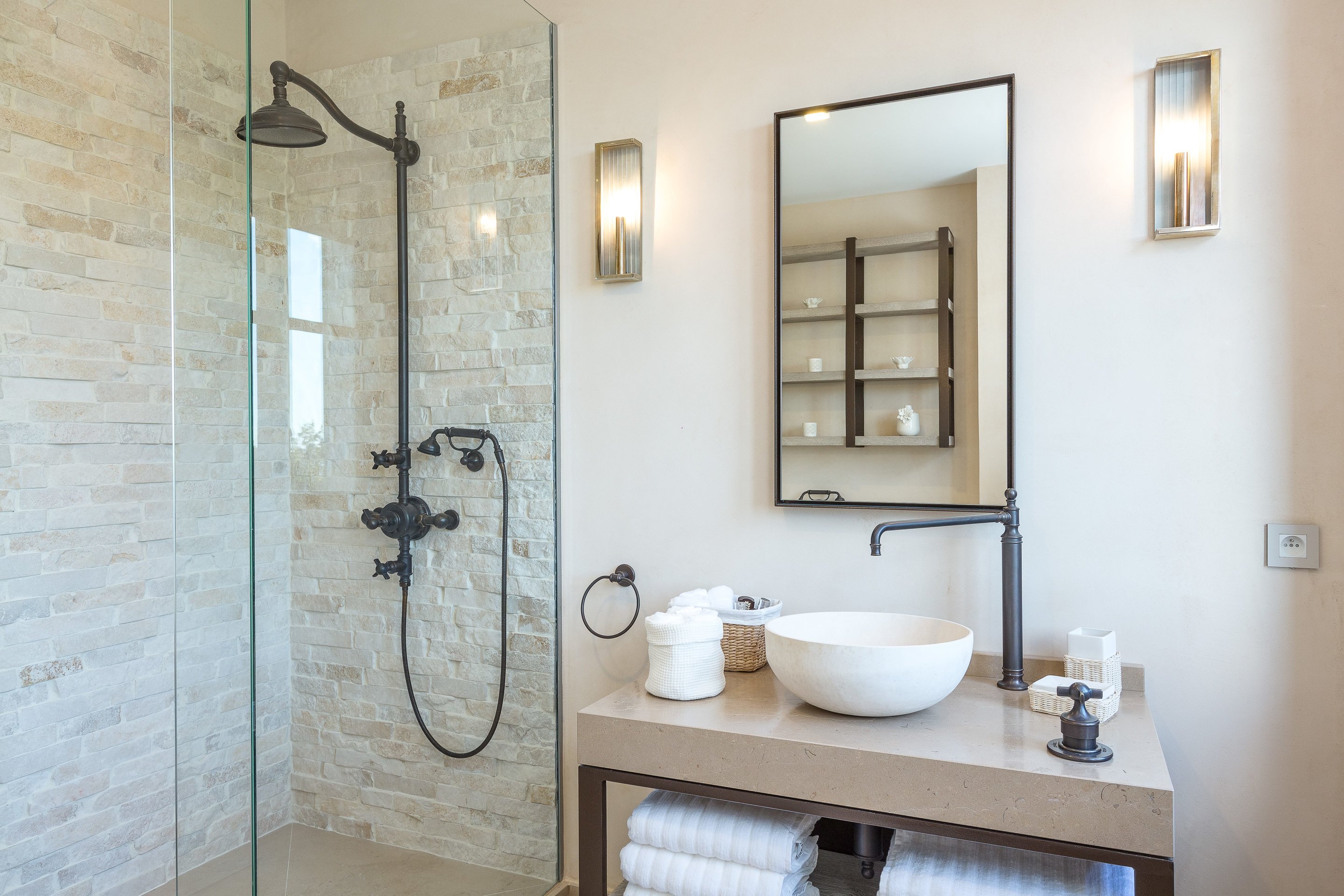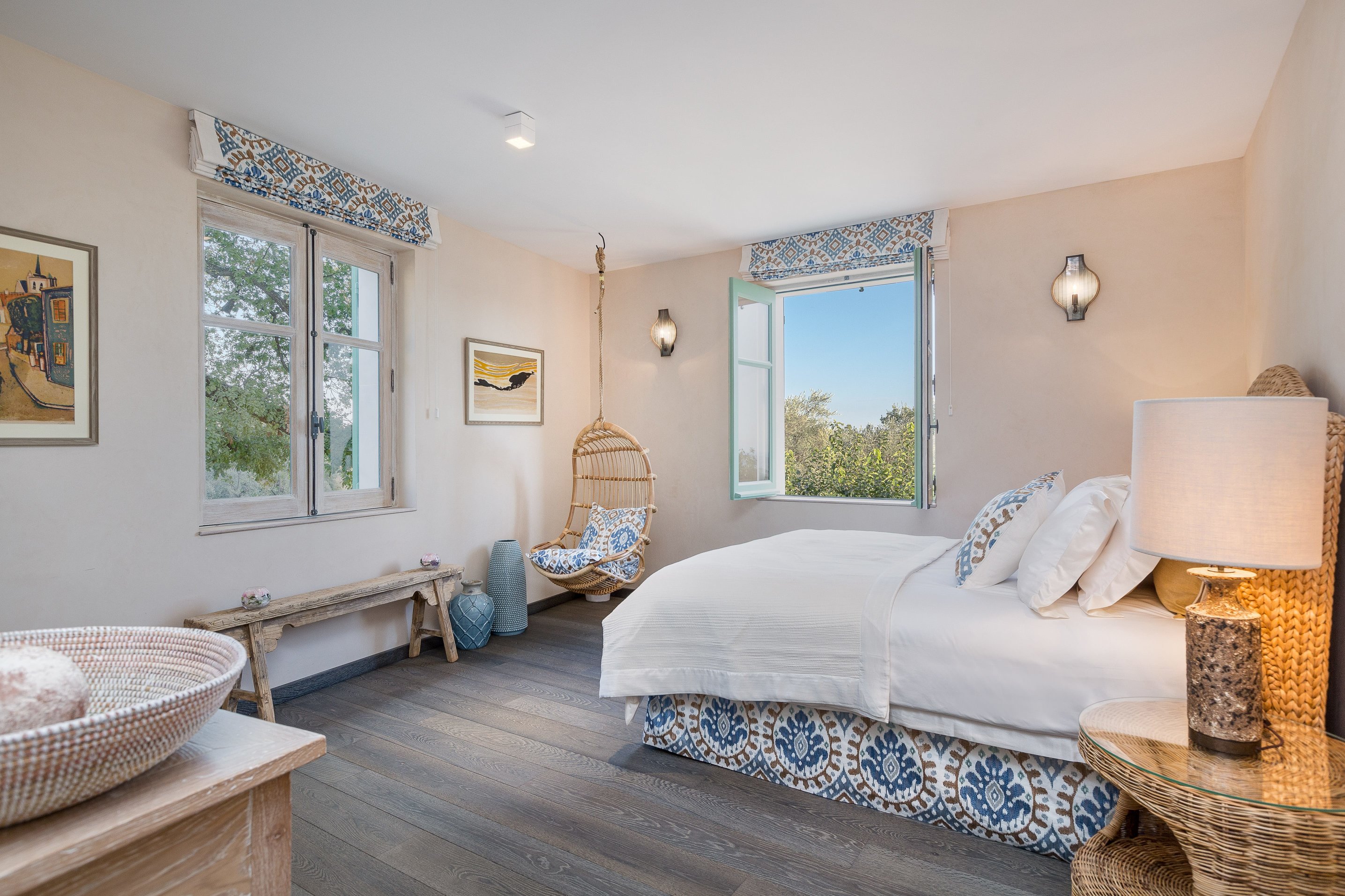 This property was given an eclectic modern-rustic theme in a restrained colour palette. Contemporary Art sourced from Local French Riviera galleries were mixed with Contemporary and antique 20th Century furniture from Eric Schmitt, Jacques Adnet, Alexandre Loge amongst others.
