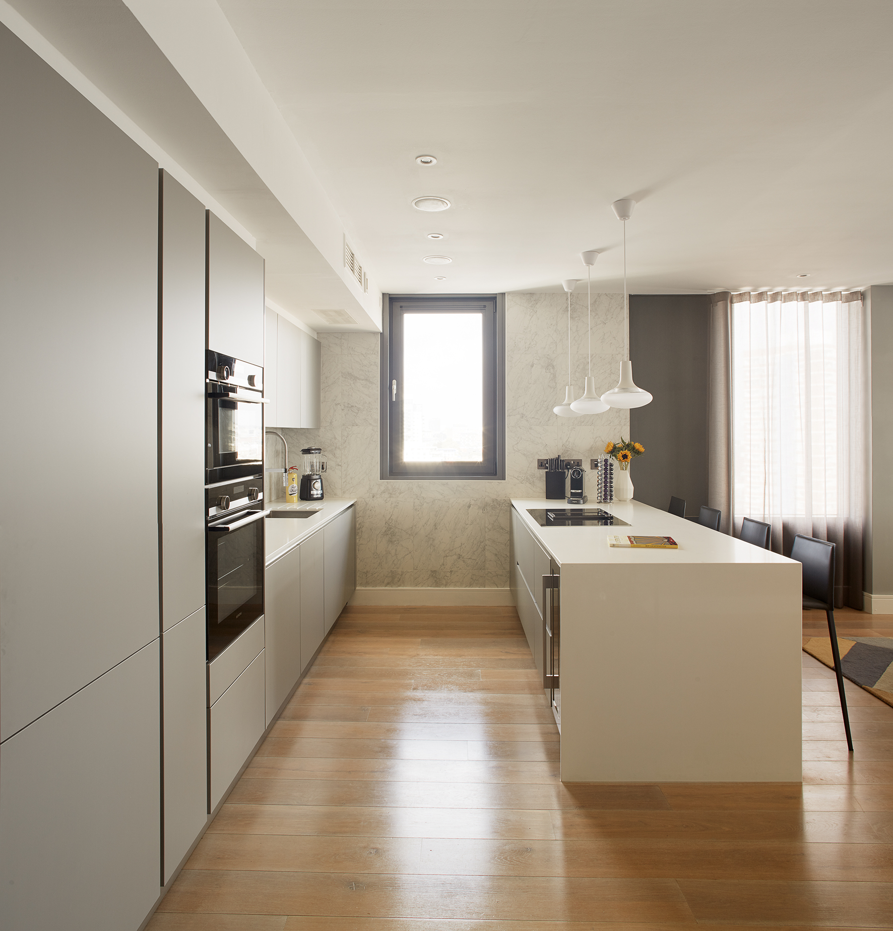 Our client bought this property a couple of years ago. The interior remained? mid-2000 when it was built. The awkward layout was the result of subdivision of a 2 storey penthouse apartment. The narrow kitchen was completely separated from the rest of the apartment, the living room had an unusable nook and the master bedroom had 2 small tiny ensuites. We concentrated on addressing these areas first. We created an open plan kitchen/dining/living room, private study and master ensuite with freestanding bath and double shower.