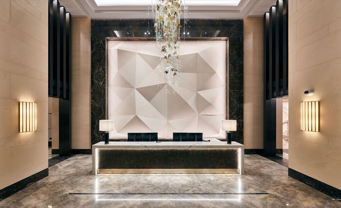 Special solutions were required for wall washing the faceted feature wall in the entrance and foyer, supplemented by sleek Linear LED Ledline lighting for the reception desk façade.
